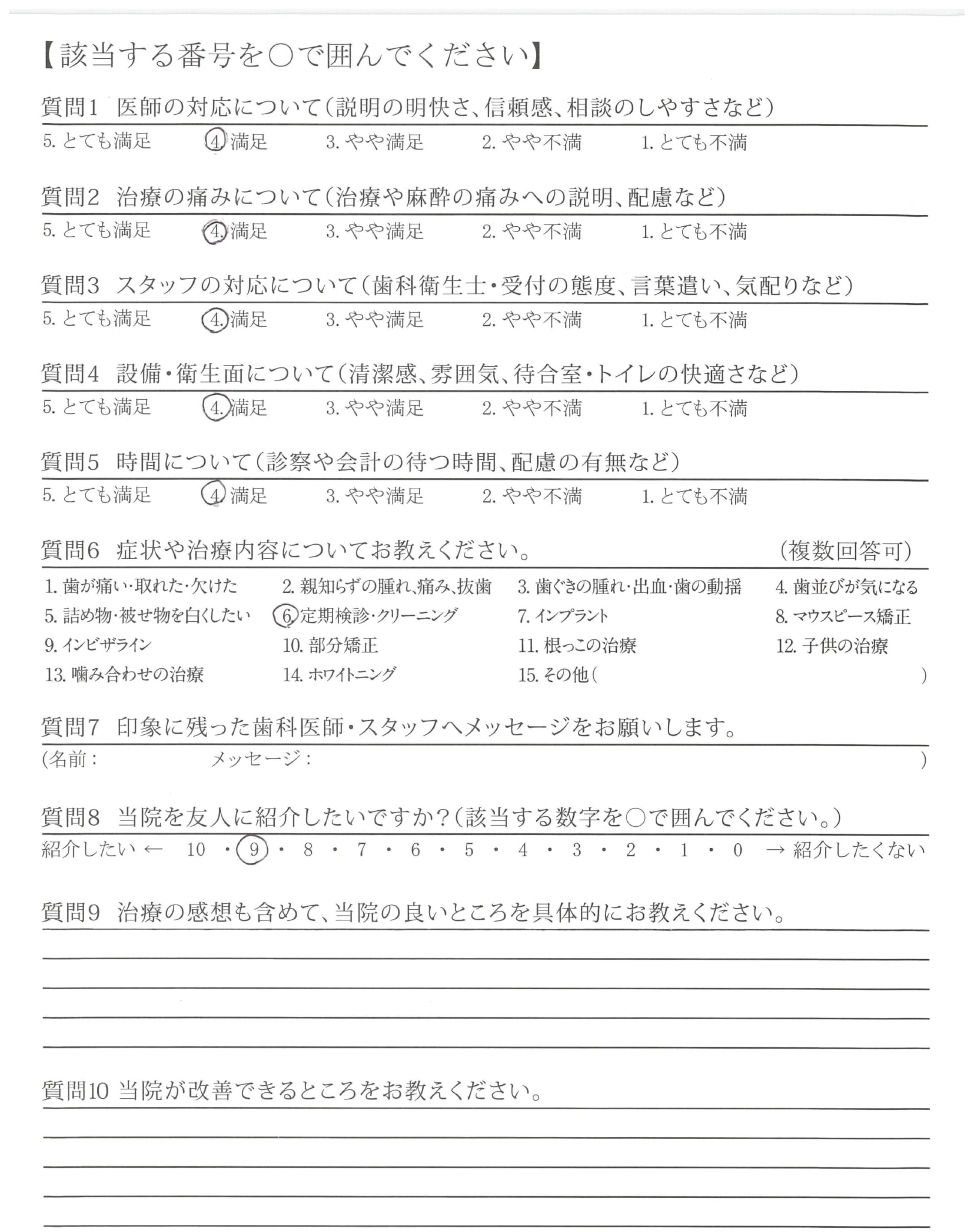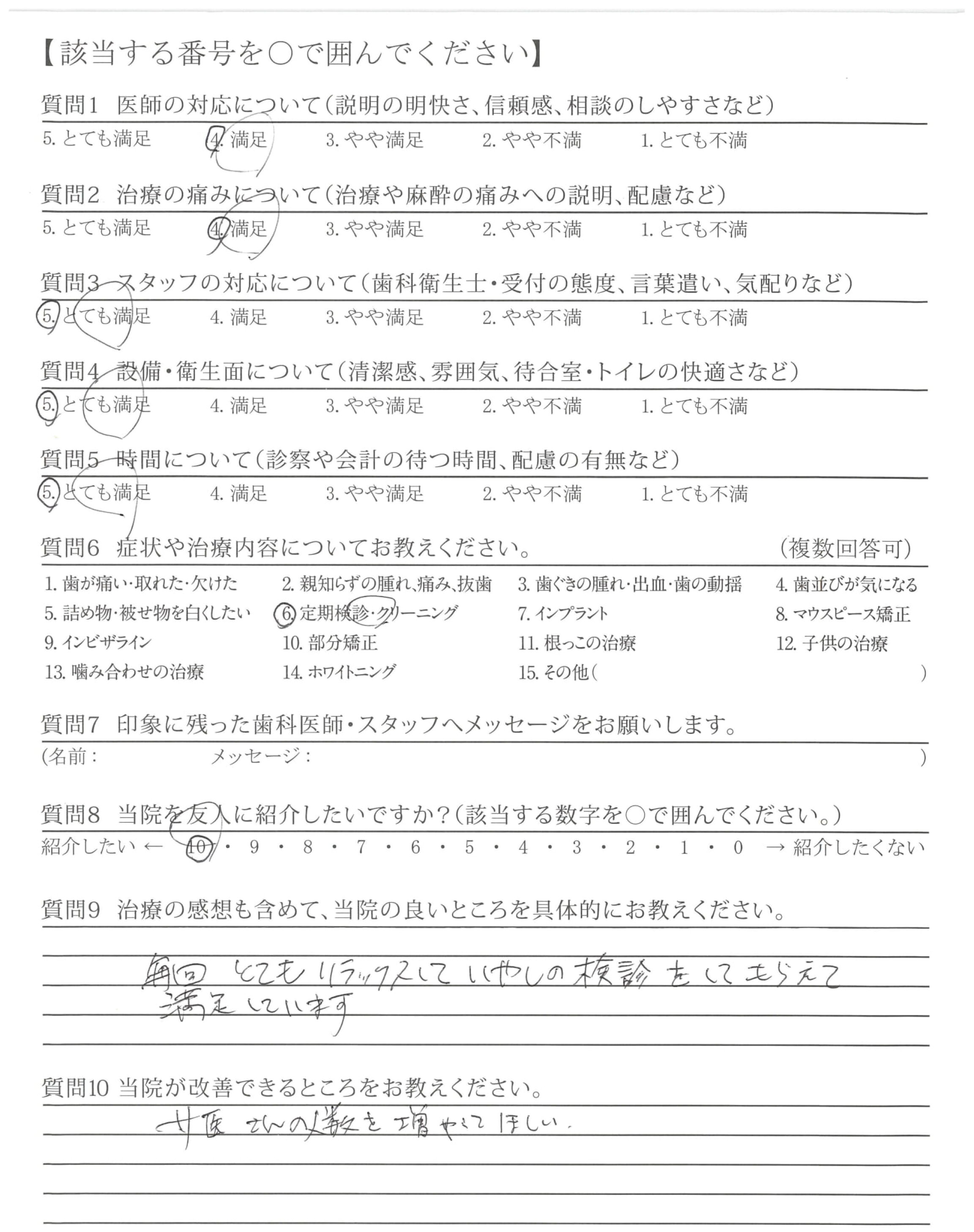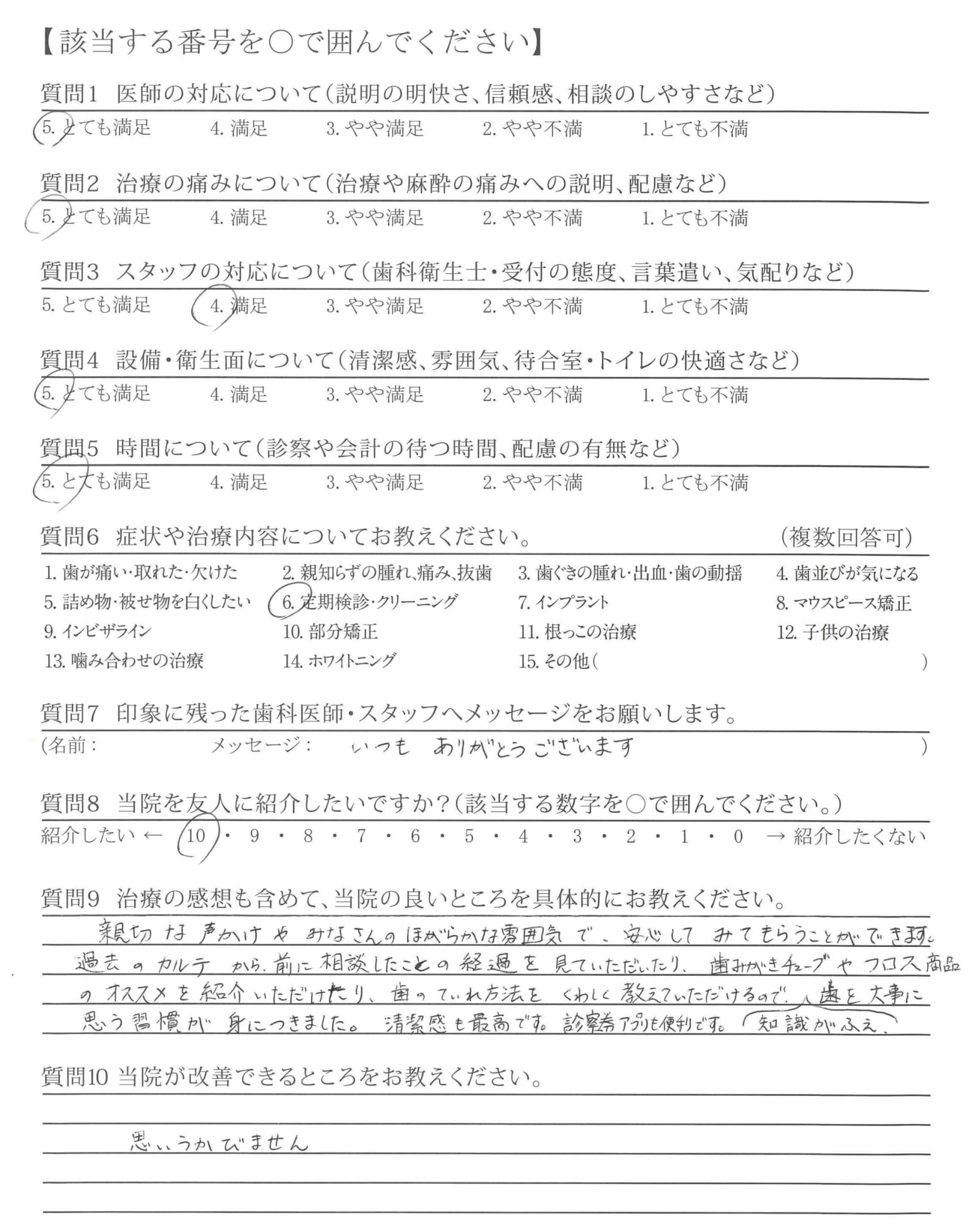 過去のカルテから、前に相談したことの経過を見てただいたり、歯みがきチューブやフロス商品のオススメを紹介いただけたり、歯のていれ方法をくわしく教えていただけるので、知識がふえ歯を大事に思う習慣が身につきました。