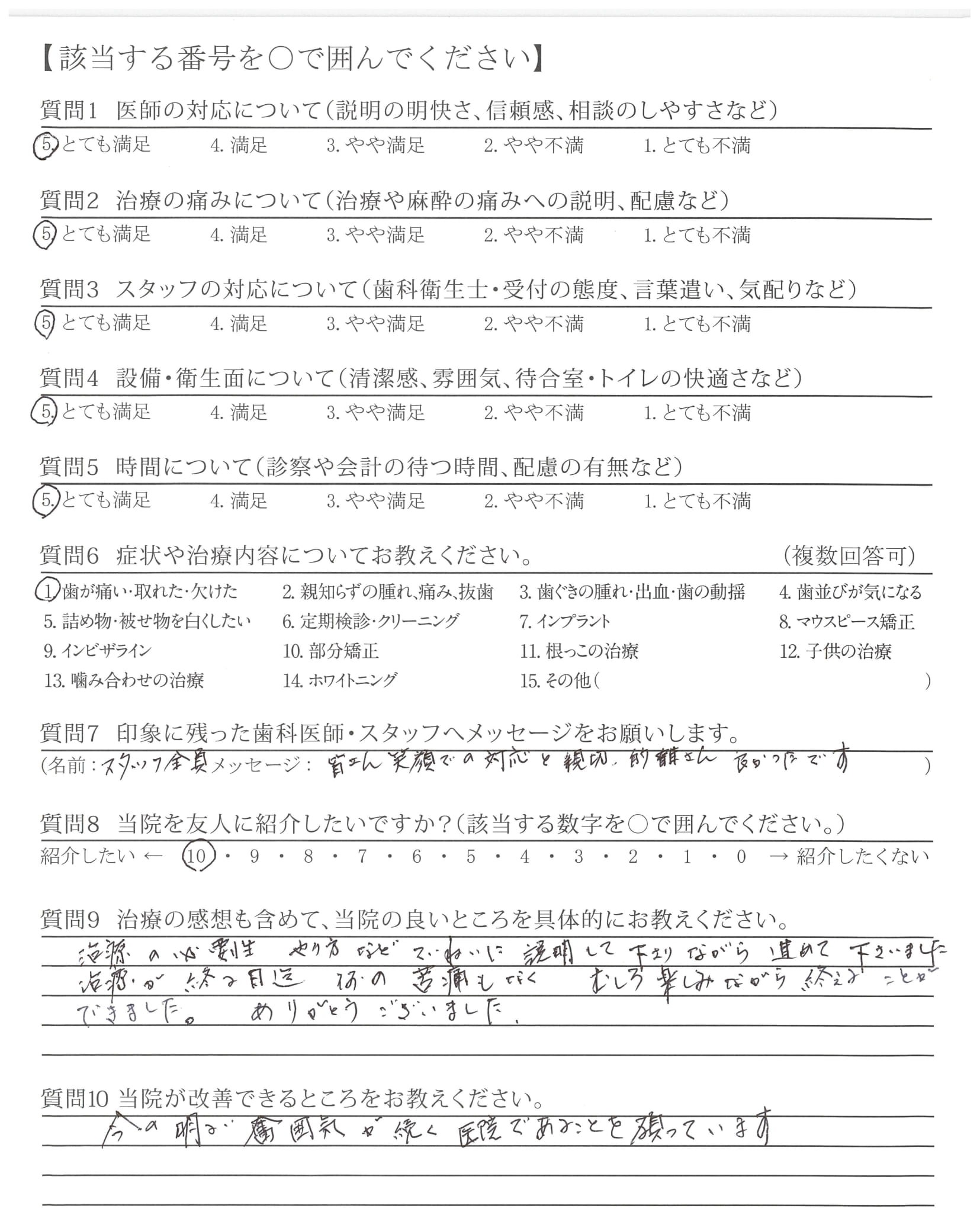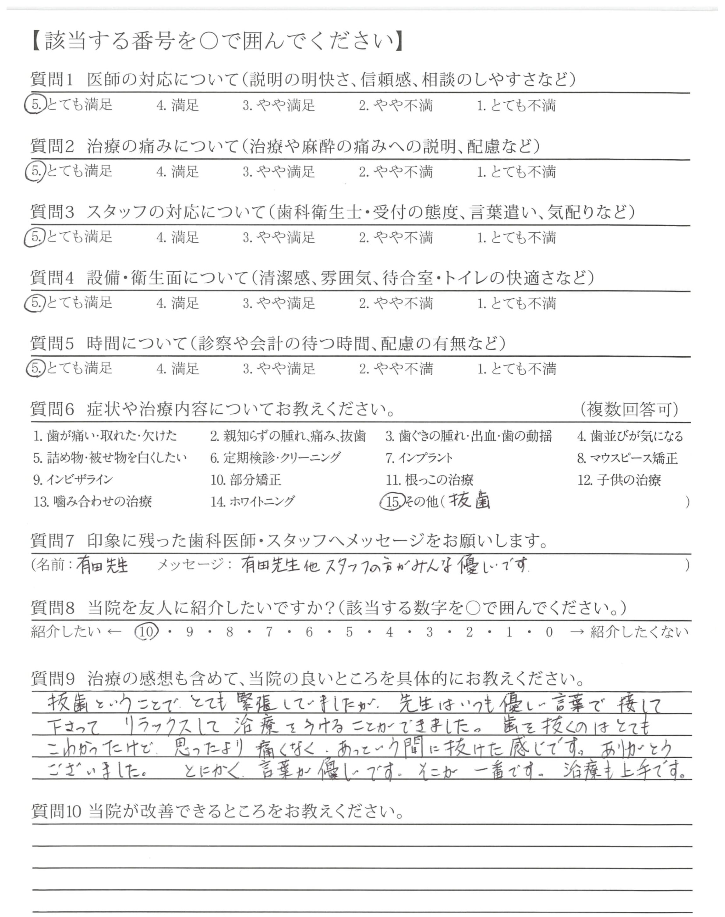 抜歯ということでとても緊張していましたが、先生はいつも優しい言葉で接して下さってリラックスして治療をうけることができました。