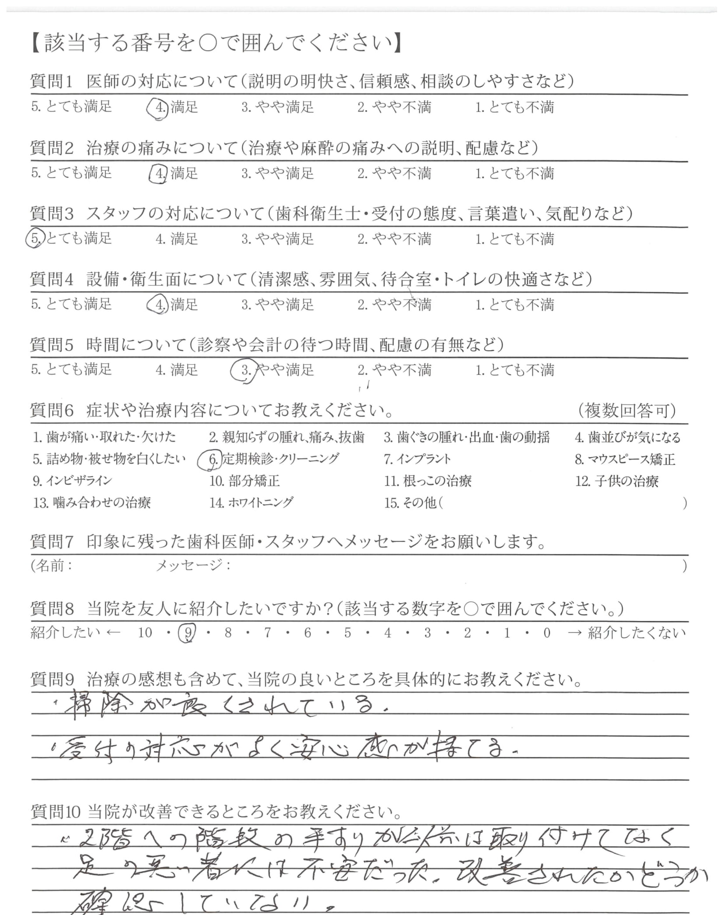 急遽歯が欠けたのでお願いしました。久しぶりの歯医者で不安もありましたが、丁寧なカウンセリング、治療や清潔な院内で安心して治療を受けることができました。その後の定期検診でもきれいにして頂き感謝しています。