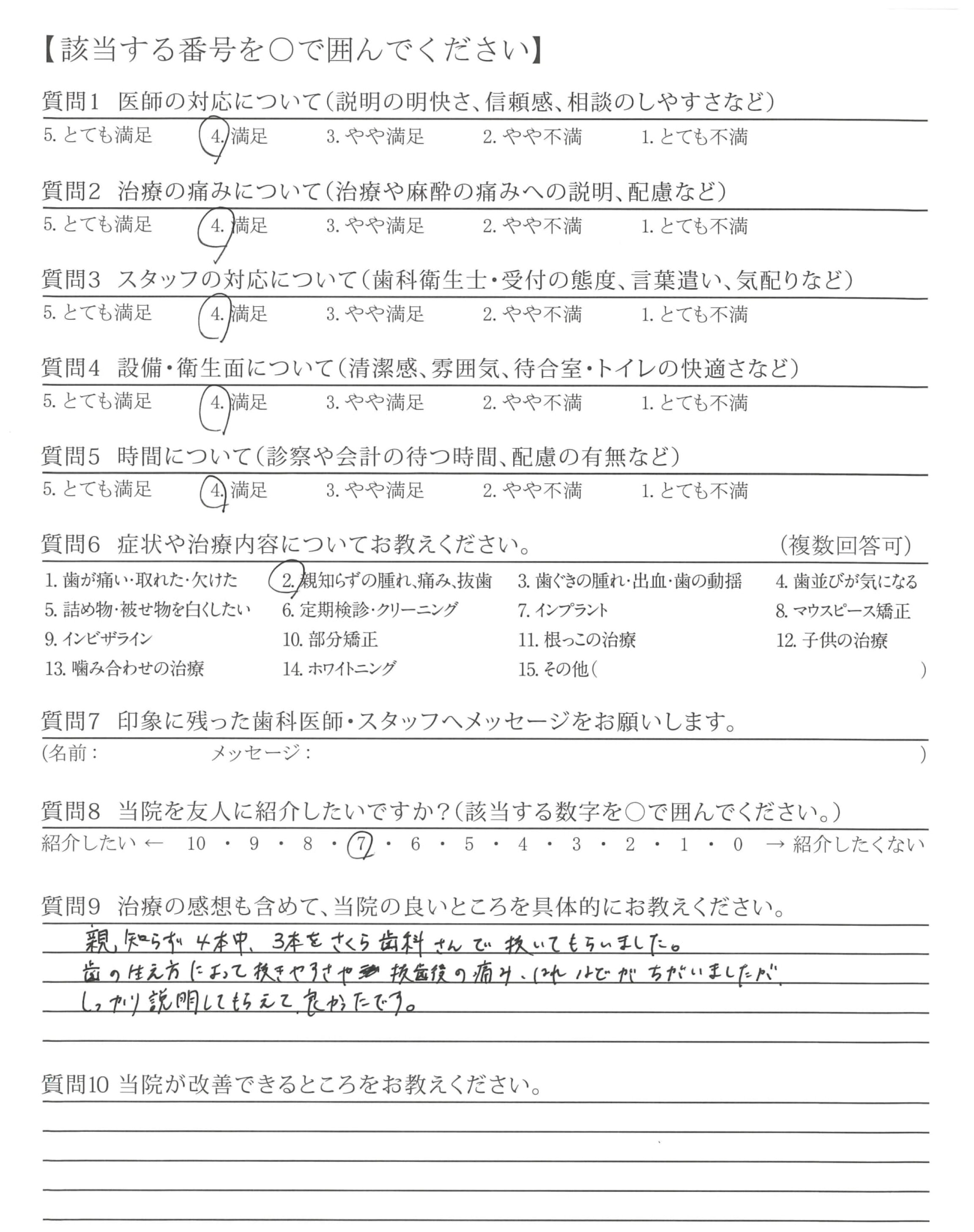 歯の生え方によって抜きやすさや抜歯後の痛み、はれなどがちがいましたが、しっかり説明してもらえて良かったです。