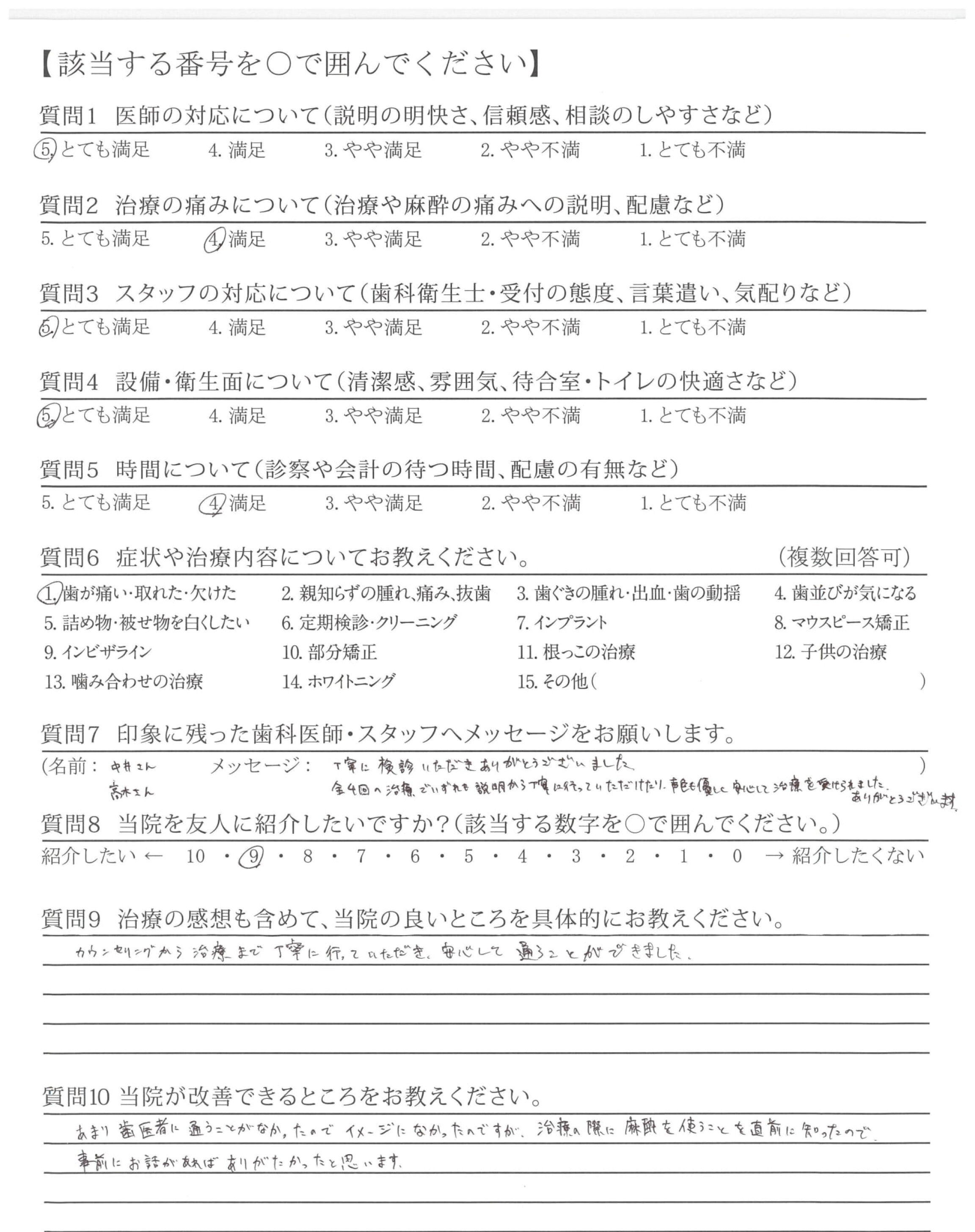 全4回の治療でいずれも説明から丁寧に行っていただけたり、声色も優しく安心して治療を受けられました。ありがとうございます。