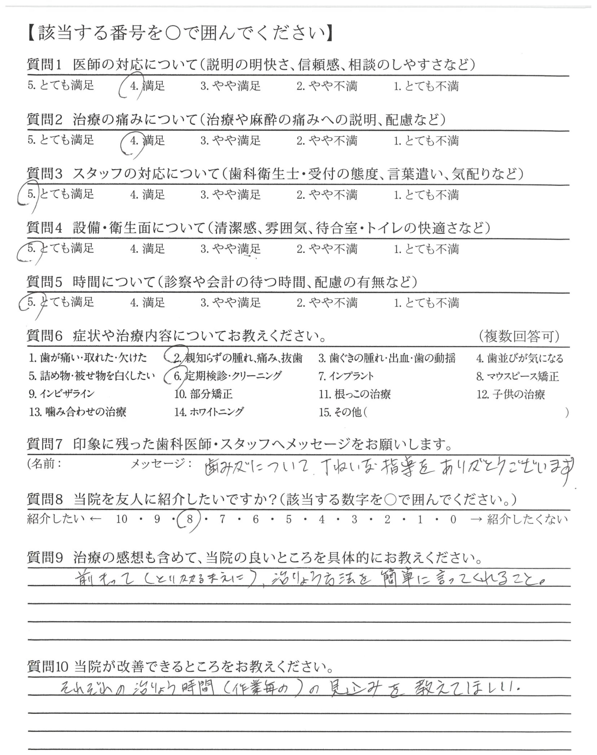 評価が⑤「とても満足」ばかりでウソっぽいですが本心です。歯科に通うのは気の重いことですが、歯が確実によくなることが期待できるので楽しみに通院しています。