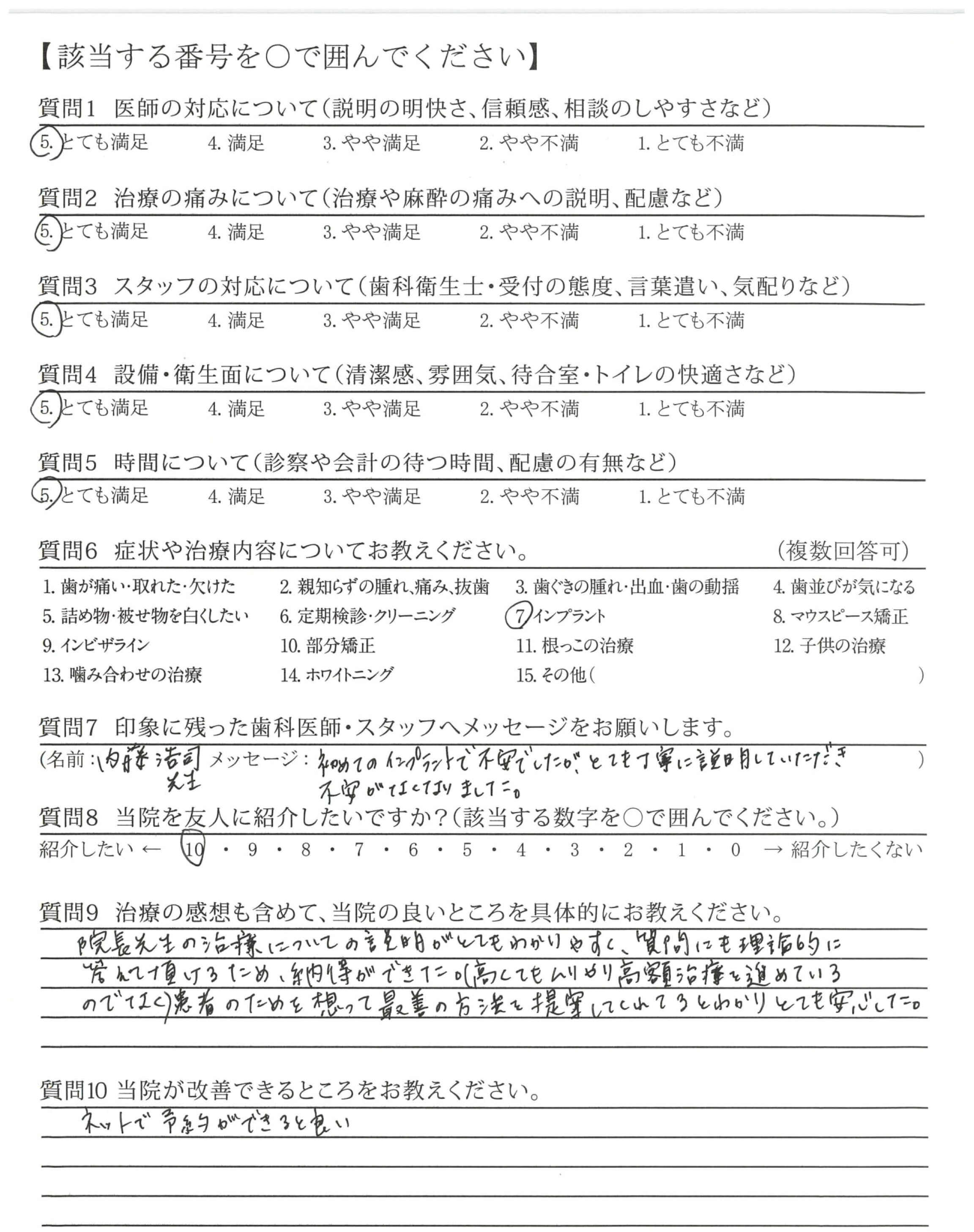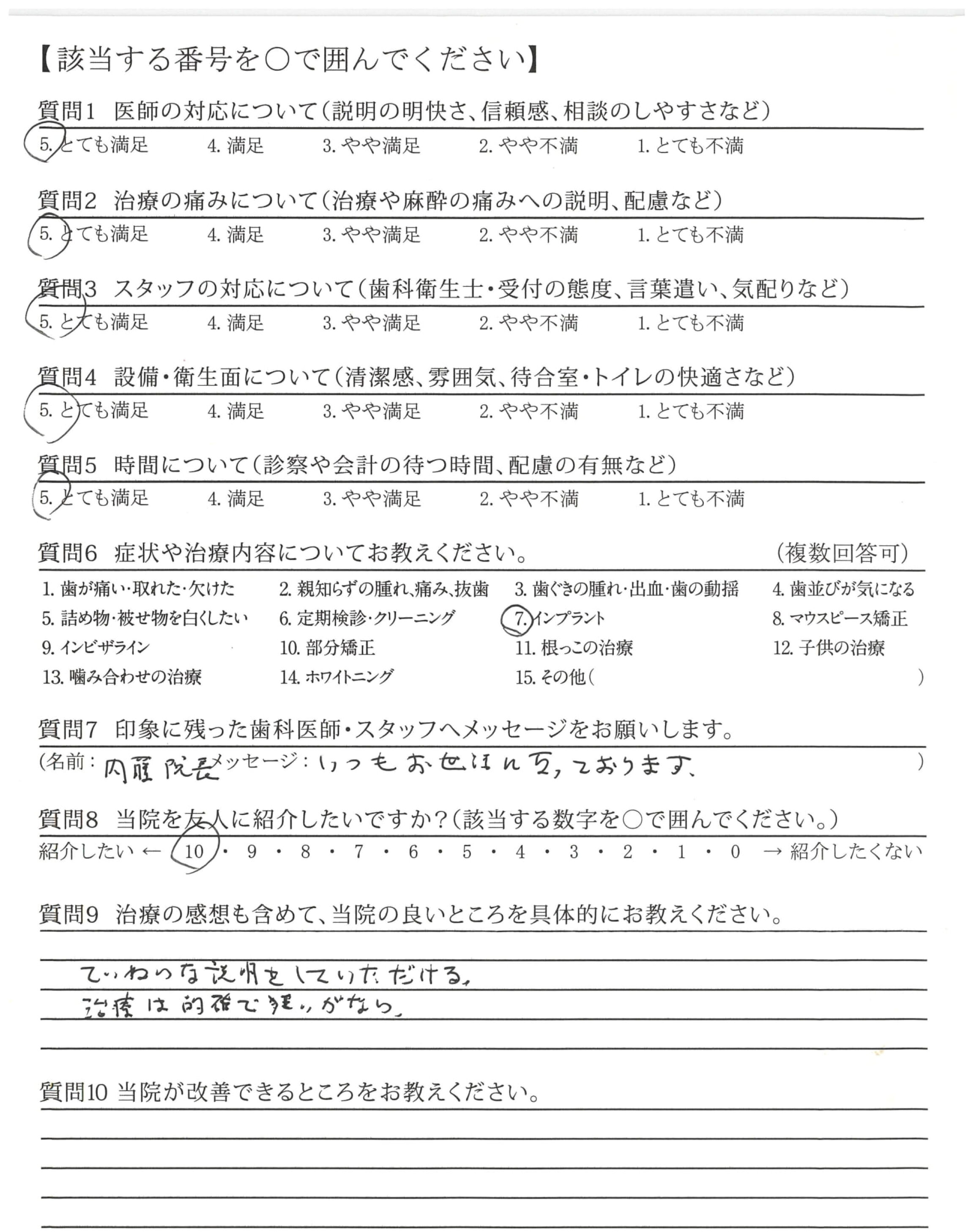 評価が⑤「とても満足」ばかりでウソっぽいですが本心です。歯科に通うのは気の重いことですが、歯が確実によくなることが期待できるので楽しみに通院しています。