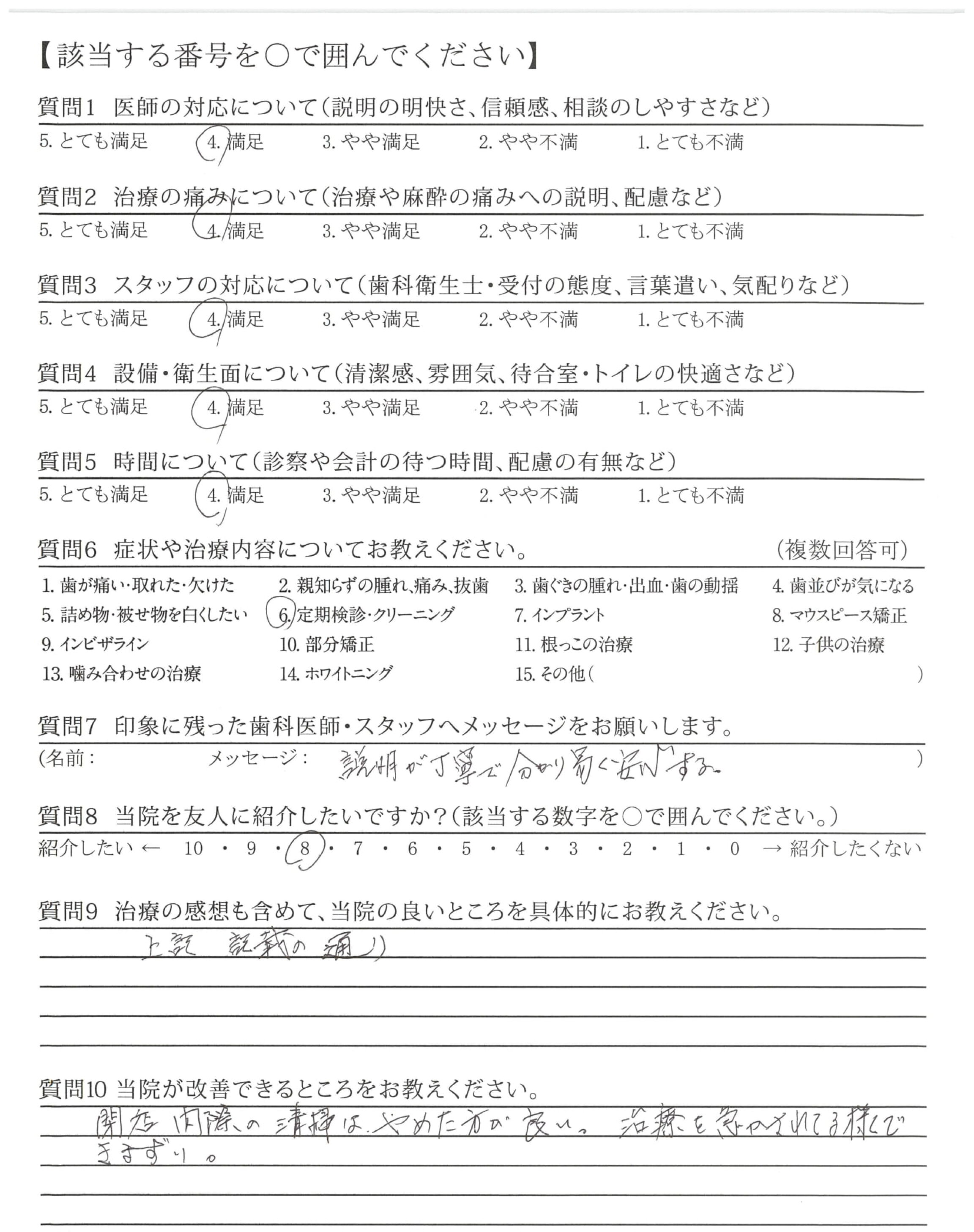 わかりやすい説明で安心して治療する事ができました。これからもよろしくお願いします。