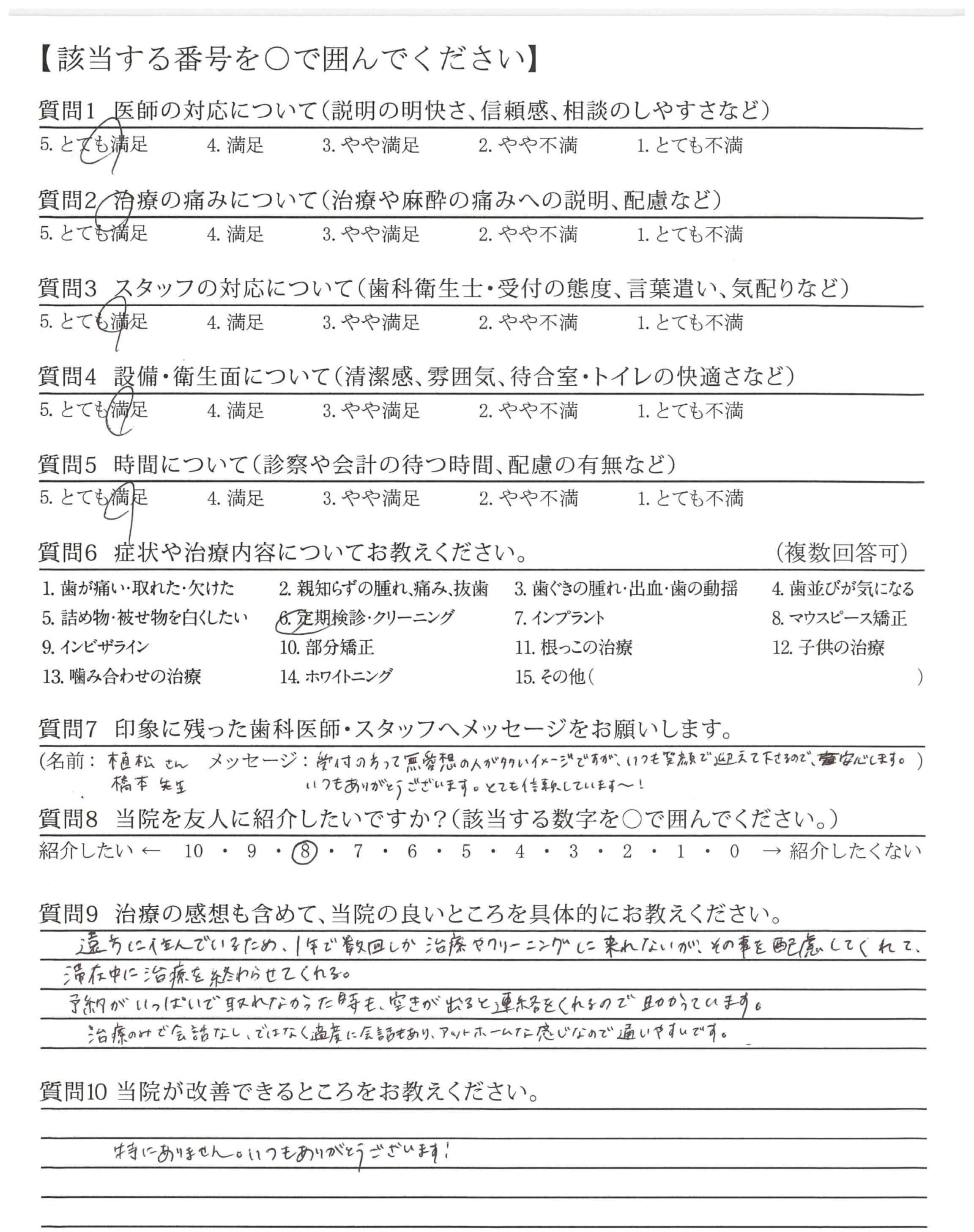 いつも様々な選択肢を教えていただいた上で、ていねいに治療していただき、ありがとうございます。
