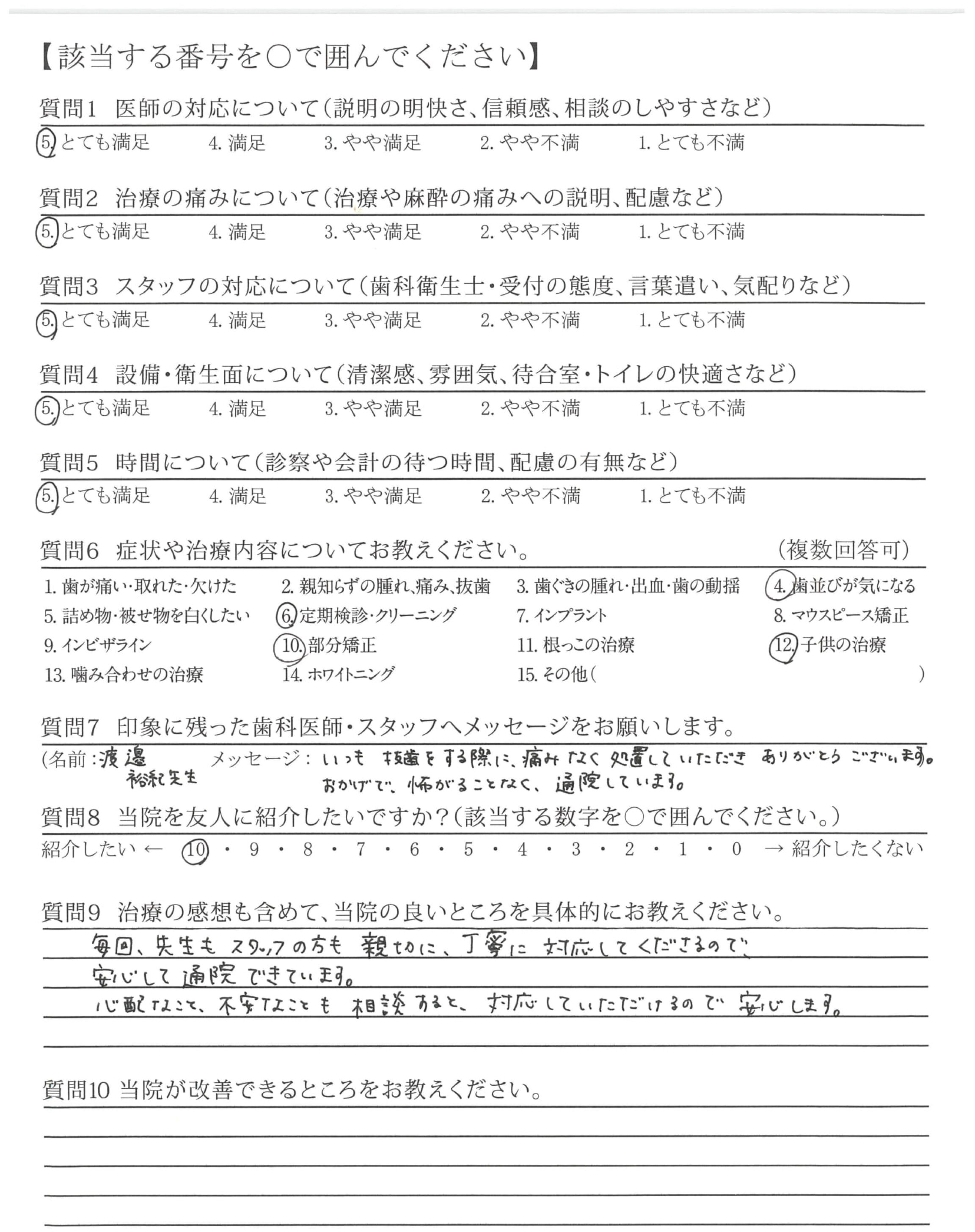 いつも抜歯をする際に、痛みなく処置していただきありがとうございます。おかげで、怖がることなく、通院しています。