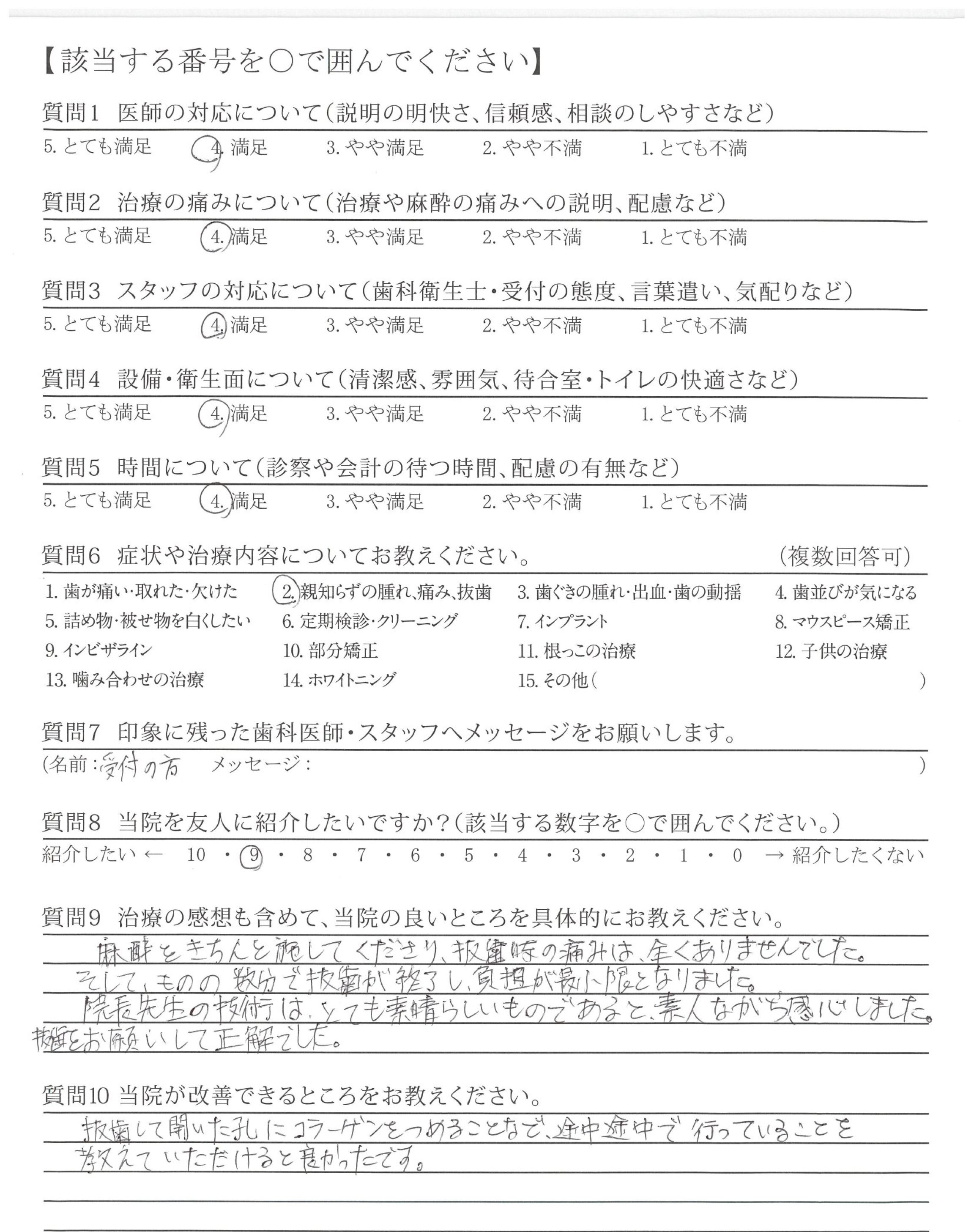 親知らずを抜いてもらいました。痛みも腫れもなく、治療もすぐに終わったので良かったです。ありがとうございました。