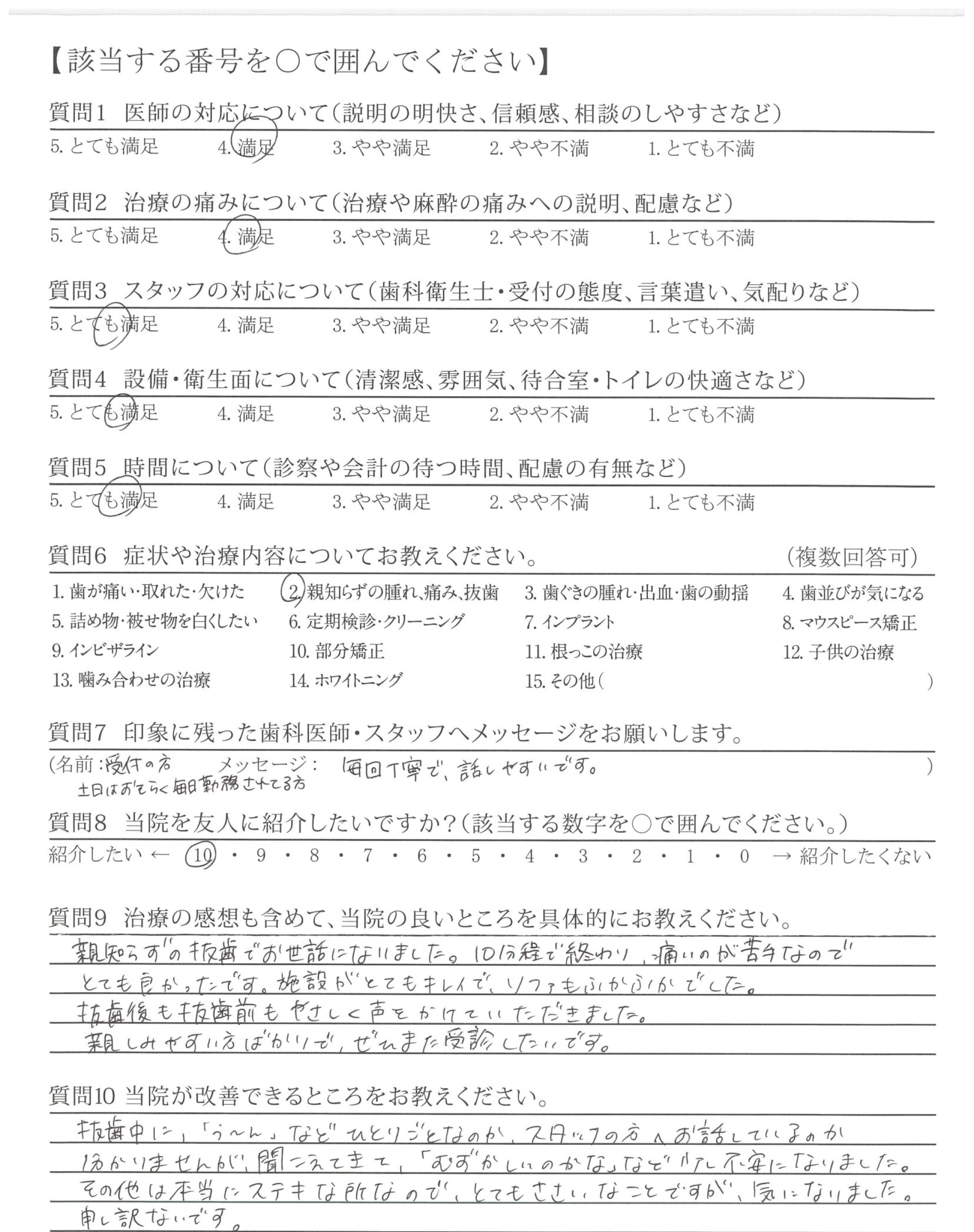 抜歯への怖さも軽減してくださり、また機会があればお願いしたいです。