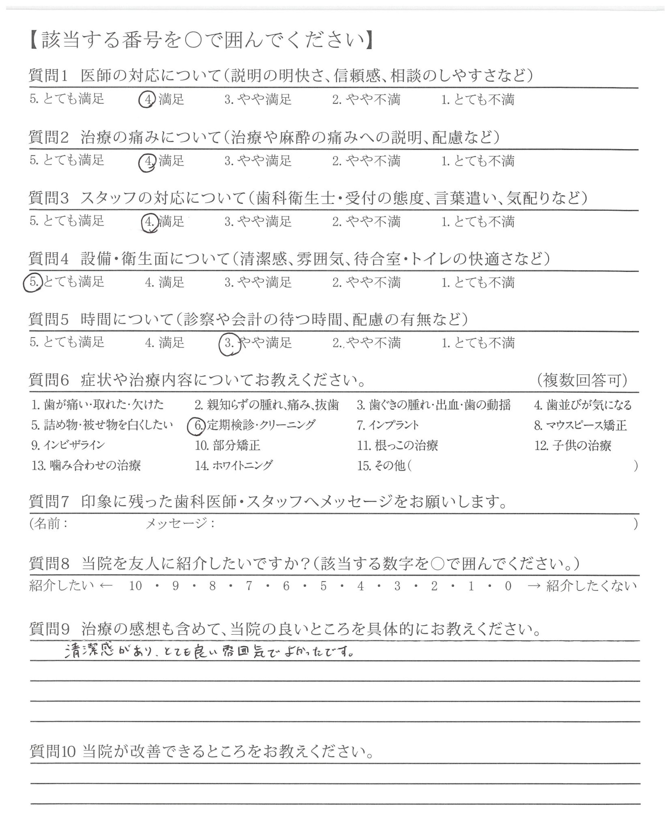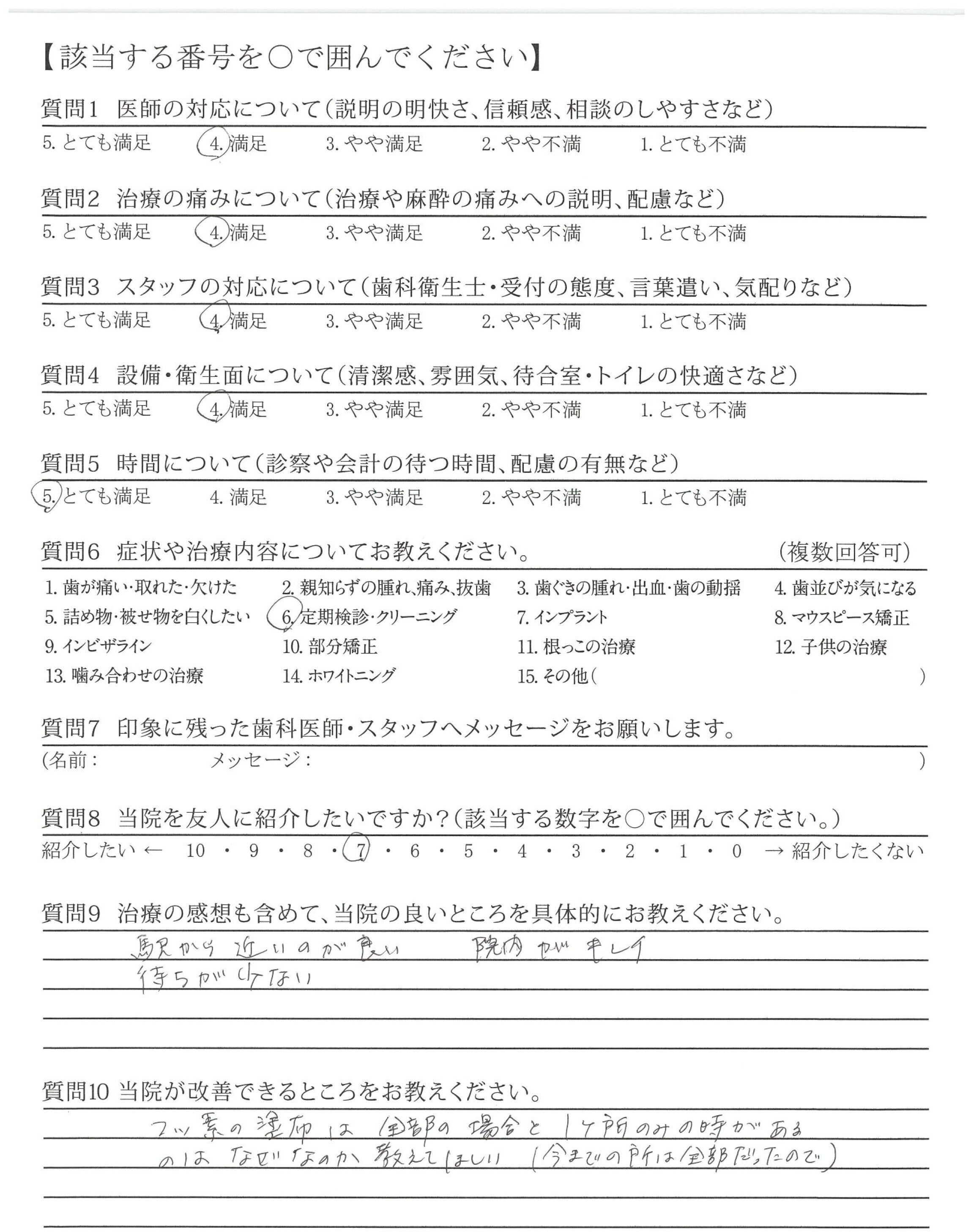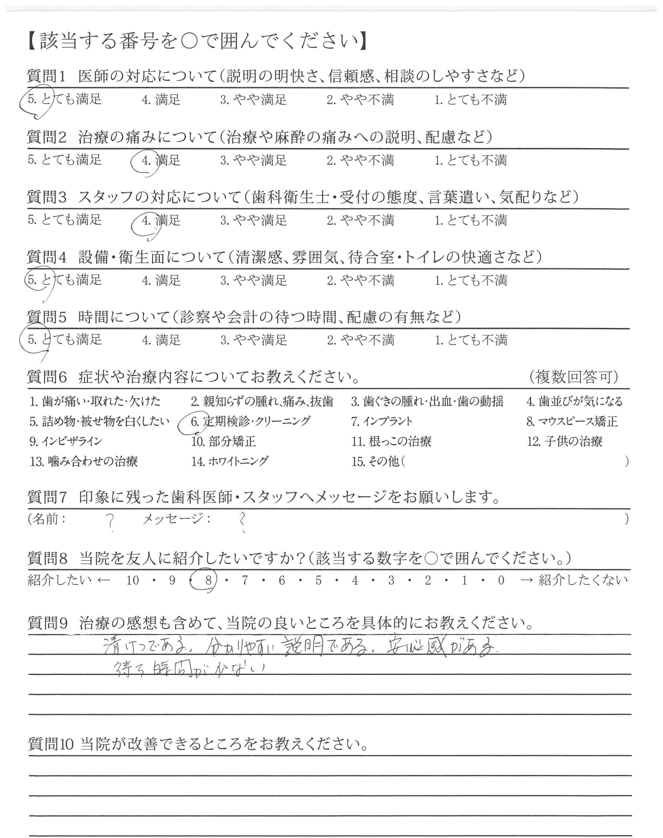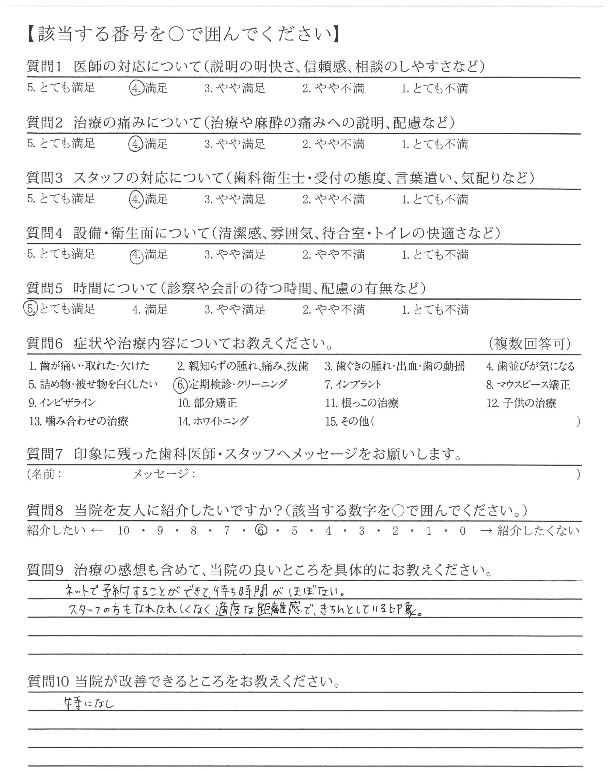 今回は定期検診・クリーニングで来ました。治療前に必ず言葉で伝えてから治療を始めてくれるのでより安心感がもてました。ちょっとしたことですが、そういうところが大事だと思います。続けていただけると嬉しいです。