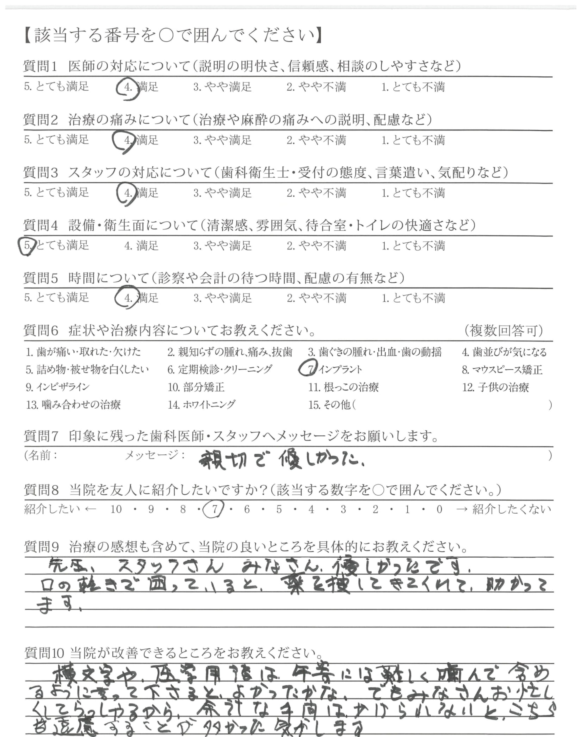 今回インプラントを入れてお世話になりましたが、歯の事をもっと勉強したいと思ったので、患者向けのミニセミナーとか勉強会とかを開催してくれたら、歯医者の先生の人柄とかも身近に感じられてよいのではないでしょうか....。