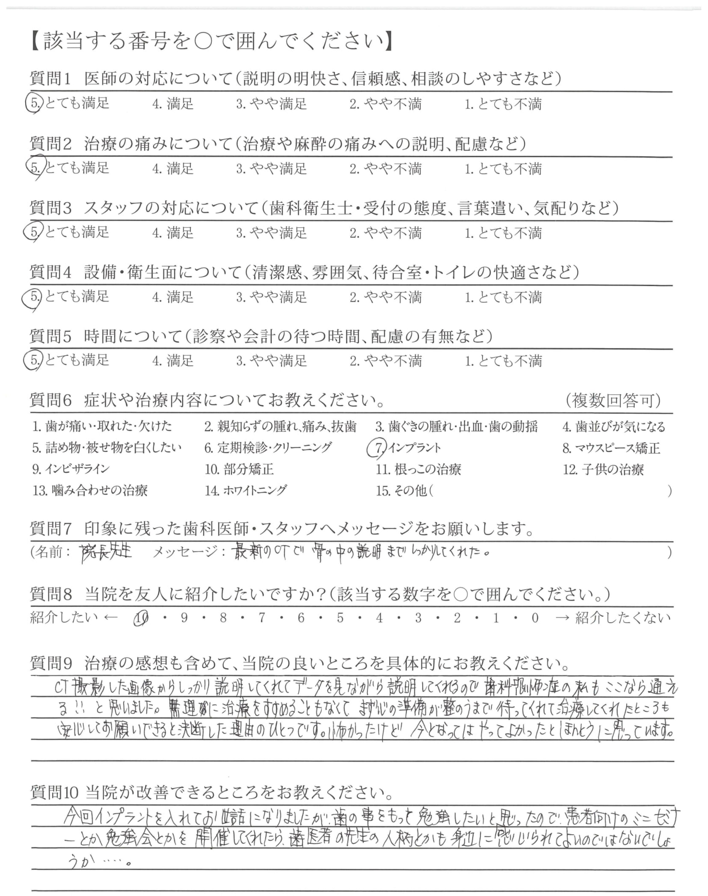 インプラント治療をお願いしました。最初は手術と聞いて怖かったのですが、事前にCT画像を見ながらとても丁寧に説明していただき安心して治療を受けることができました。今では自分の歯のようにしっかり噛めて本当にやってよかったと思っています。