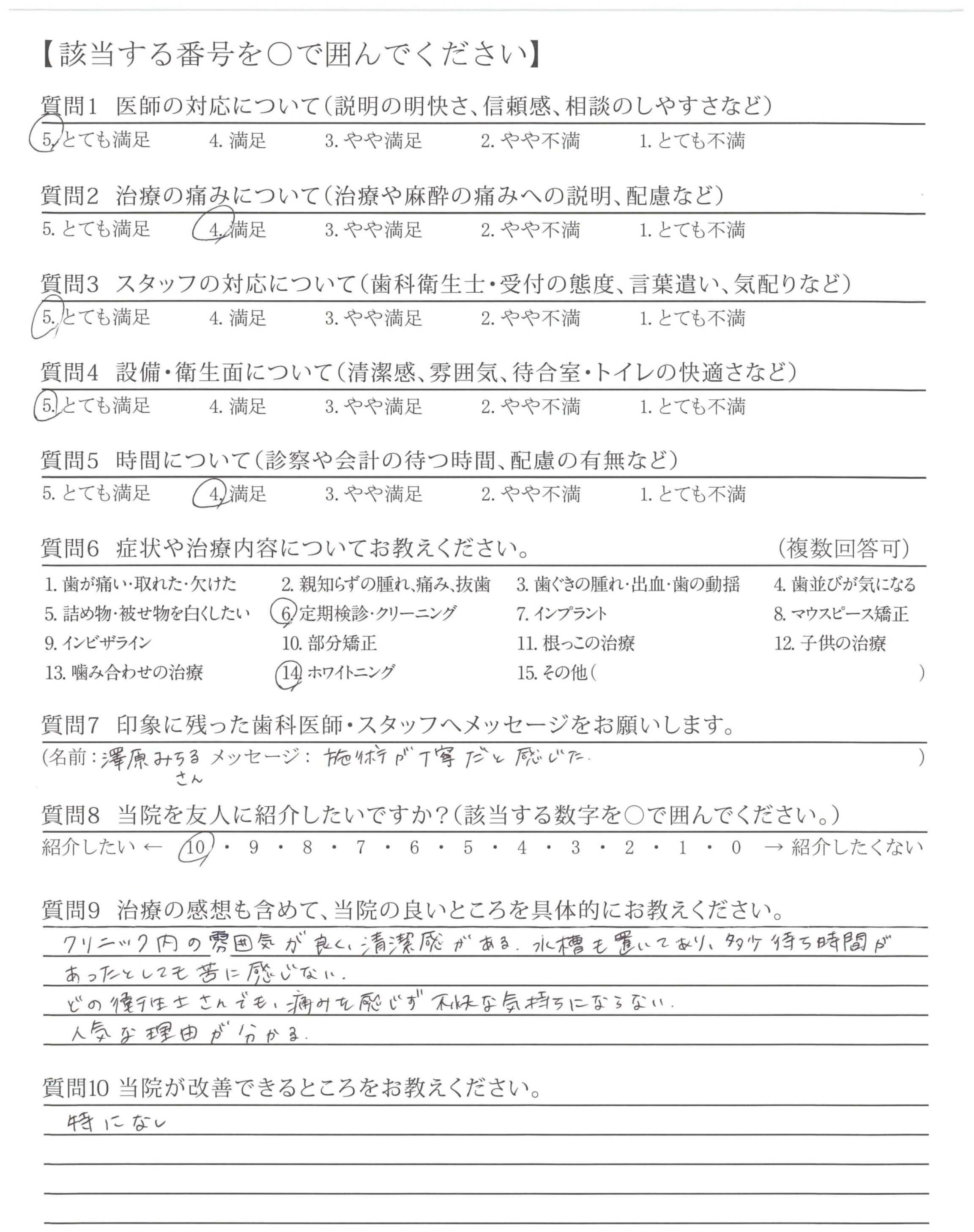 ホワイトニングがしたくて受診しました。術前にしっかり説明があり、術後の注意点も資料をもらえて分かりやすかった。