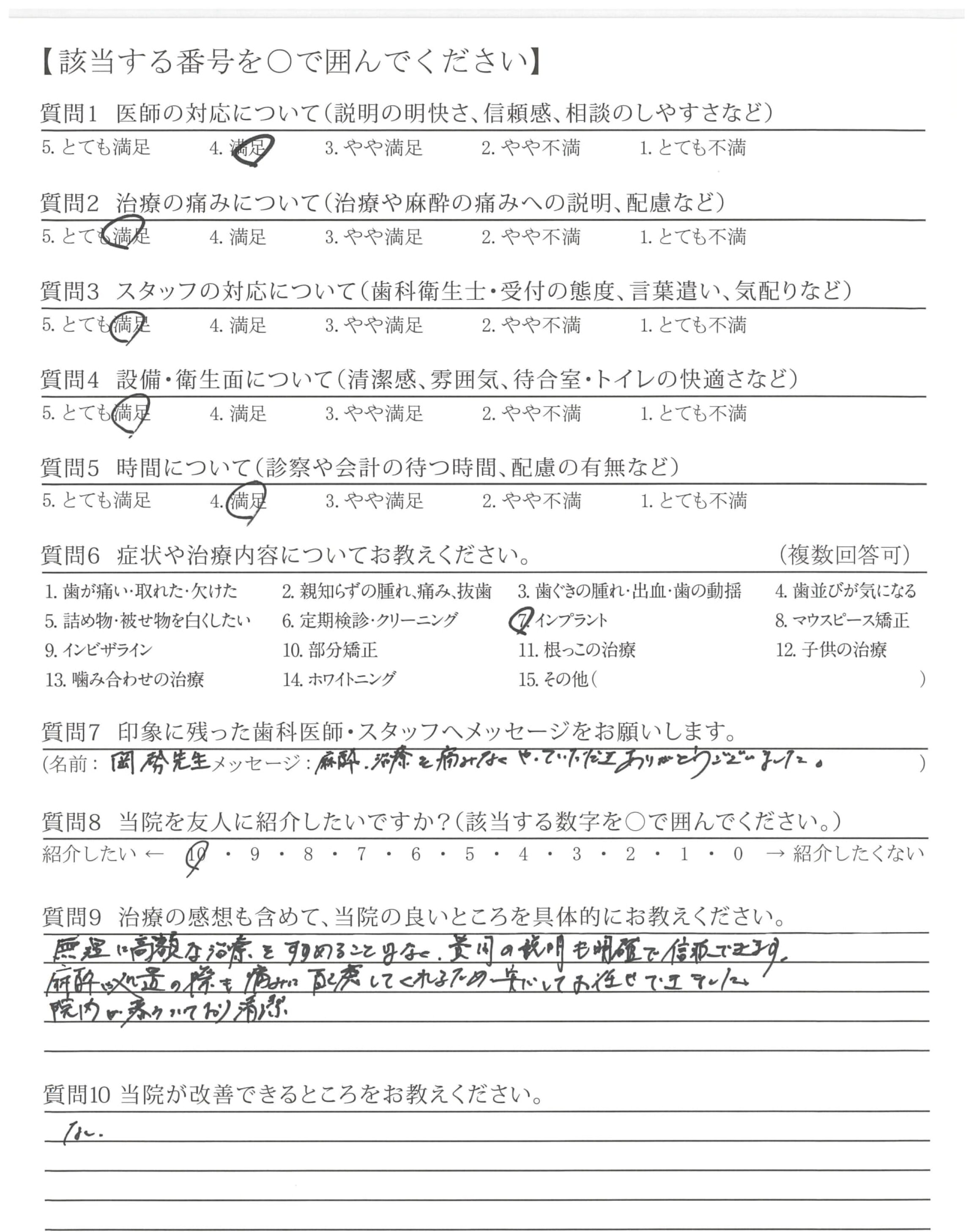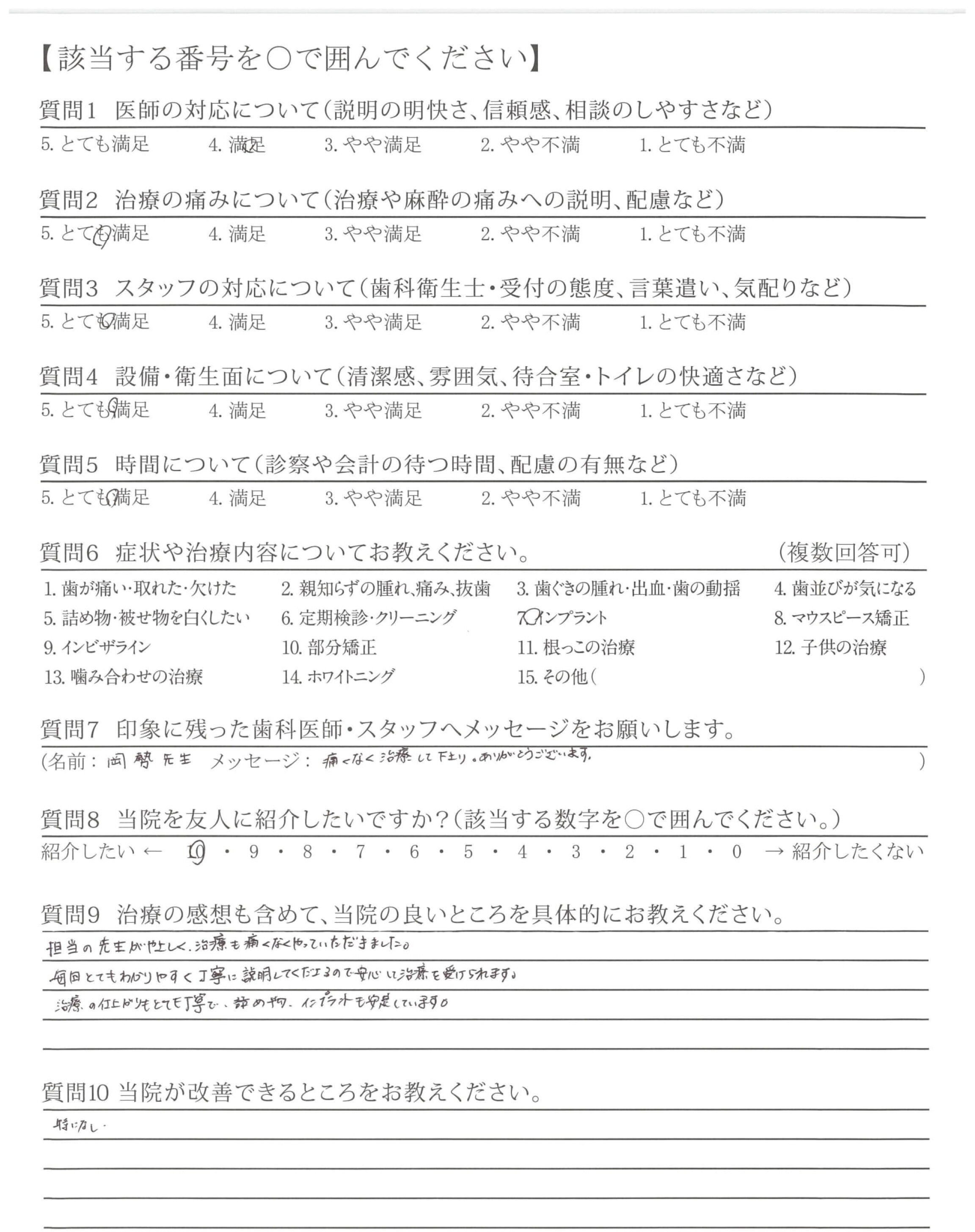 麻酔、治療を痛みなくやっていただきありがとうございました。