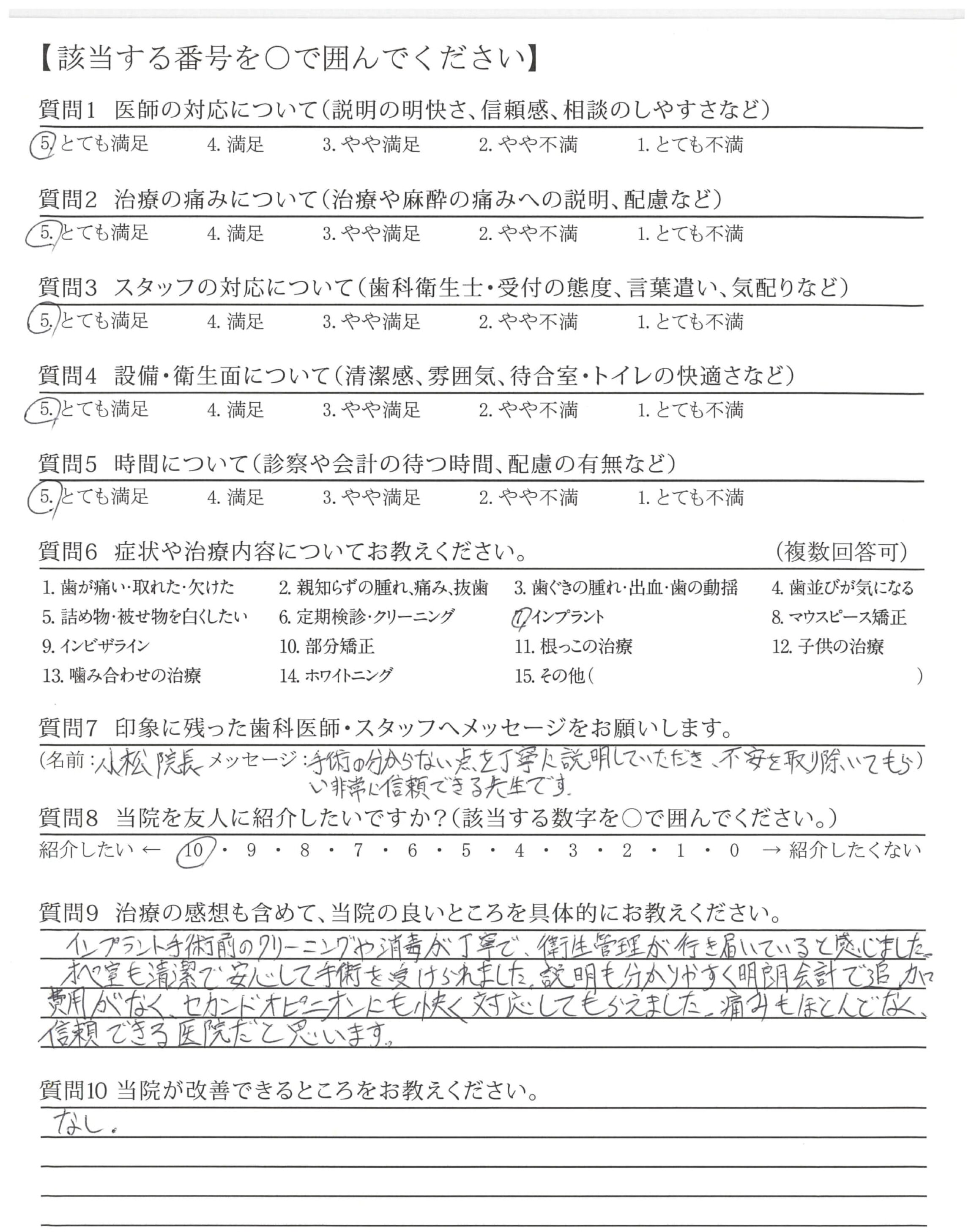 インプラント治療をして頂きました。手術もあっという間に終わり痛みもほとんどありませんでした。