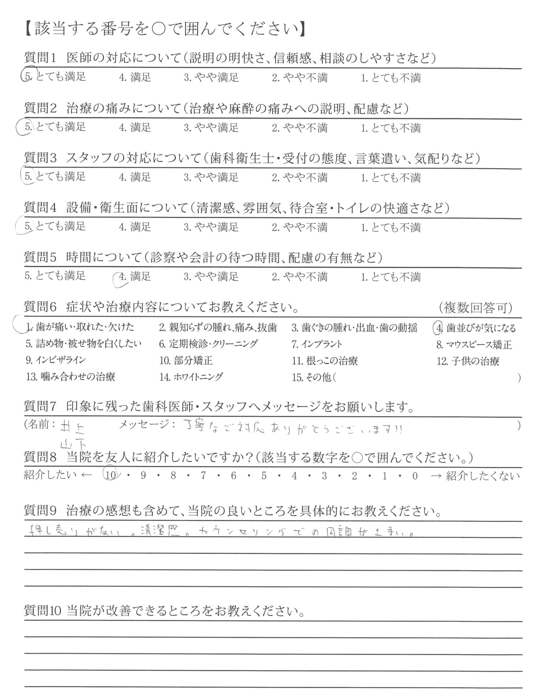 歯の状態、検査の内容、治療の方針等、それぞれ丁寧に説明していただき、納得したうえで治療を受けられたことがとても良かったです。