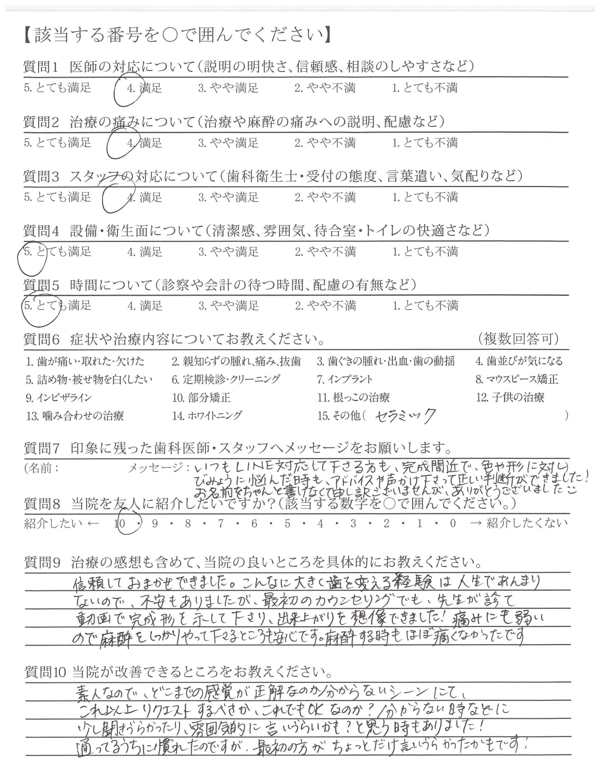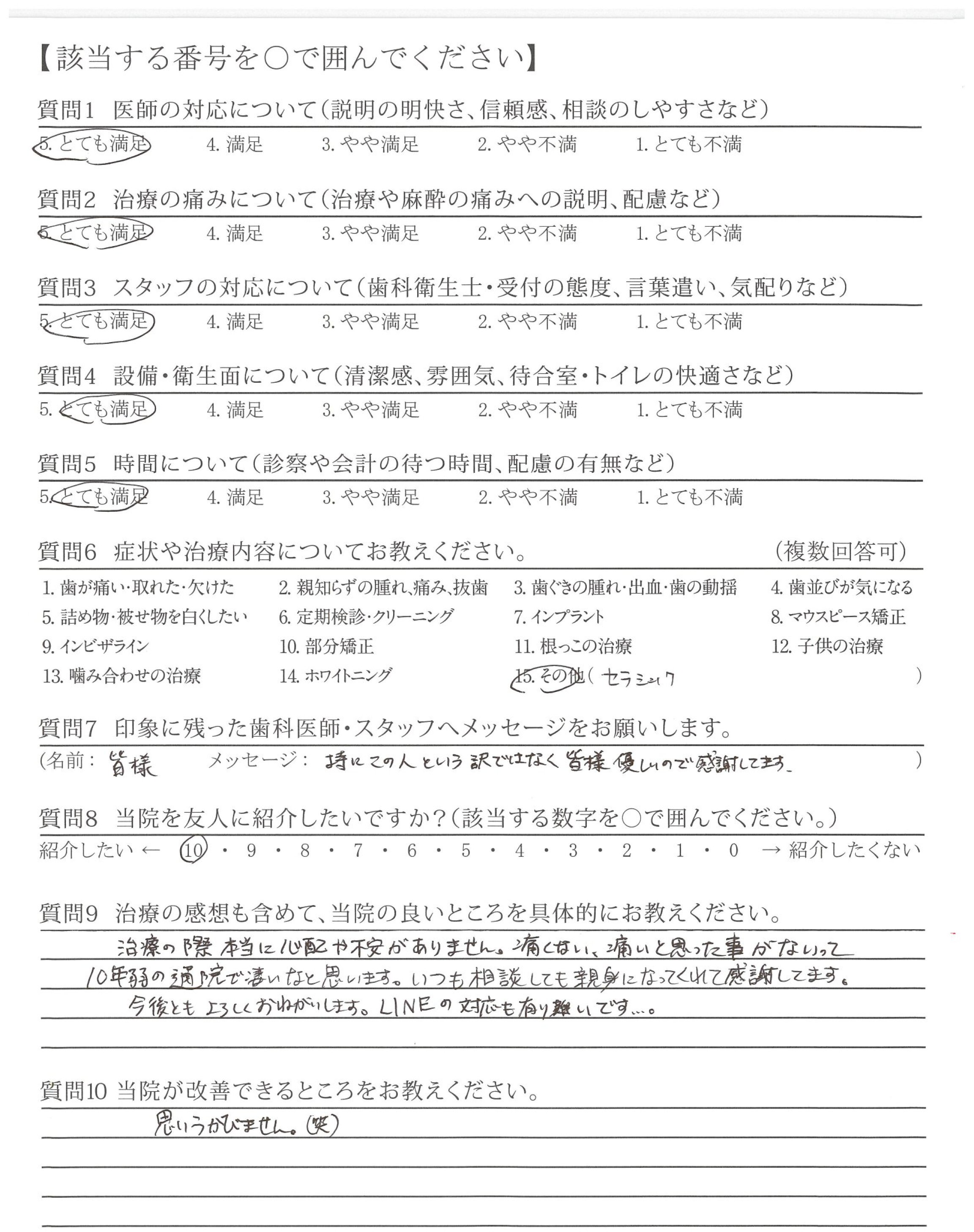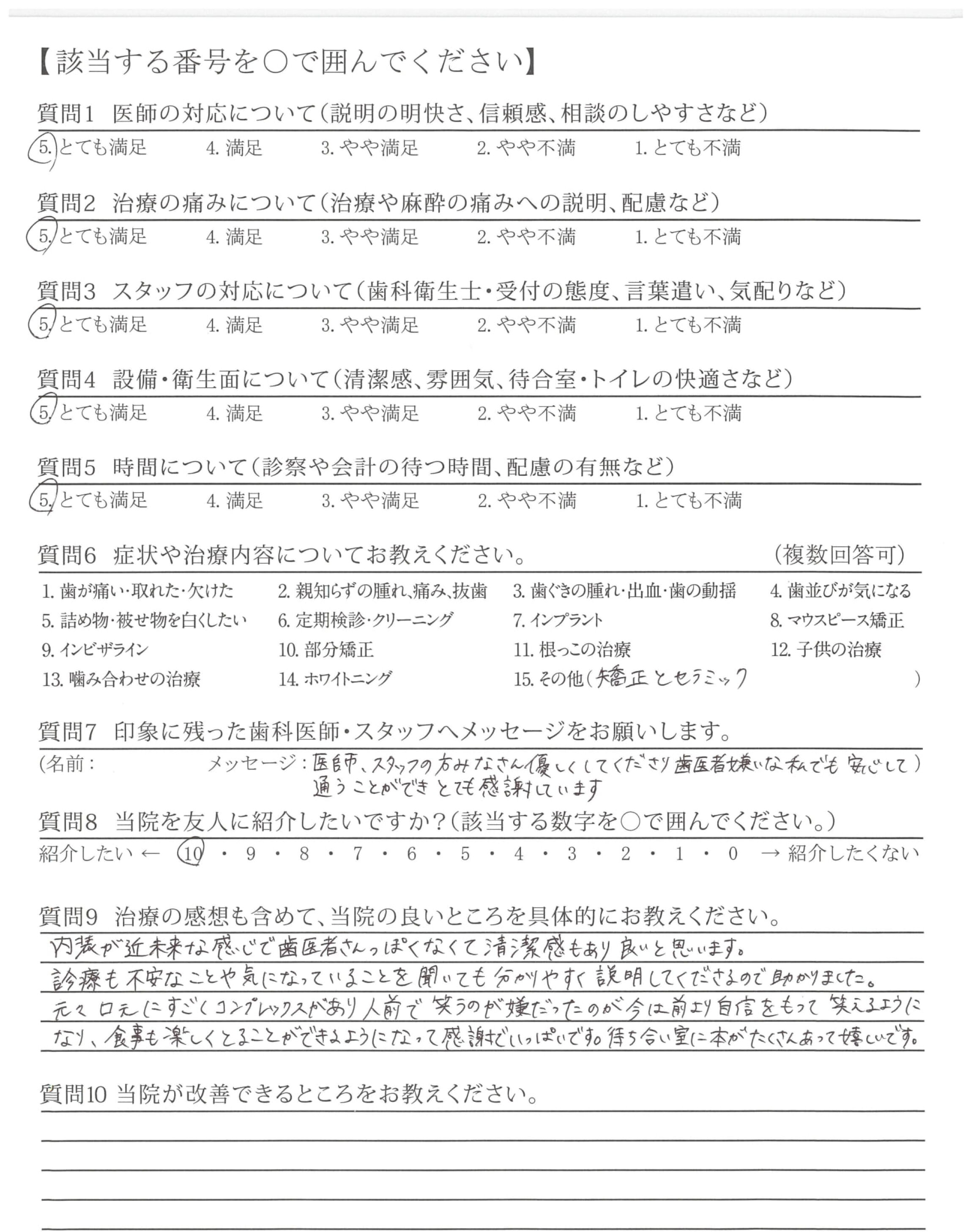 ・昔から歯医者に行くのは苦痛でしたが、先生方も優しく治療もあまり痛みを感じる事なくどんどん歯が良くなっていくのが楽しみでした。