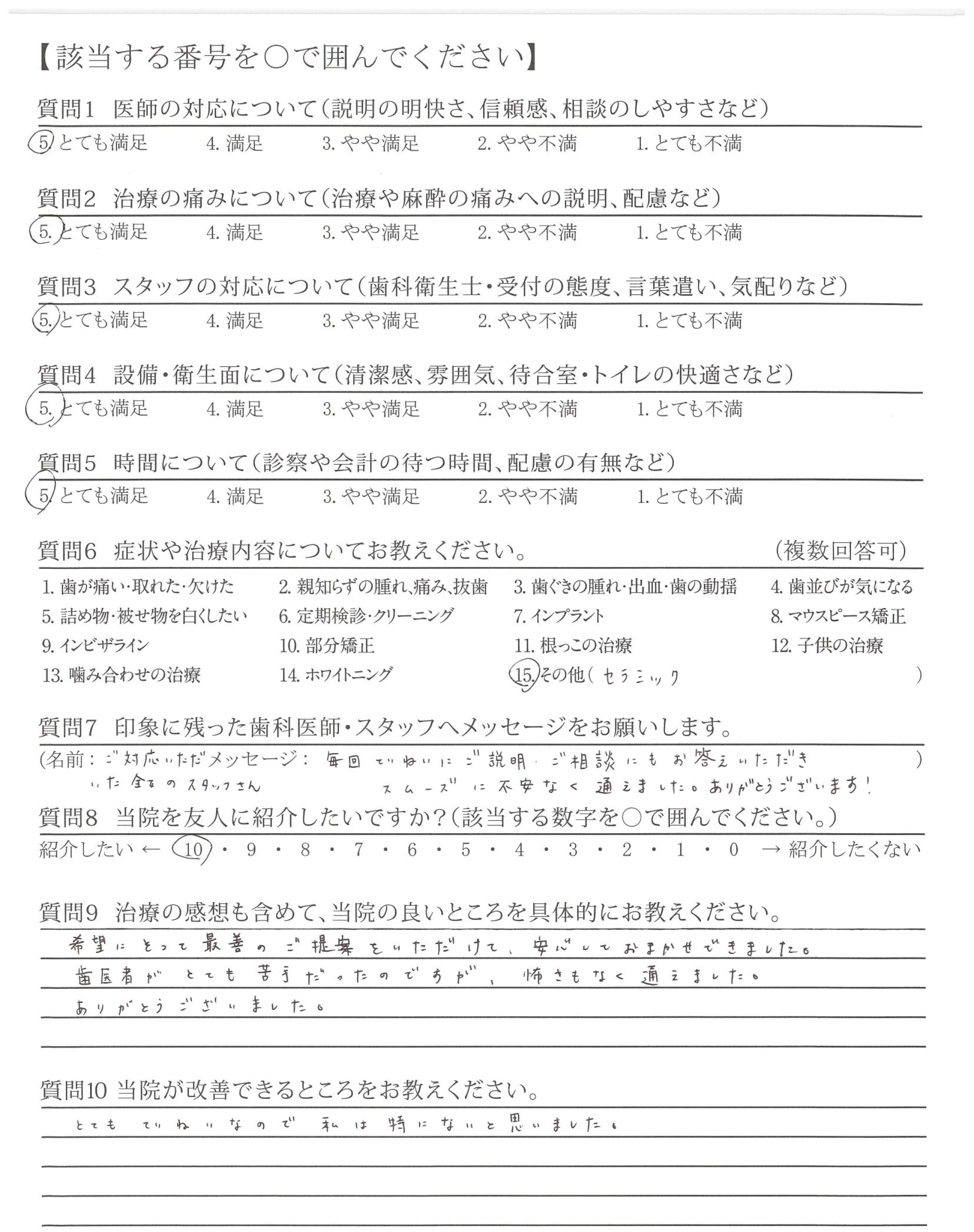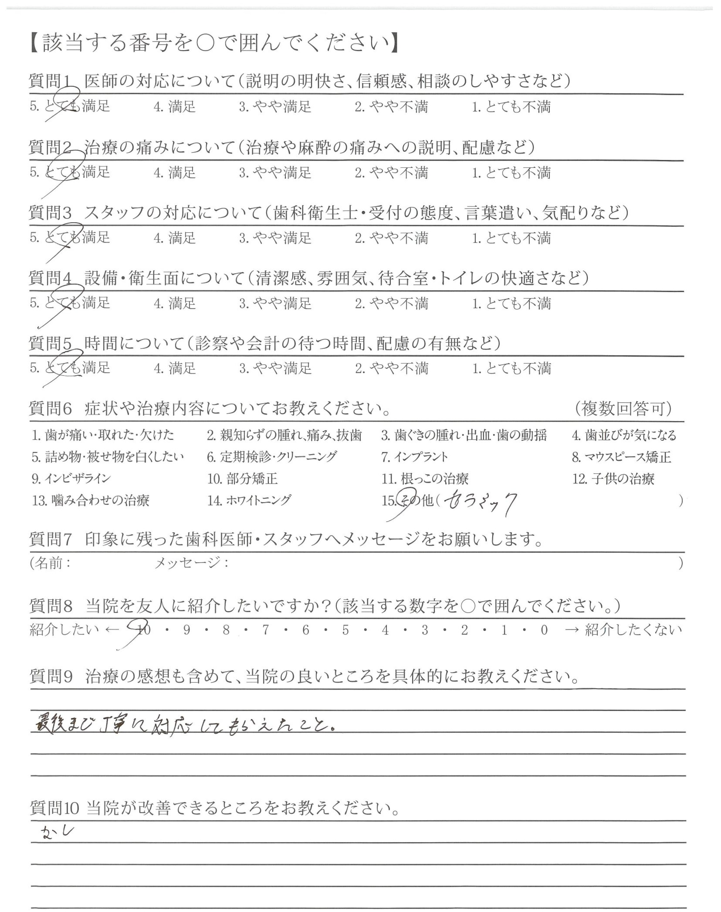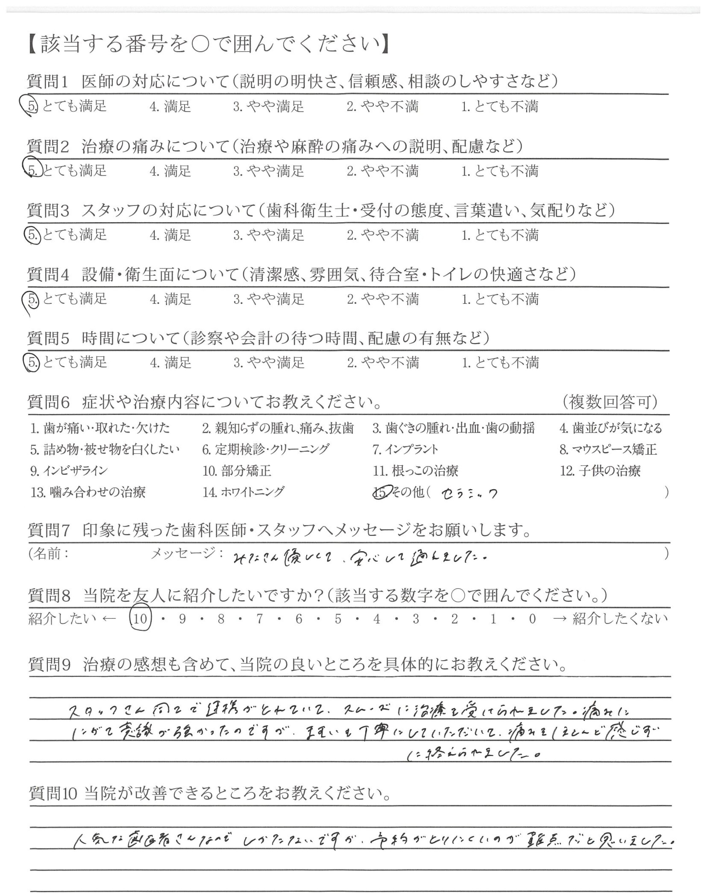 歯医者がとても苦手だったのですが、怖さもなく通えました。ありがとうございました。