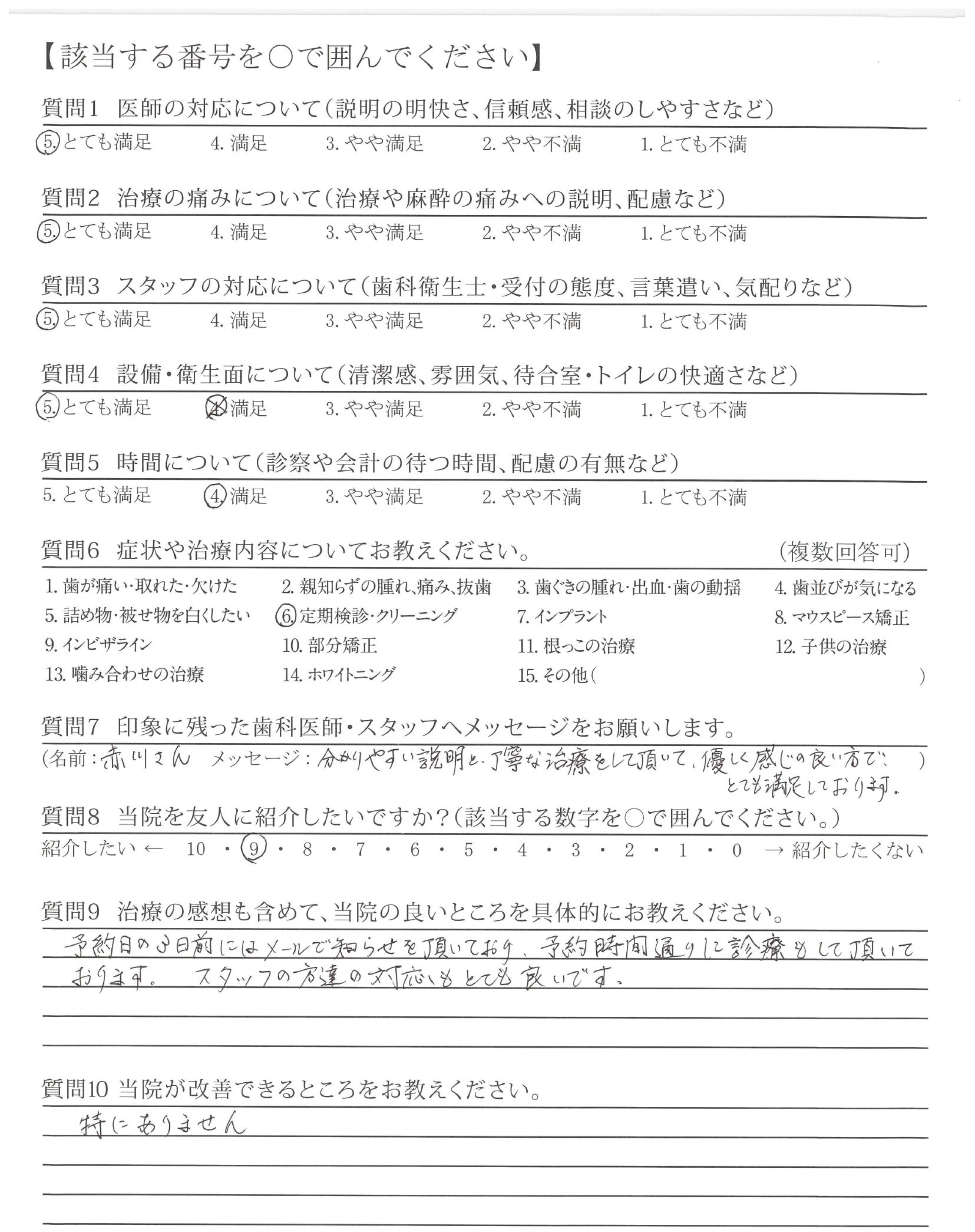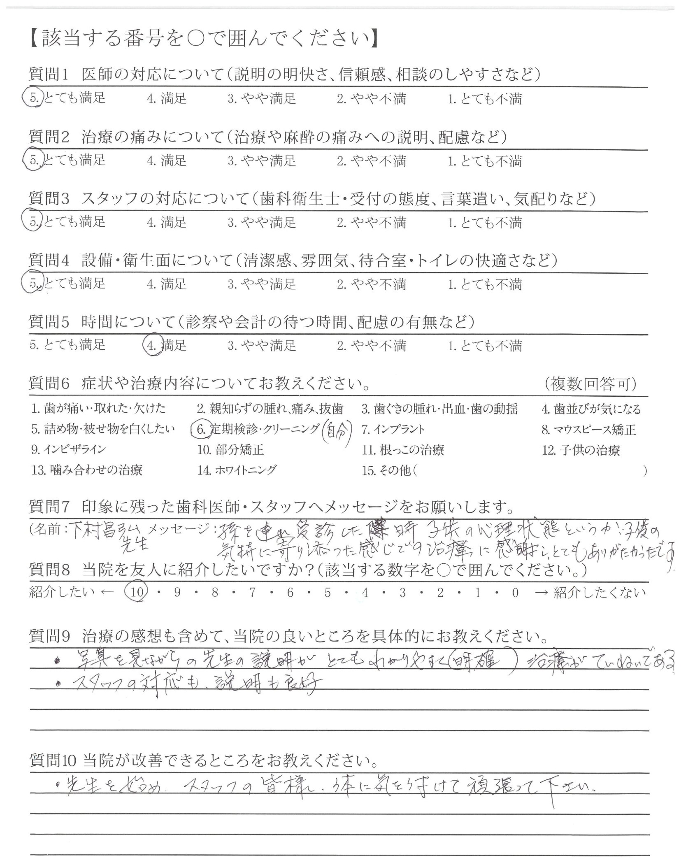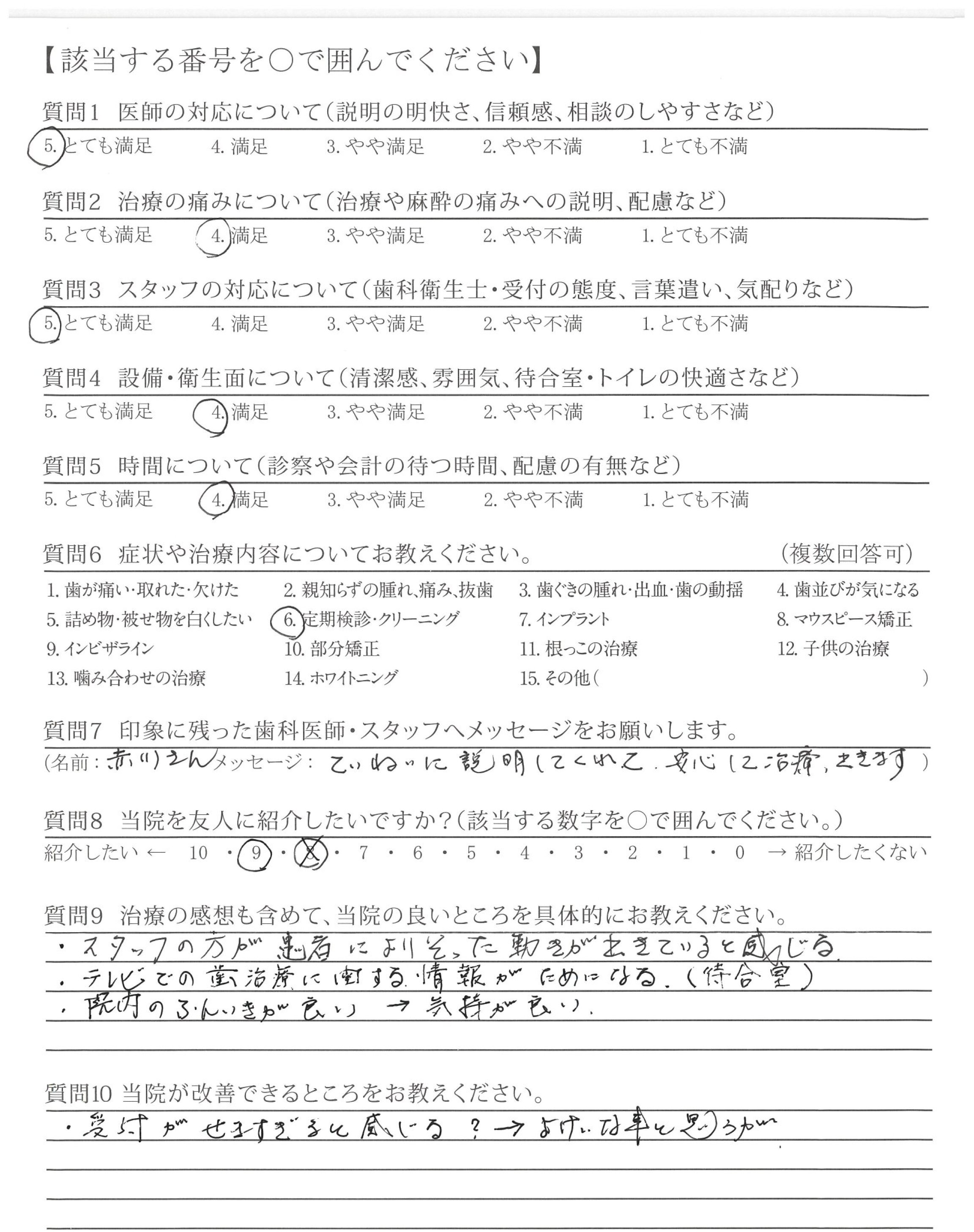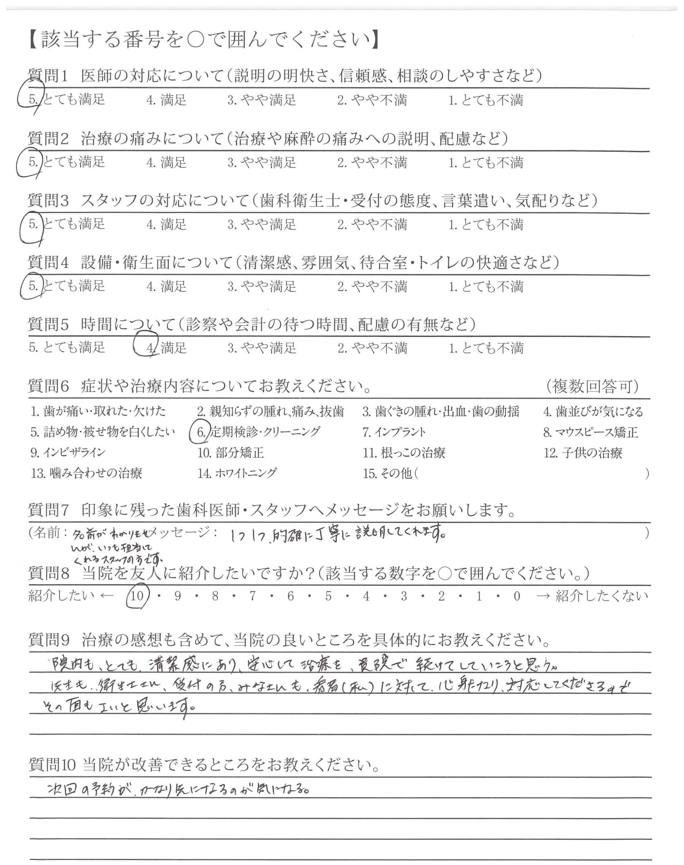 優しい声かけ、丁寧な説明で安心してメンテナンスに通えております。口の中を触る時も、他の方とは段違いで丁寧です。たぶん他の歯科でも●●さん以上の人には出会えないと思ってます。歯みがき上手になってます。の声かけも嬉しく、これからもよろしくお願いします!!