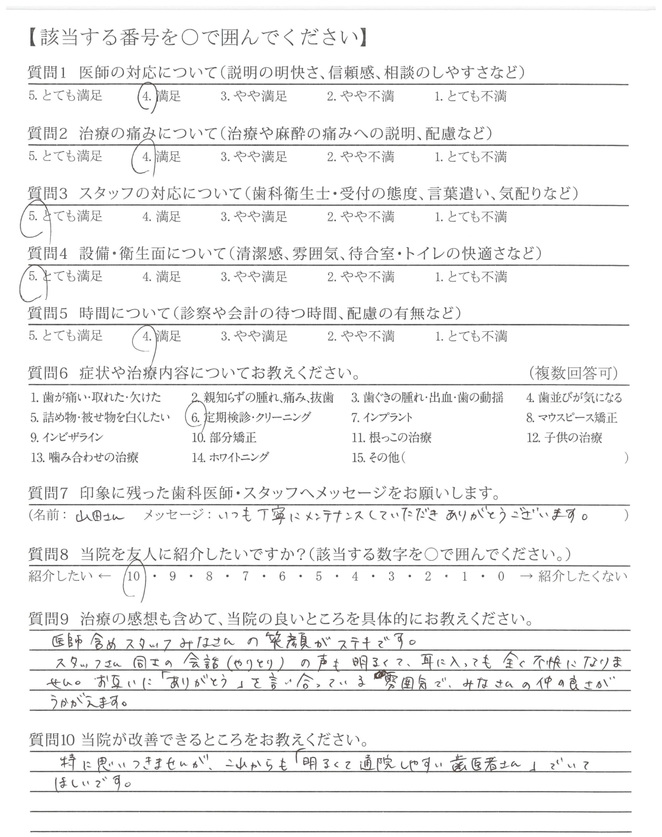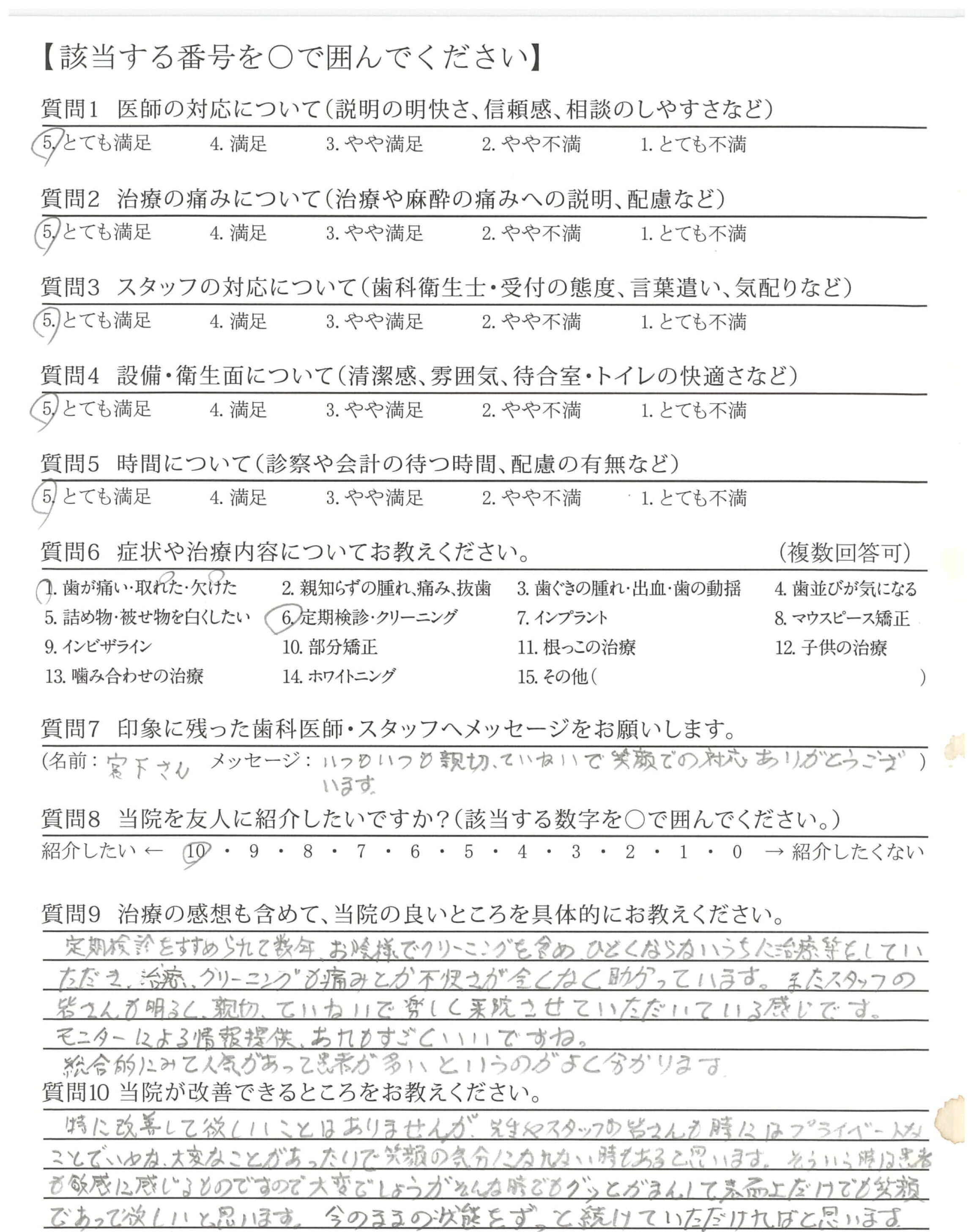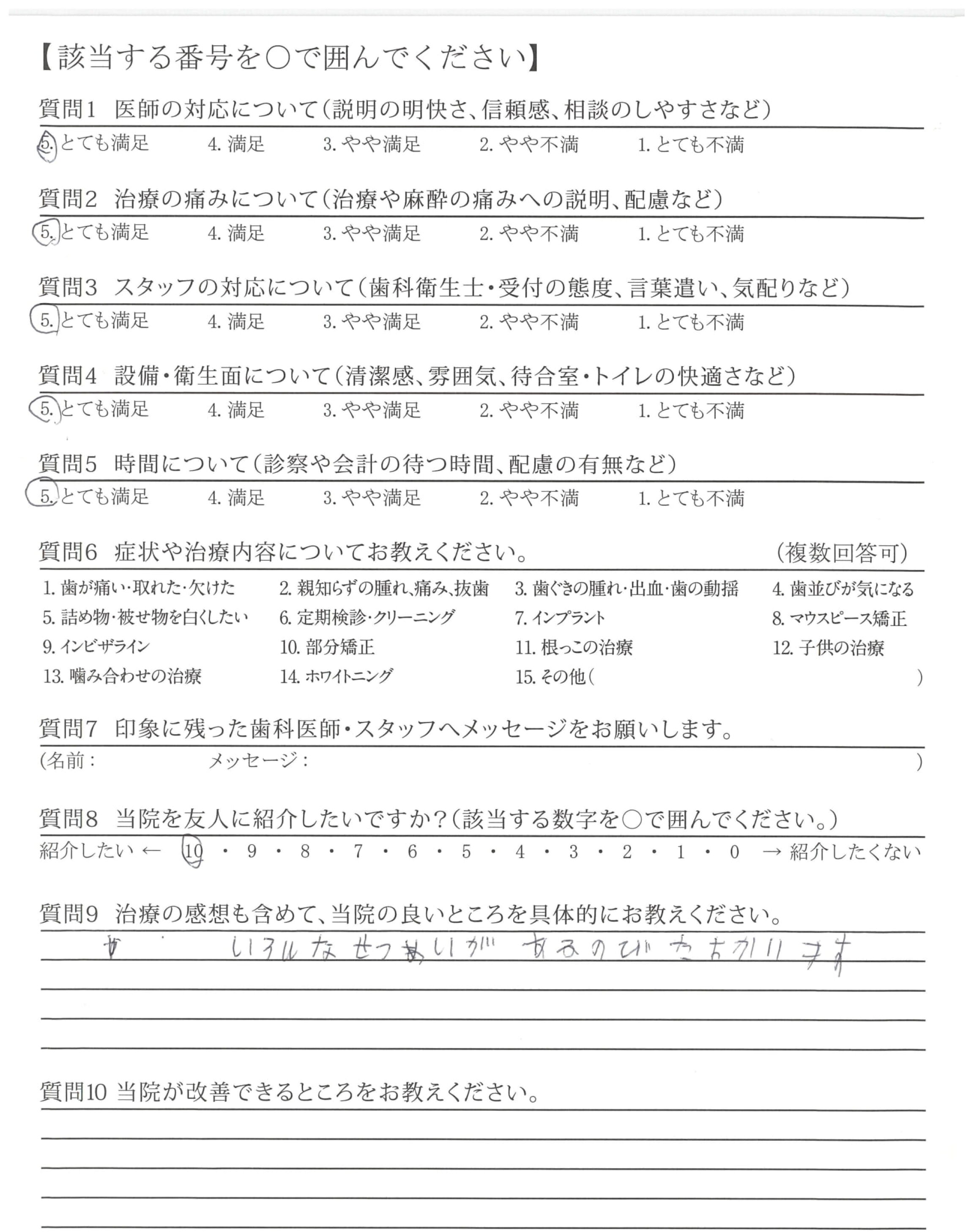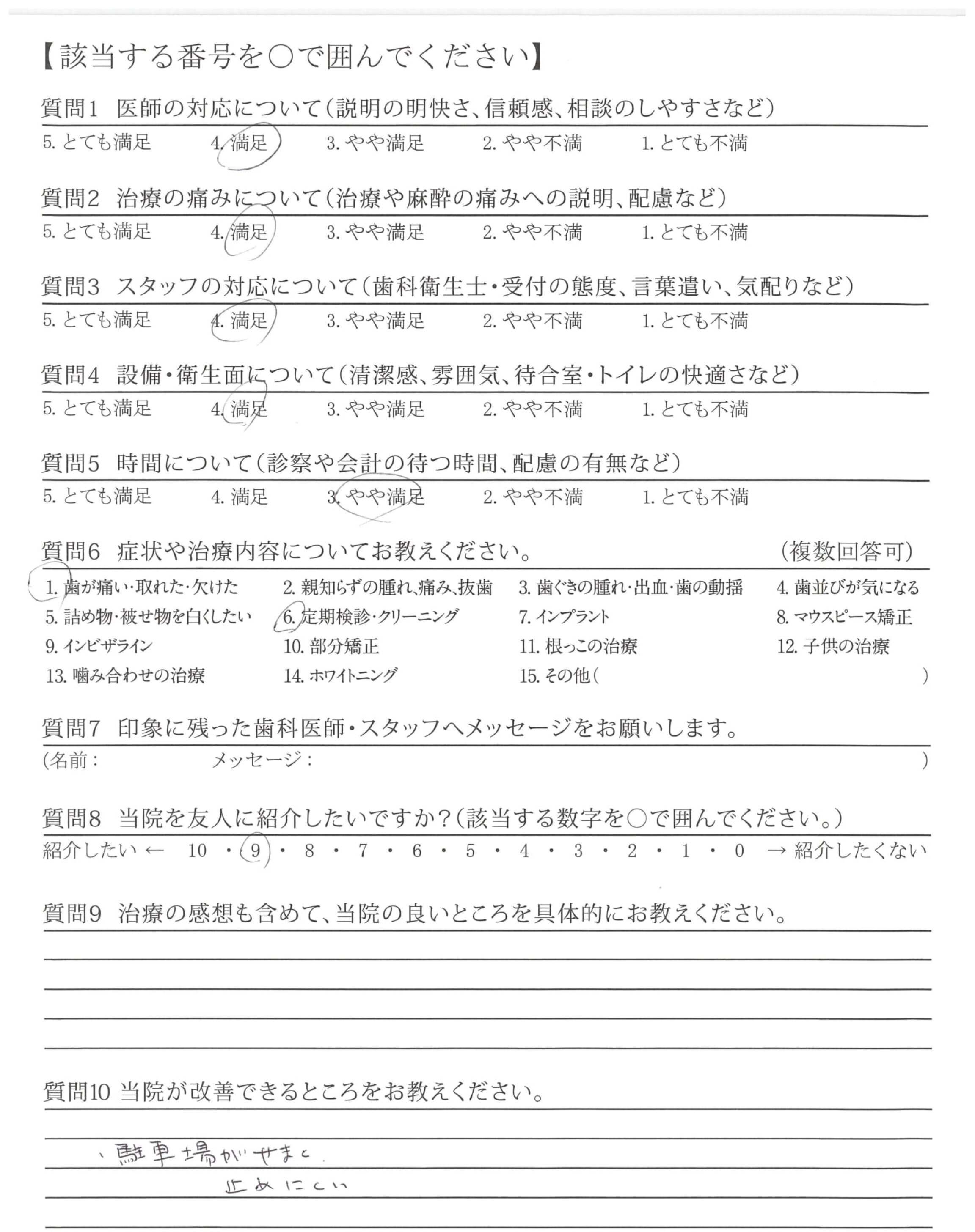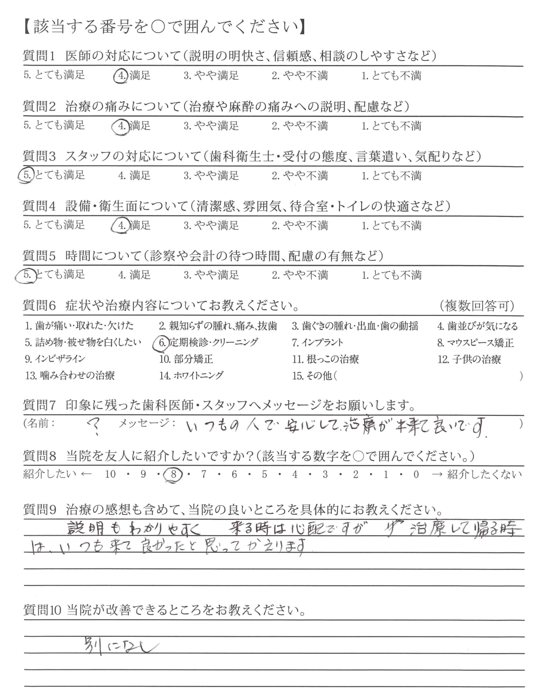 特に改善して欲しいことはありませんが、先生やスタッフの皆さんも時にはプライベートなことでいやな大変なことがあったりで笑顔の気分になれない時もあると思います。そういう時は患者も敏感に感じるものですので大変でしょうがそんな時でもグッとがまんして表面上だけでも笑顔であって欲しいと思います。