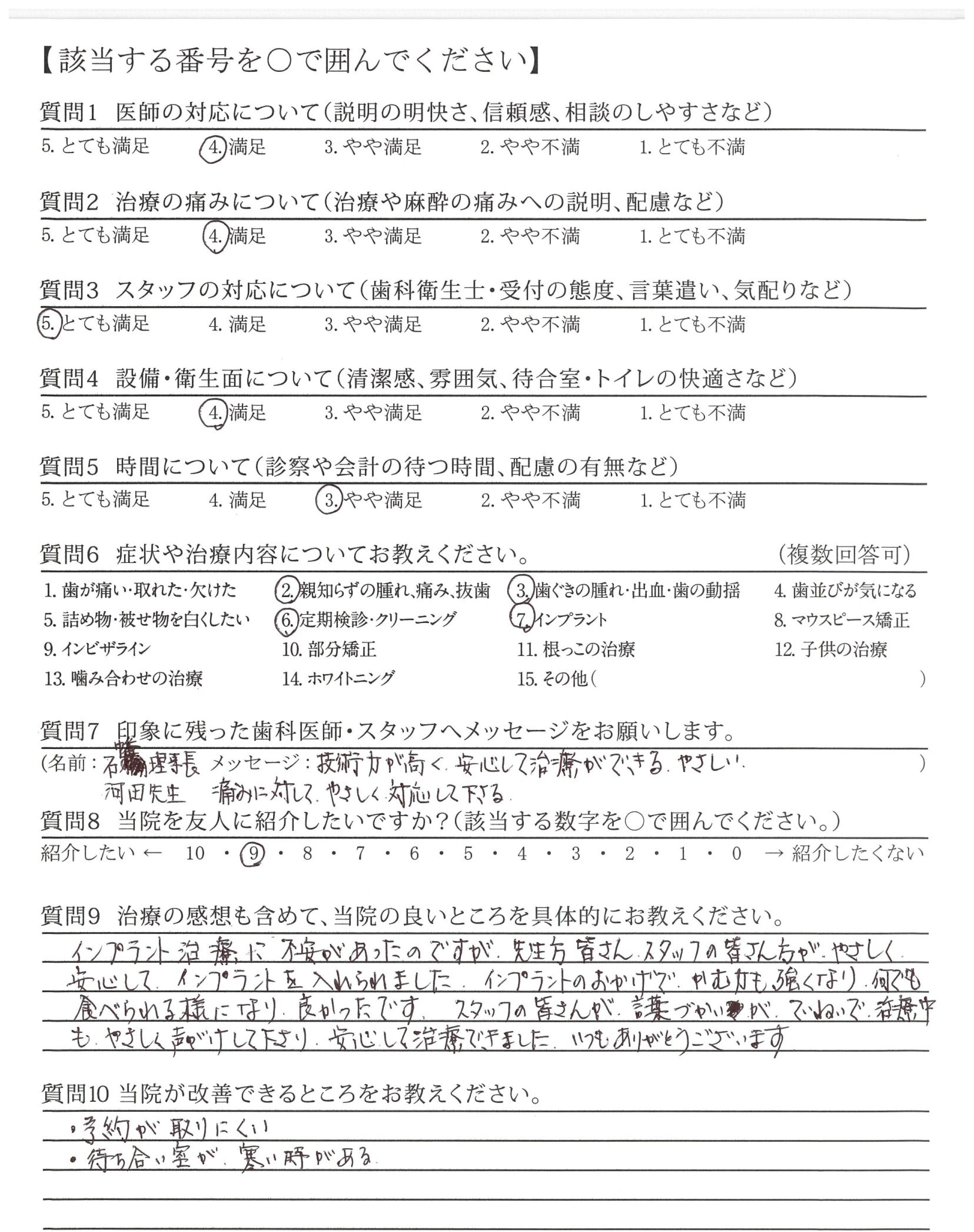 インプラント治療に不安があったのですが、先生方、皆さん、スタッフの皆さん方が、やさしく、安心してインプラントを入れられました。インプラントのおかげで、かむ力も強くなり、何でも食べられる様になり、良かったです。