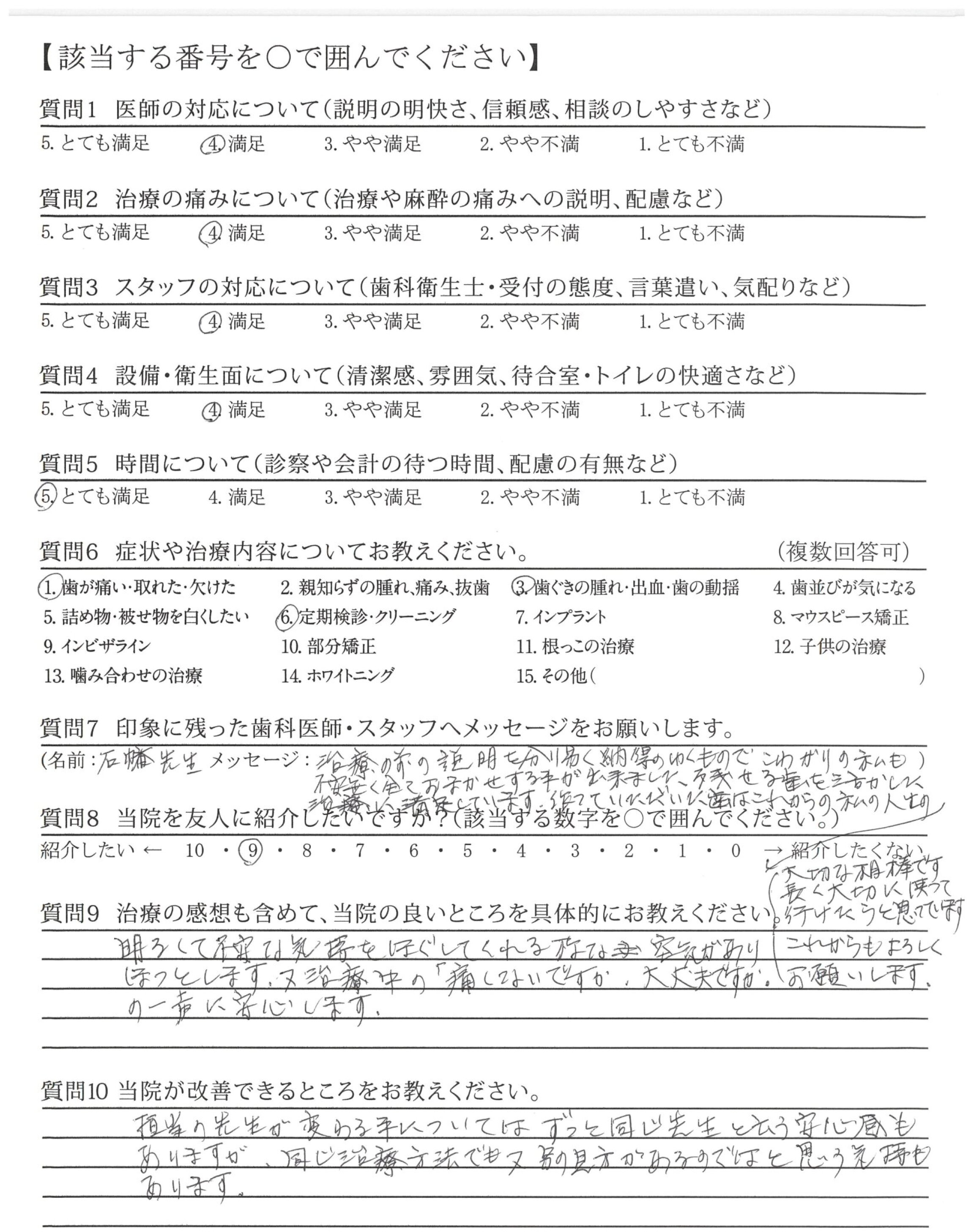 いしはた先生、他のスタッフの方も治療の方針を丁寧に説明してくださり、通院するごとに顎の痛みがなくなりました。