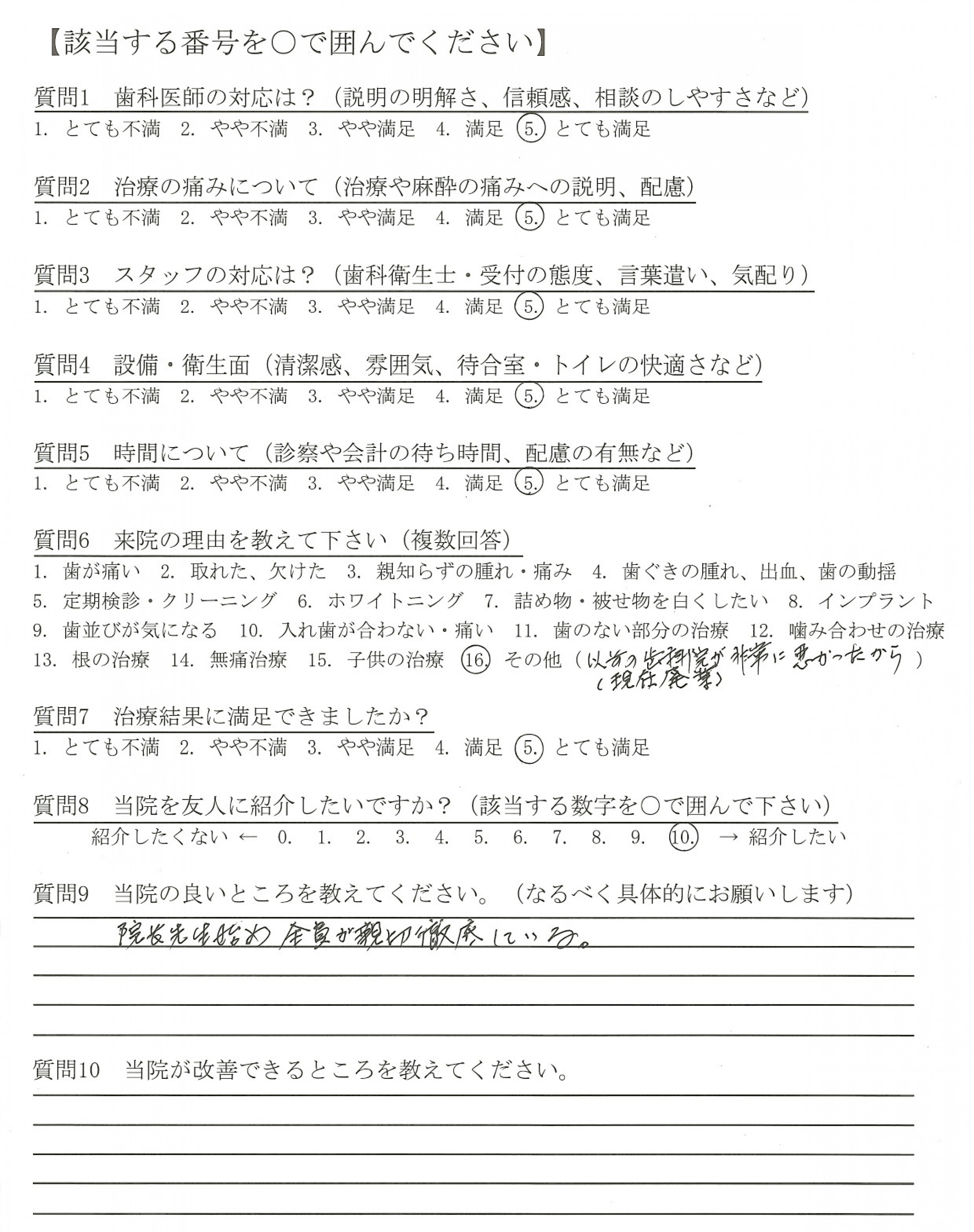 当サイトに掲載しているアンケートは、第三者機関である日本歯科医療評価機構が医院の協力を得て直接患者さんへ調査を行ったもので、医院では操作のできない客観的な評価です。毎週患者さんから届くアンケート結果を集計し、このページを更新しています。