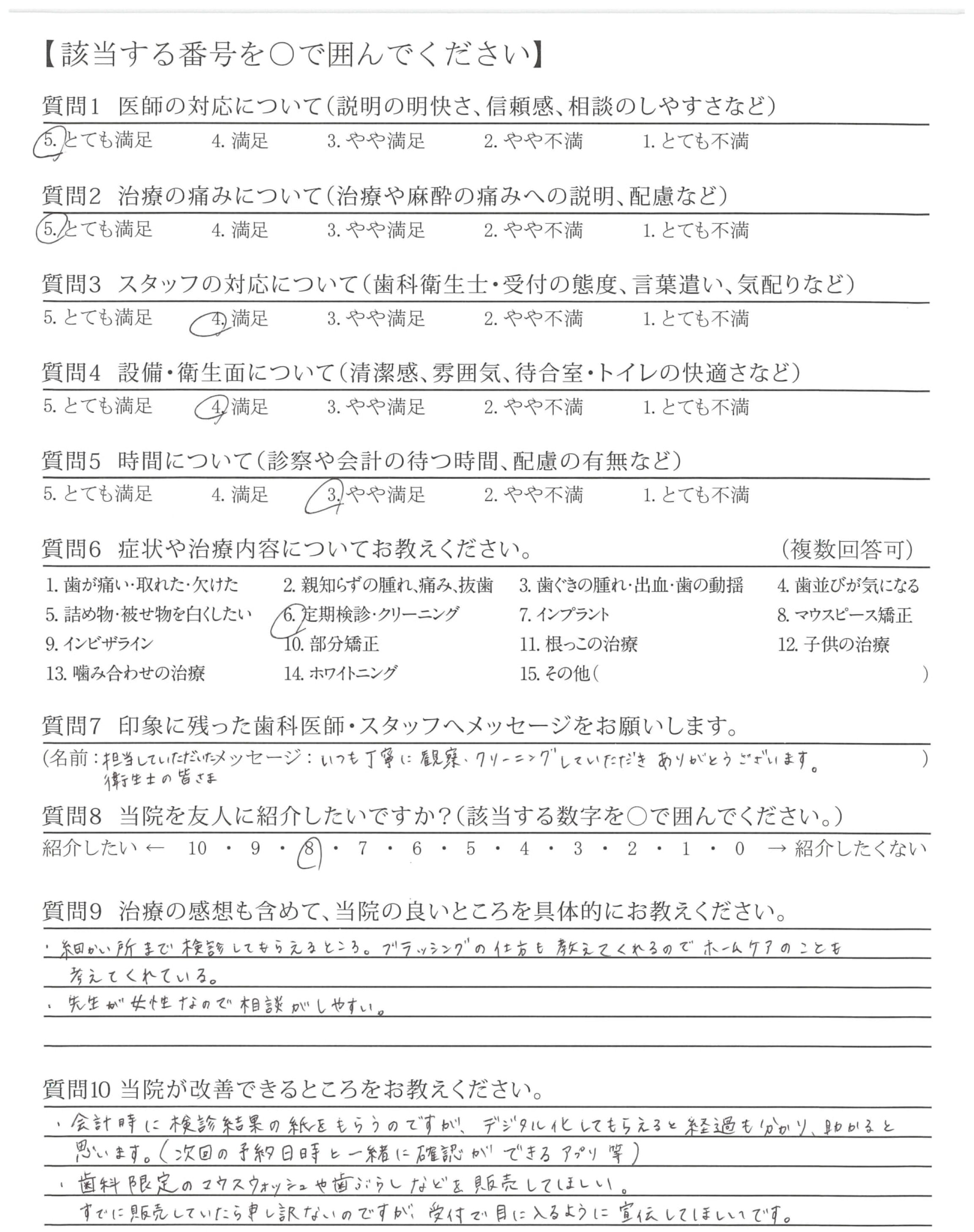 ・会計時に検診結果の紙をもらうのですが、デジタル化してもらえると経過も分かり、助かると思います。(次回の予約日時と一緒に確認ができるアプリ等)