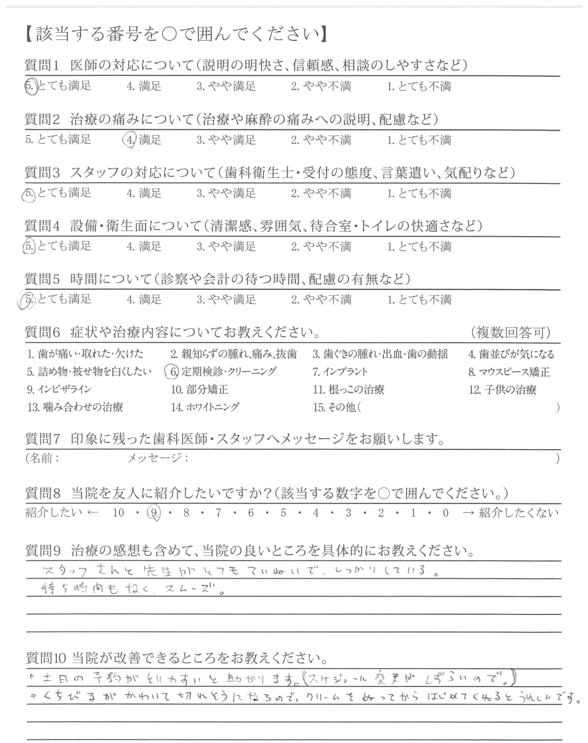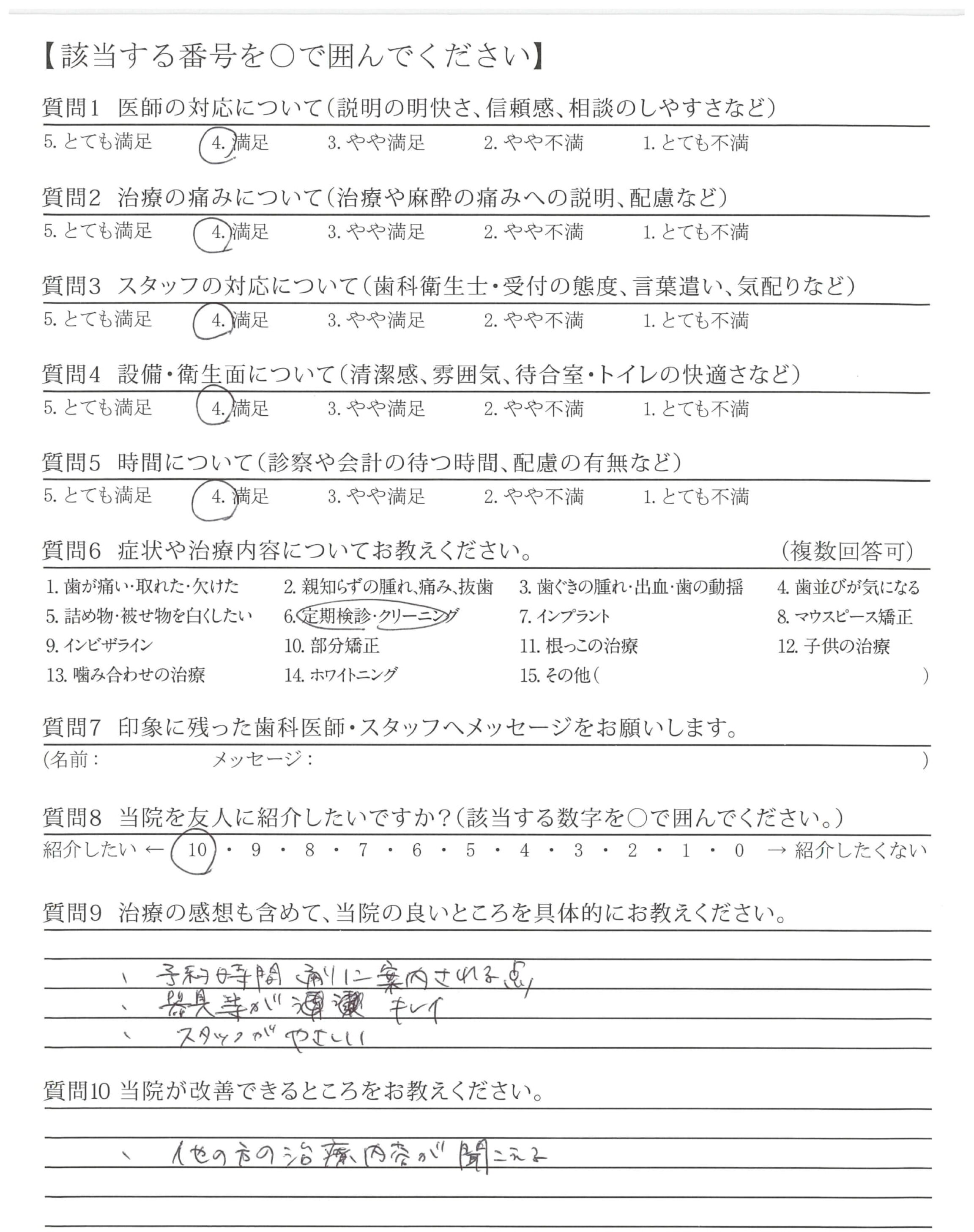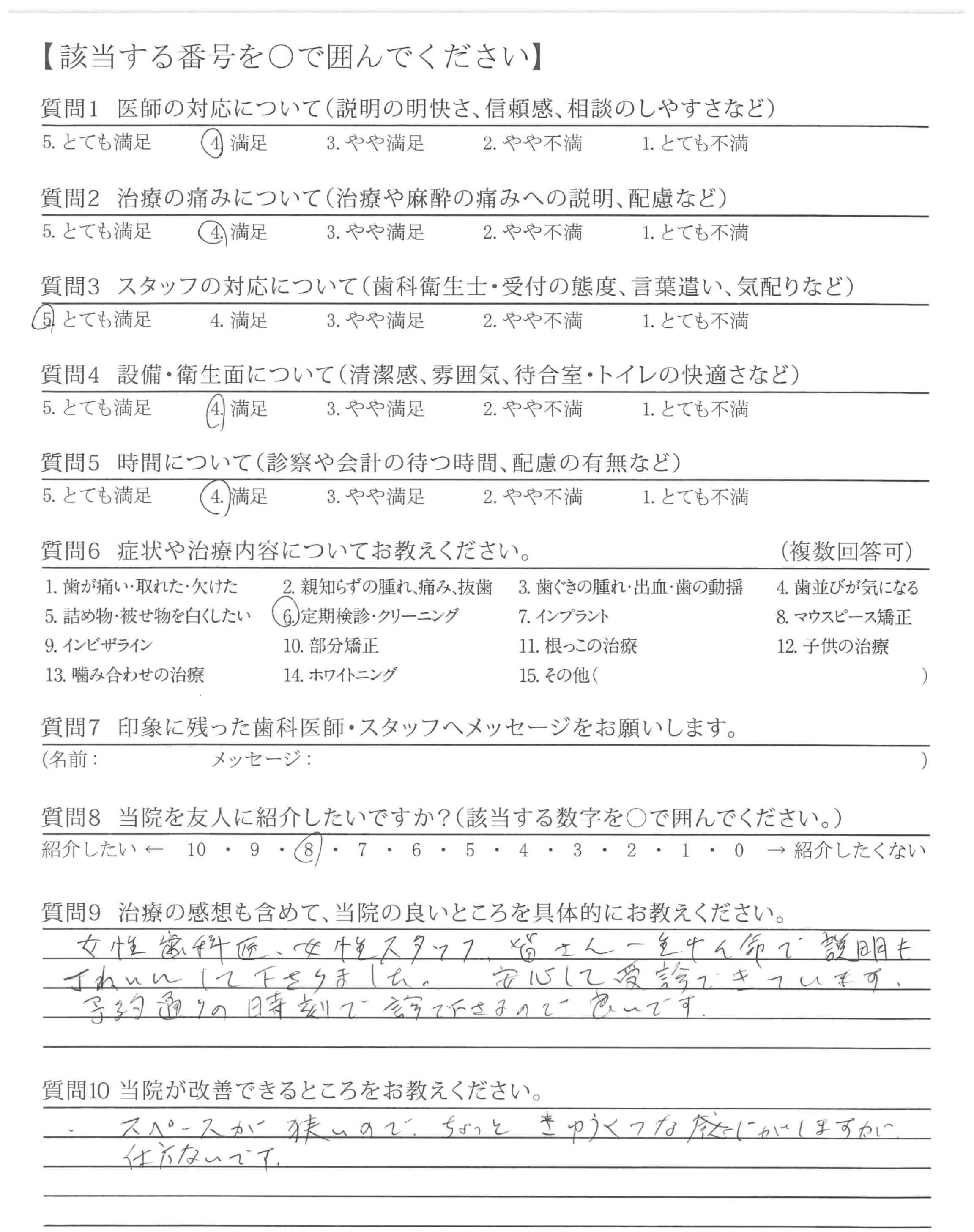 来院してから帰るまでスムーズで先生や、衛生士さん、受付スタッフさんもとても対応が良かったです。