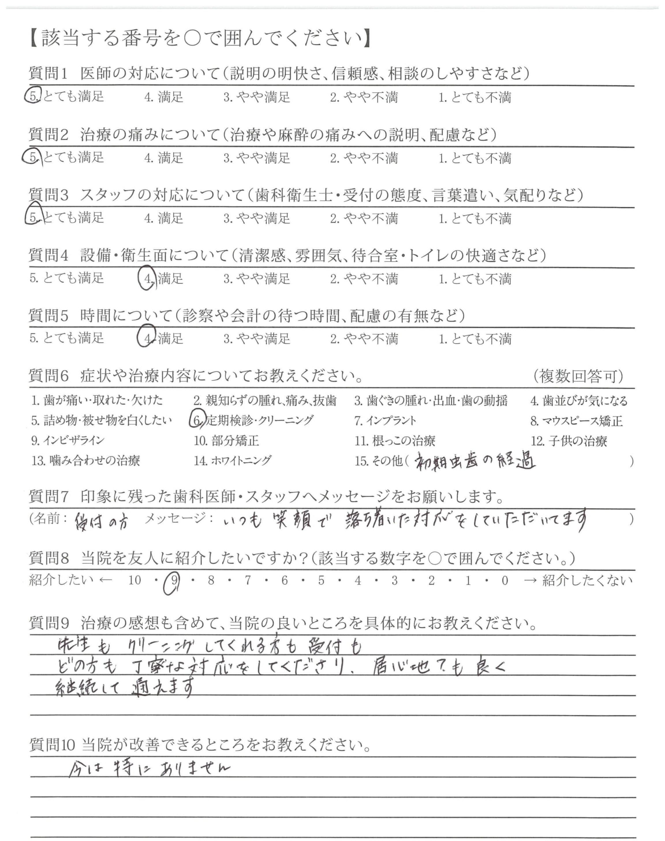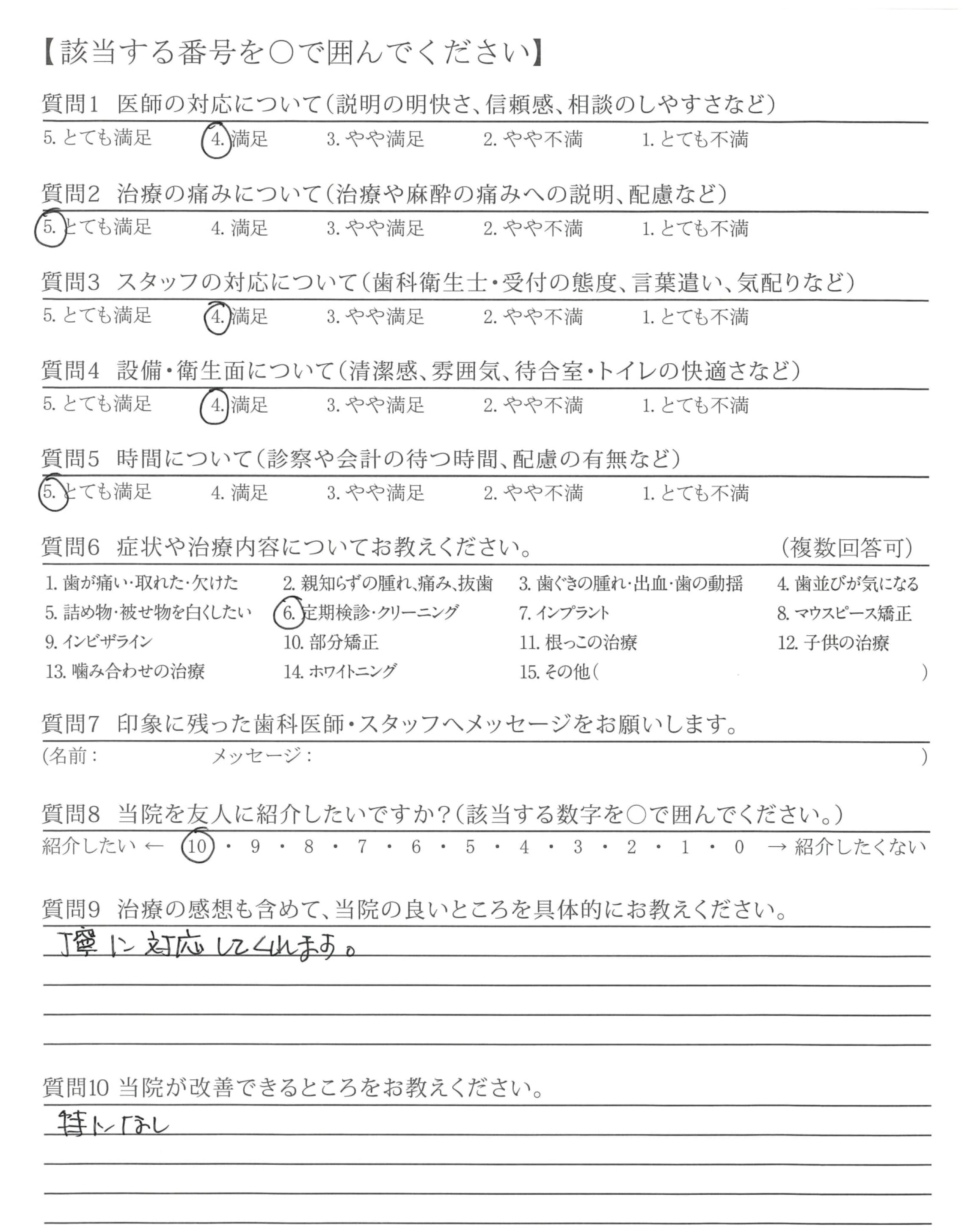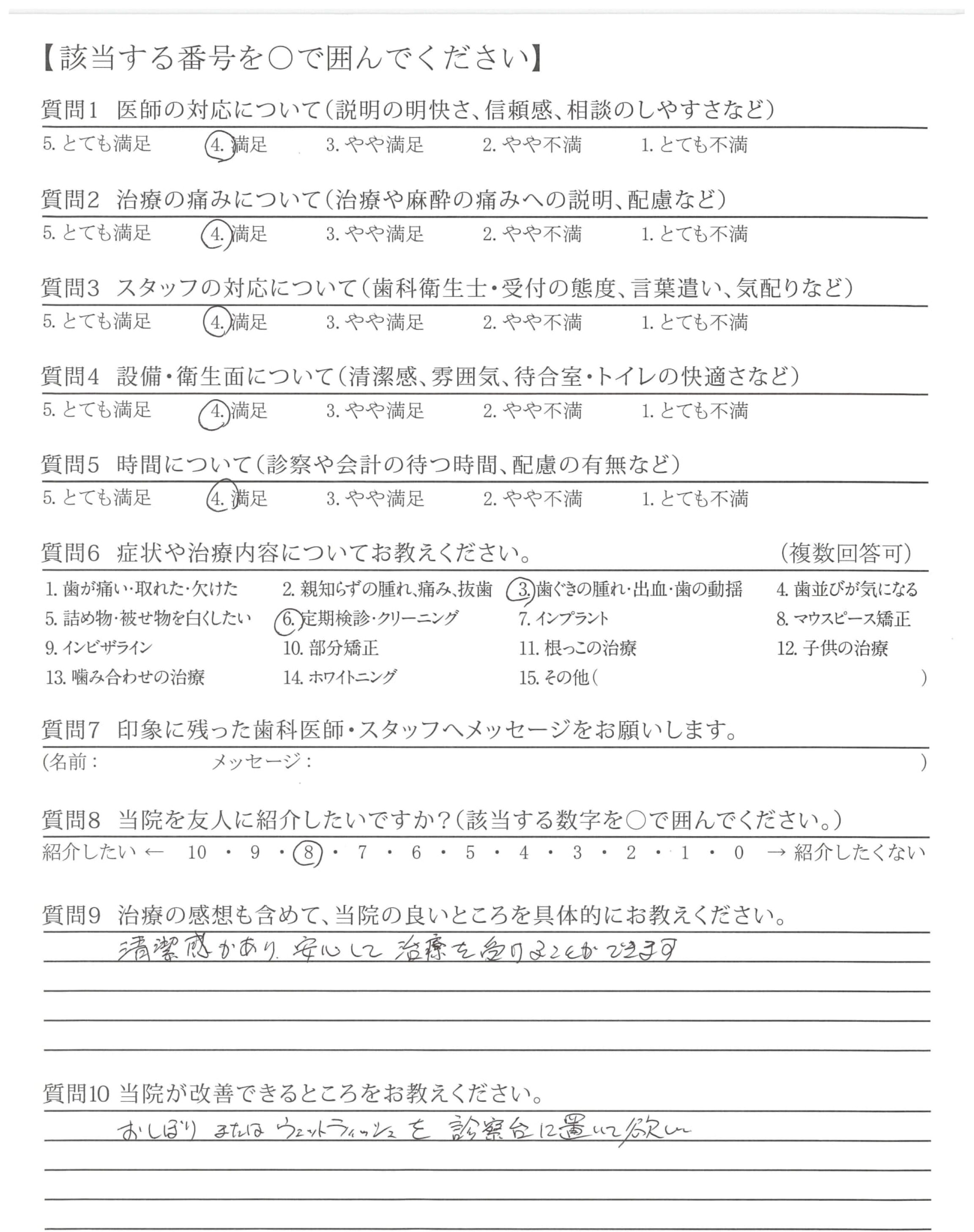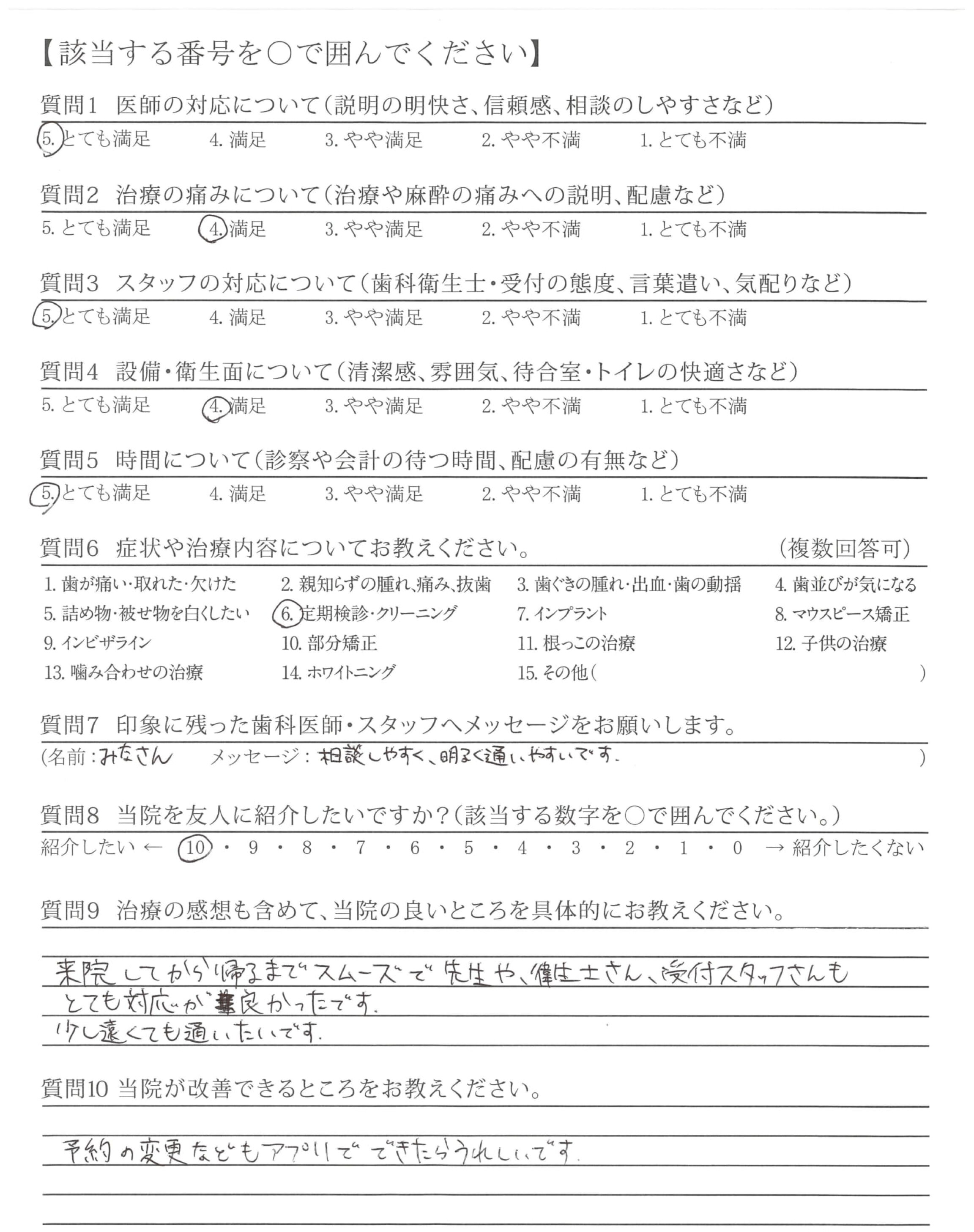 来院してから帰るまでスムーズで先生や、衛生士さん、受付スタッフさんもとても対応が良かったです。