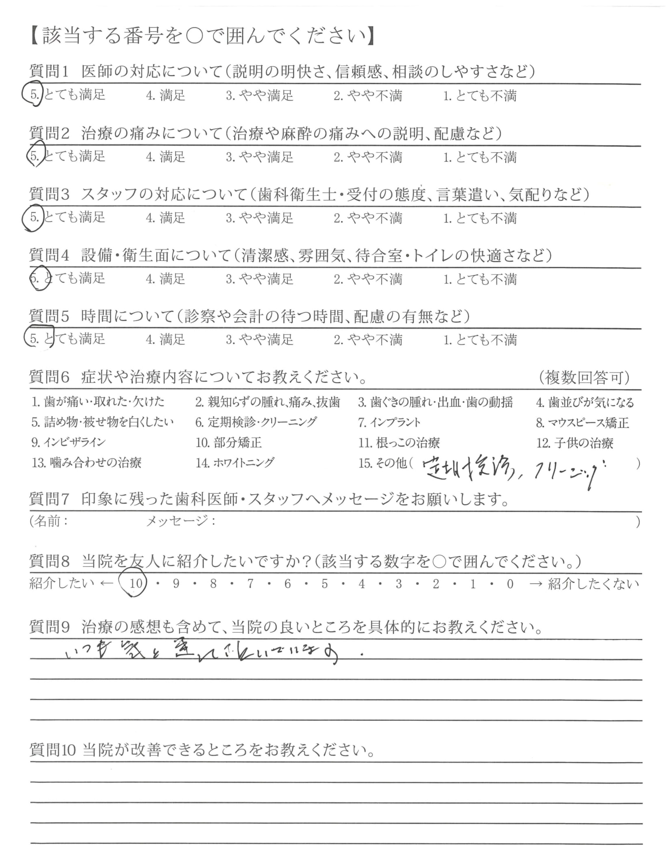 先生もクリーニングしてくれる方も受付もどの方も丁寧な対応をしてくださり、居心地も良く継続して通えます