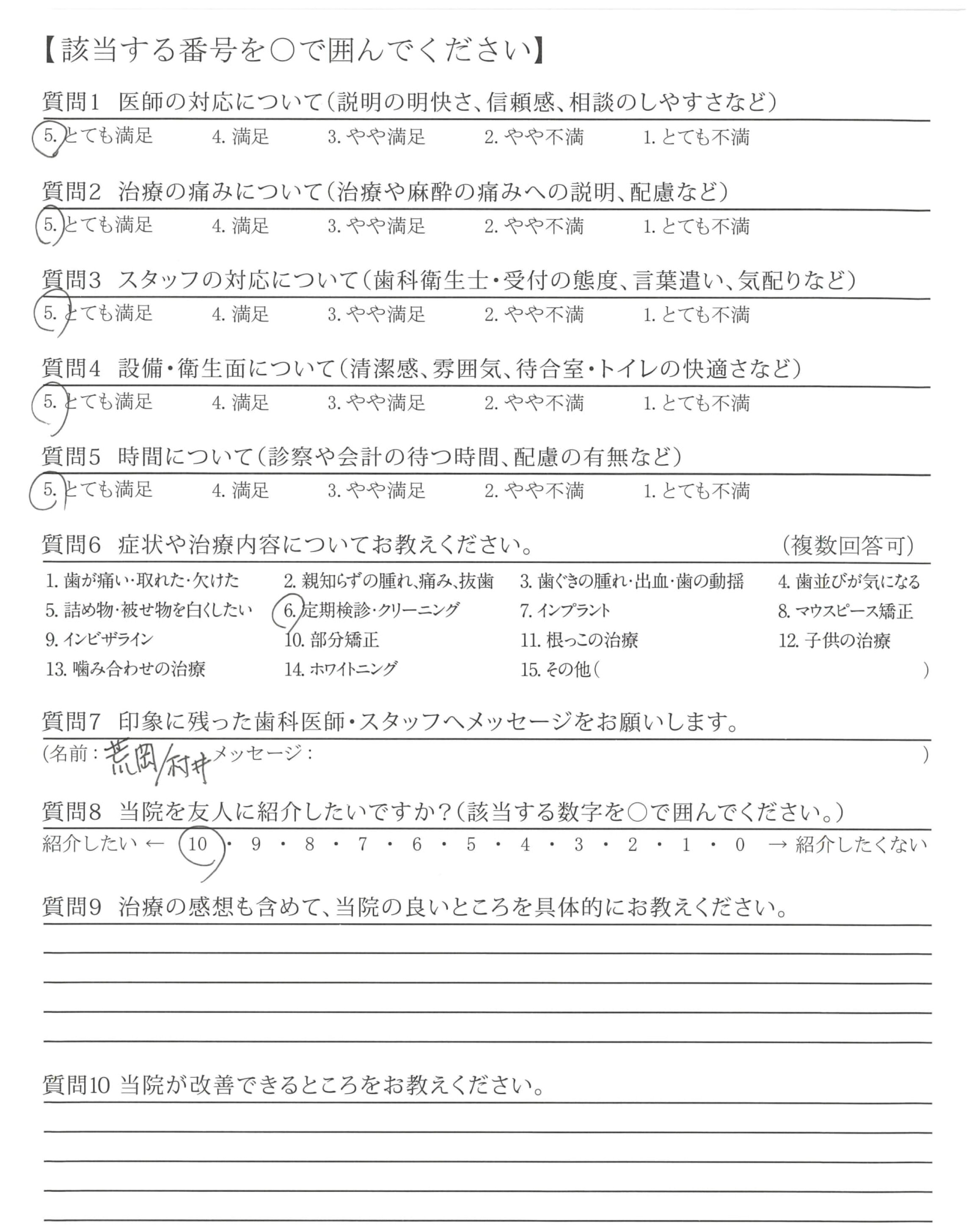 荒岡先生は常に適格な治療方針の説明、または対応方法を指示くださり感謝いたしております。