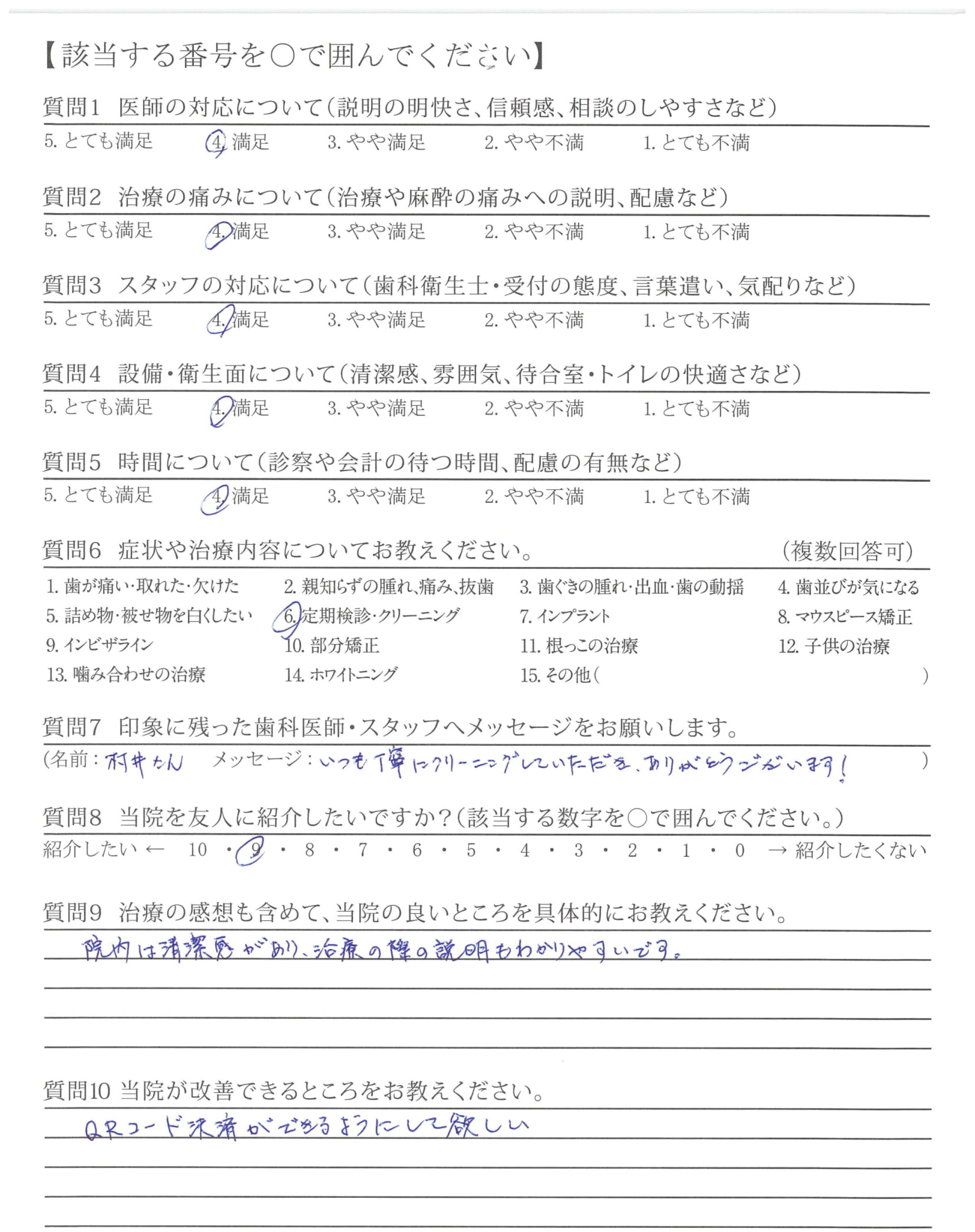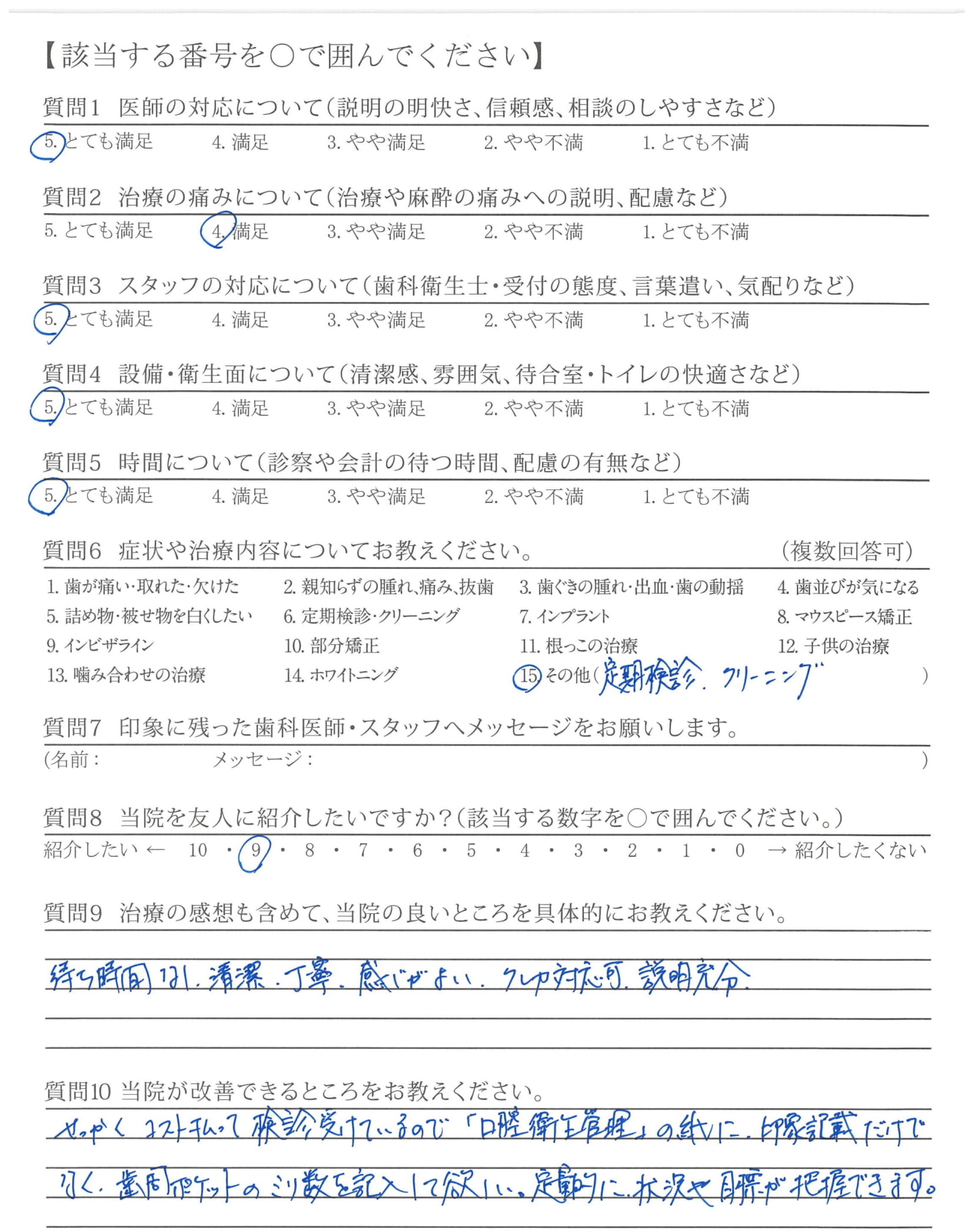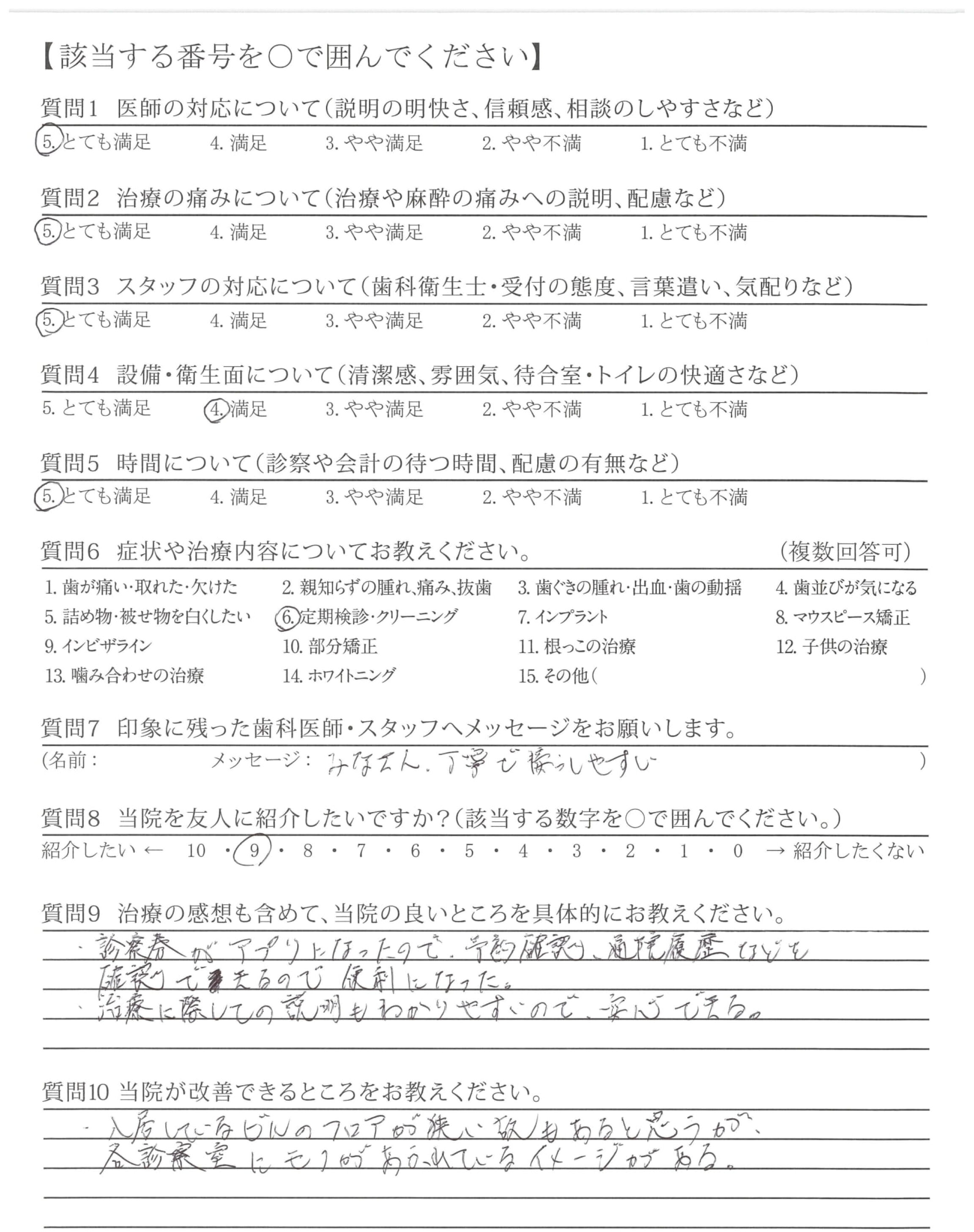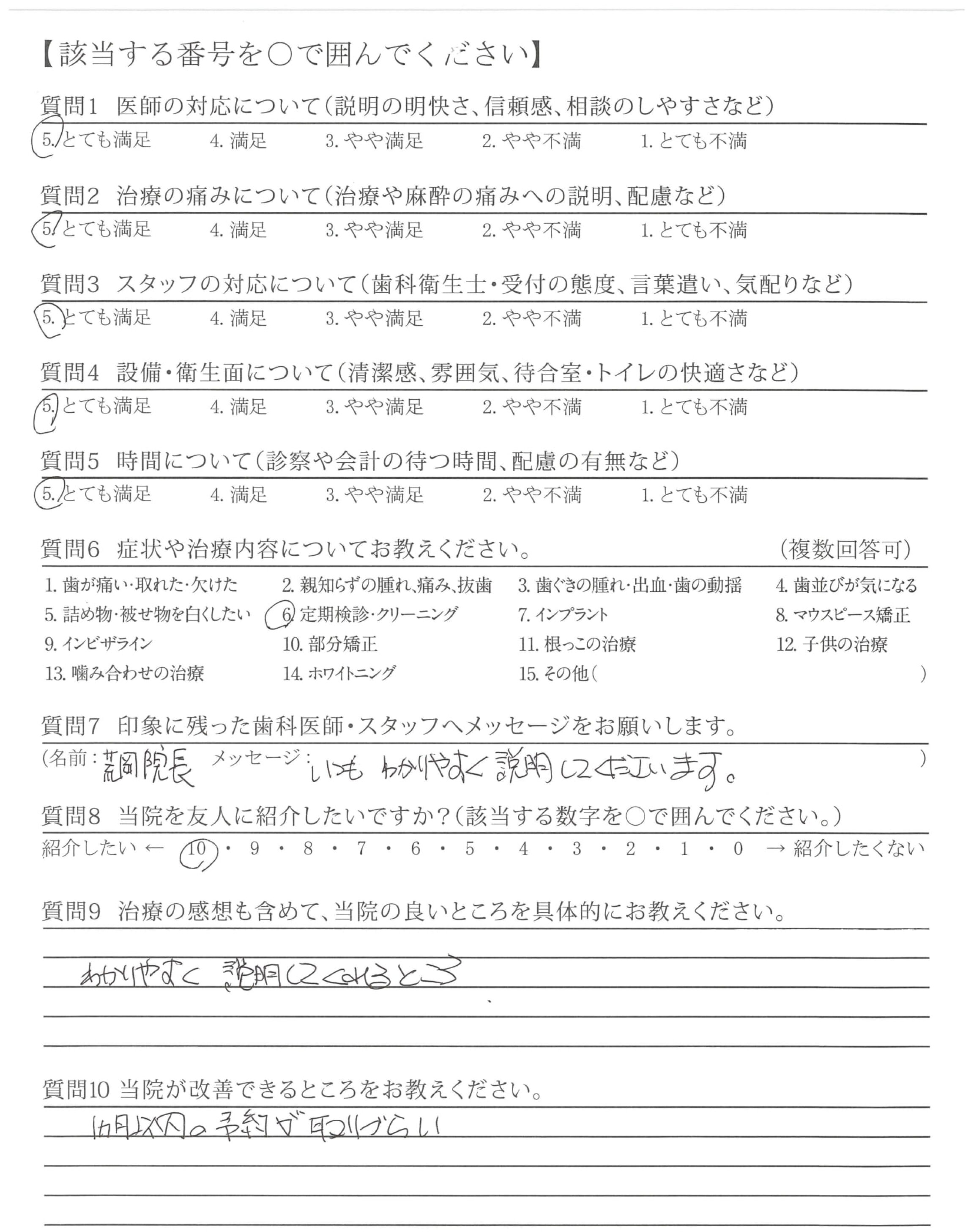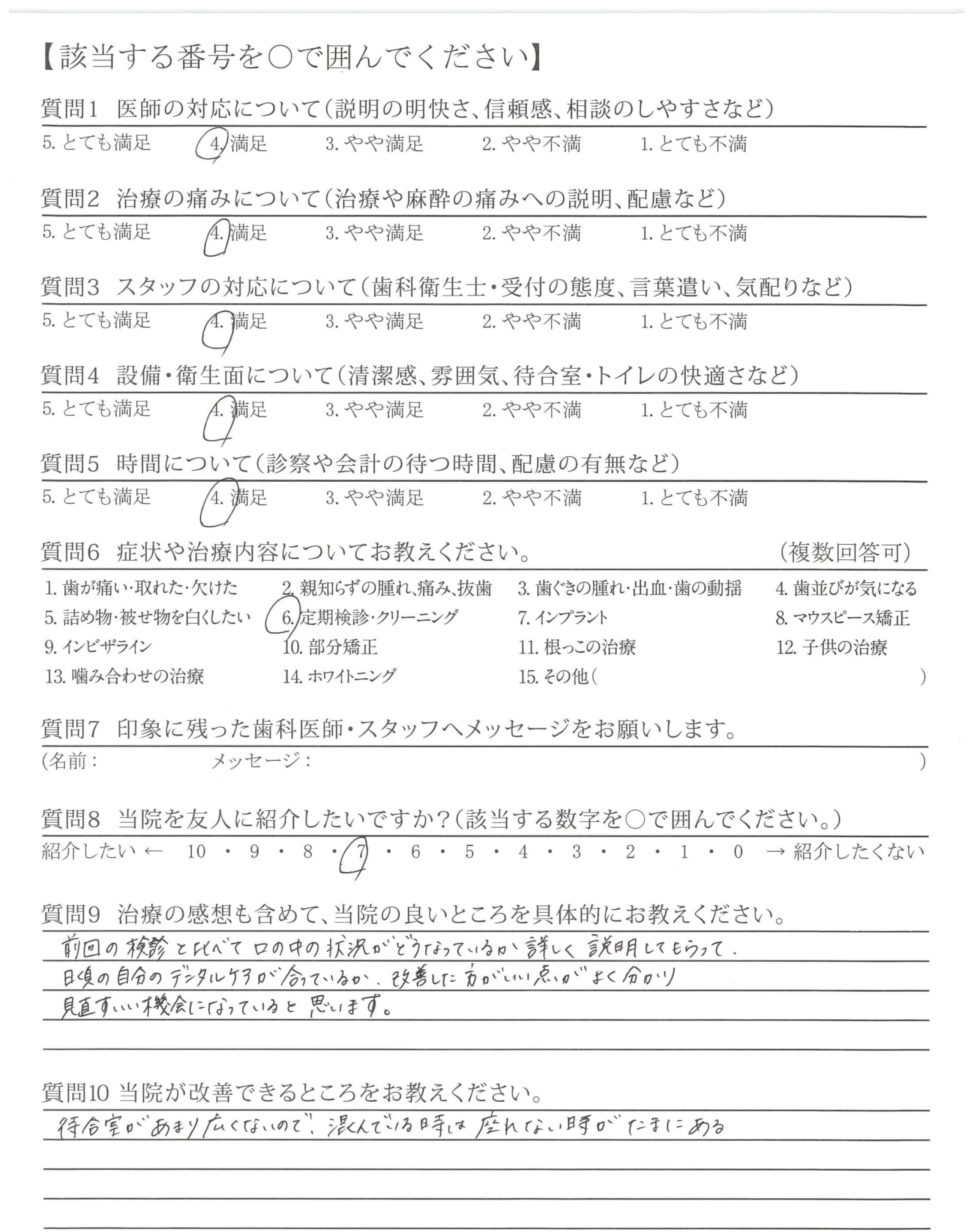 前回の検診と比べて口の中の状況がどうなっているか詳しく説明してもらって、日頃の自分のデンタルケアが合っているか、改善した方がいい点がよく分かり見直すいい機会になっていると思います。