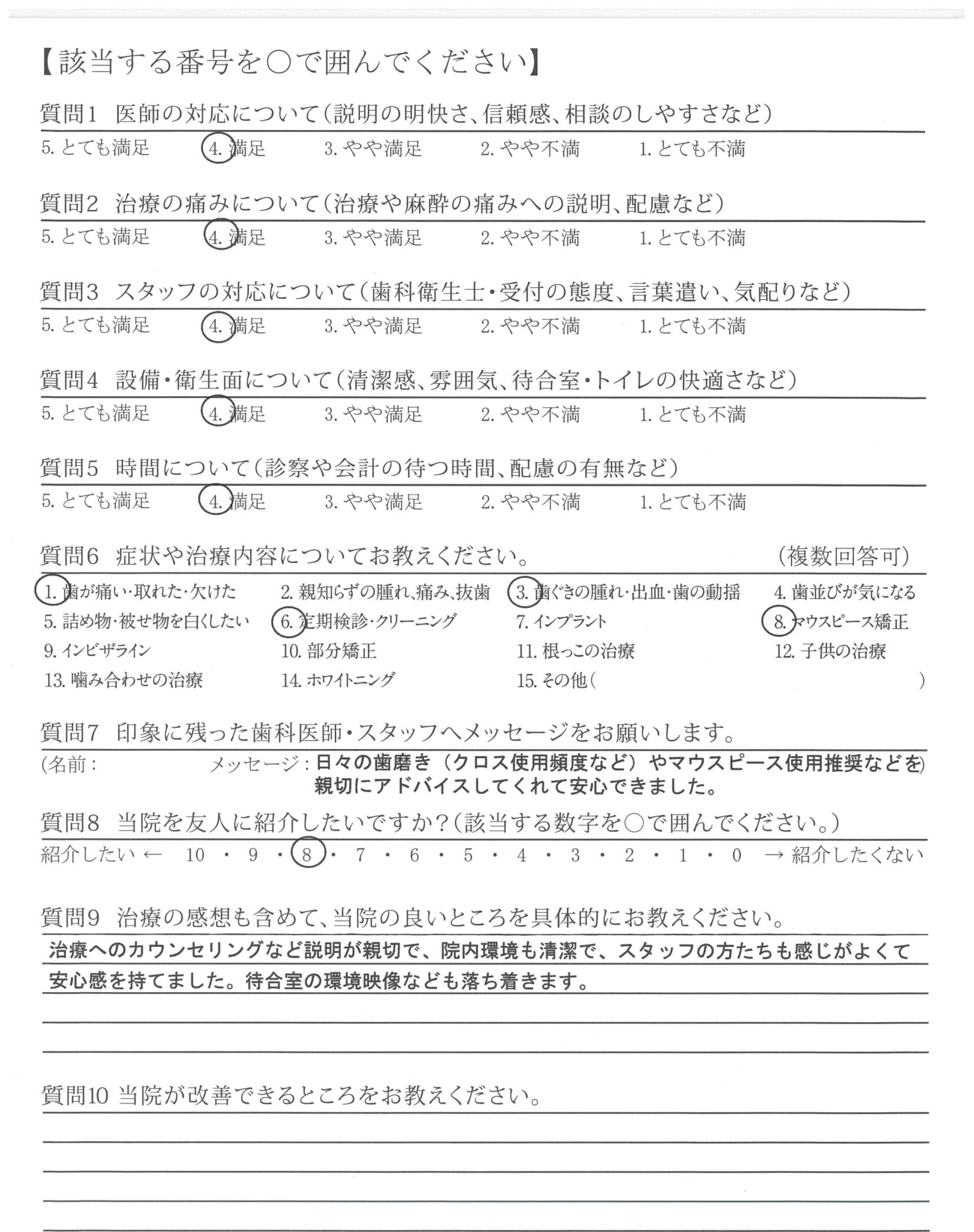 日々の歯磨き(クロス使用頻度など)やマウスピース使用推奨などを親切にアドバイスしてくれて安心できました。