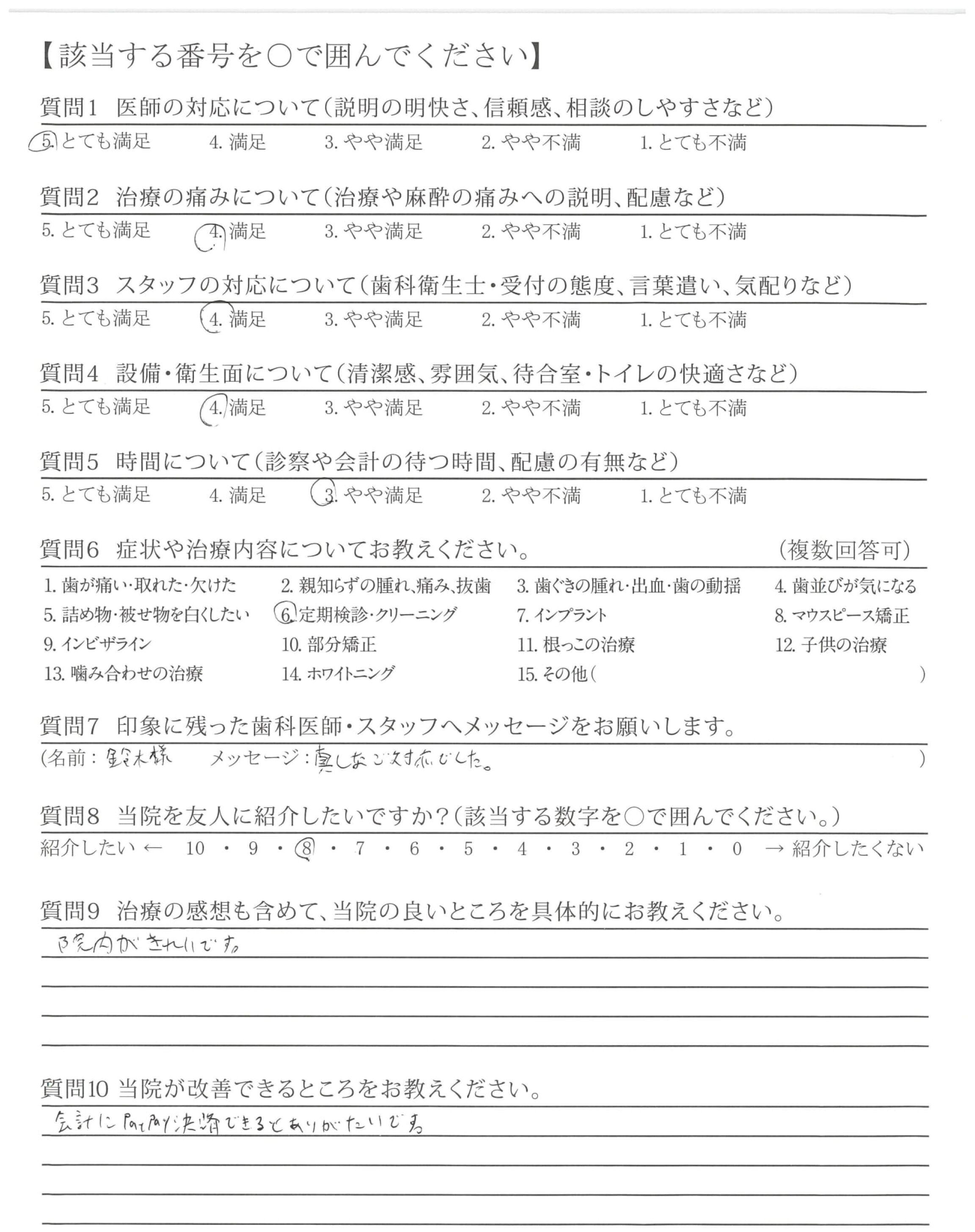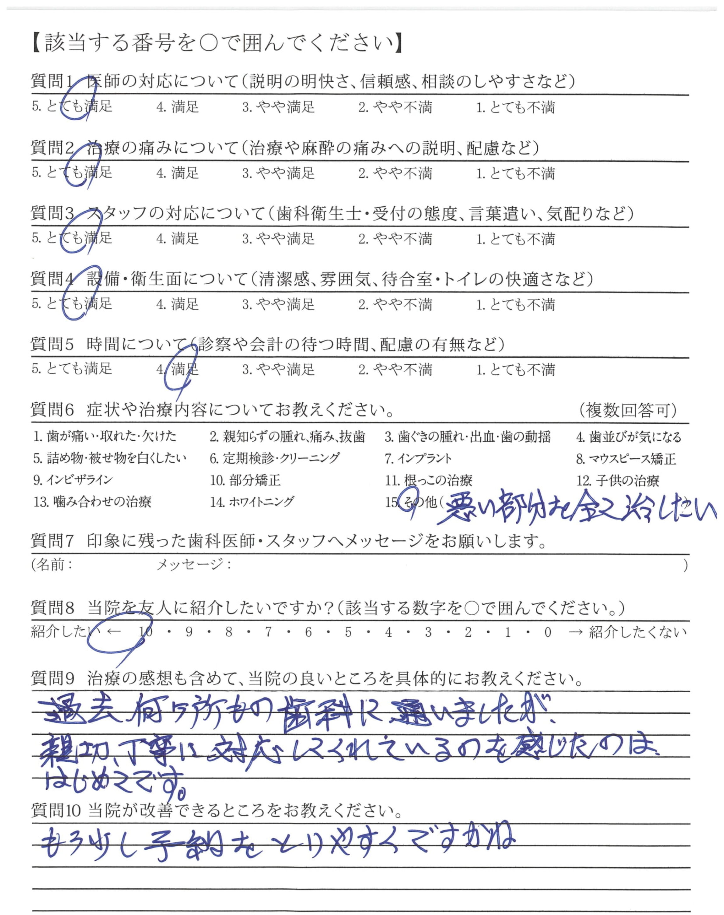 いつも丁寧な説明と辛くない様に配慮した治療で助かっております。