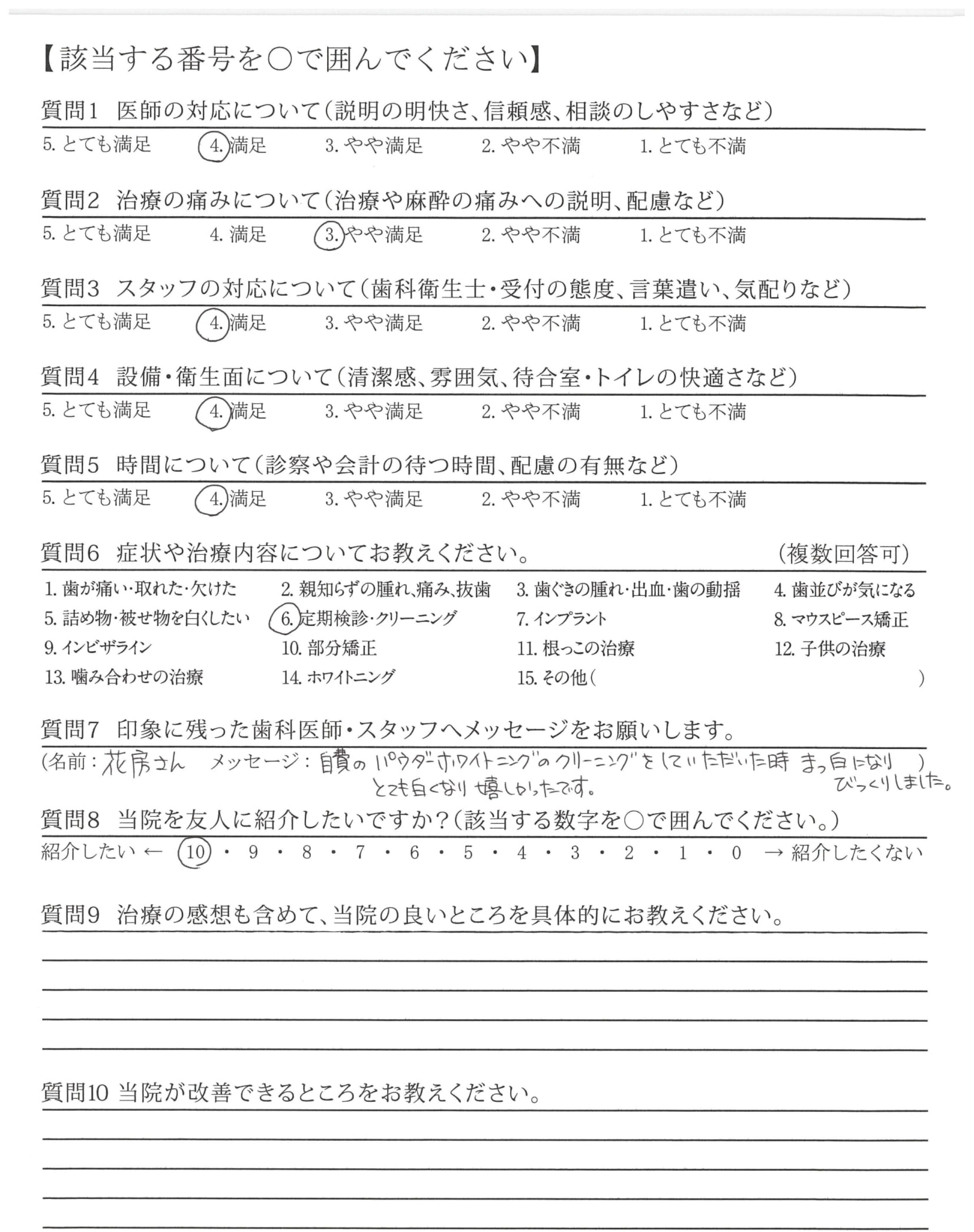 自費のパウダーホワイトニングのクリーニングをしていただいた時まっ白になりびっくりしました。とても白くなり嬉しかったです。