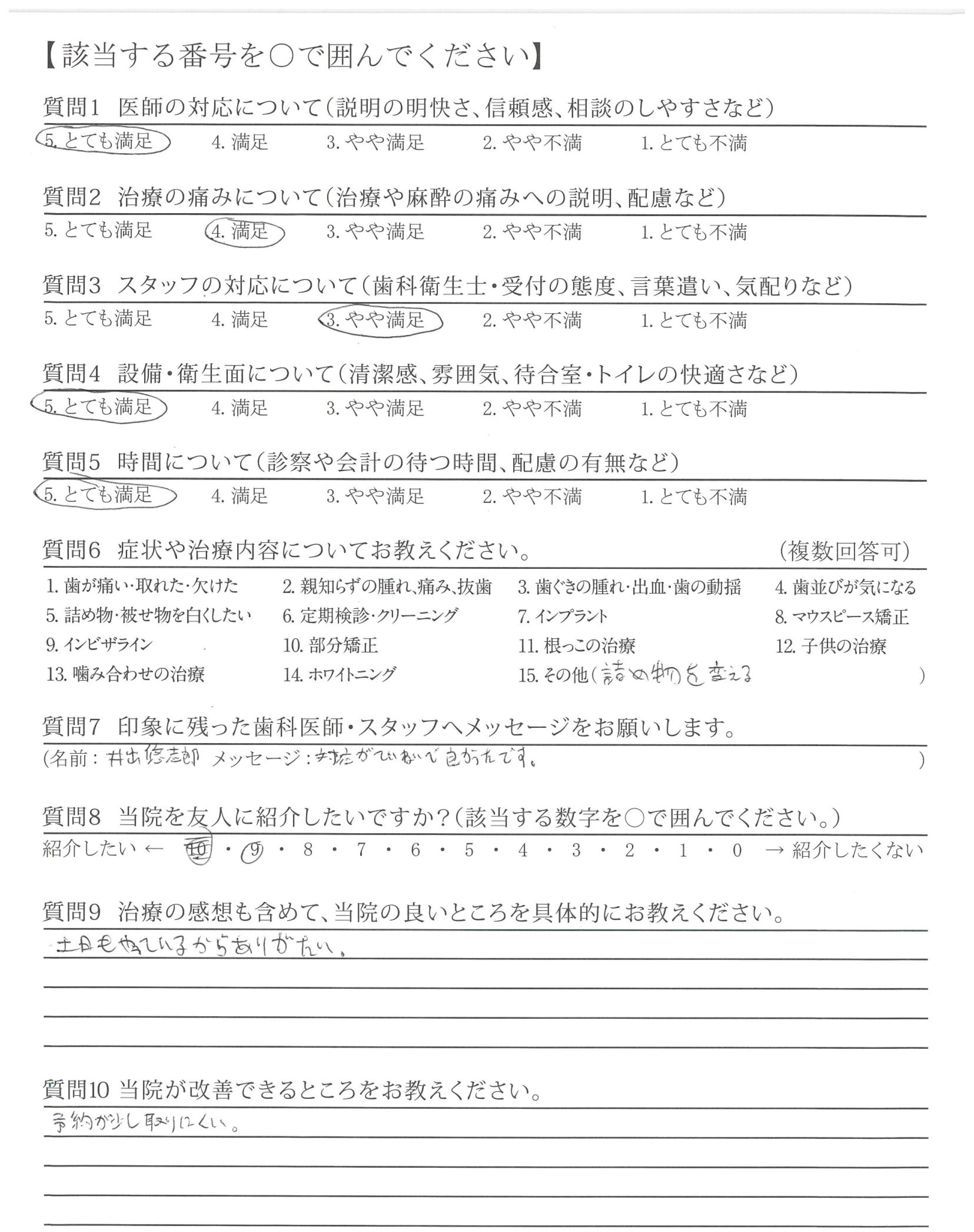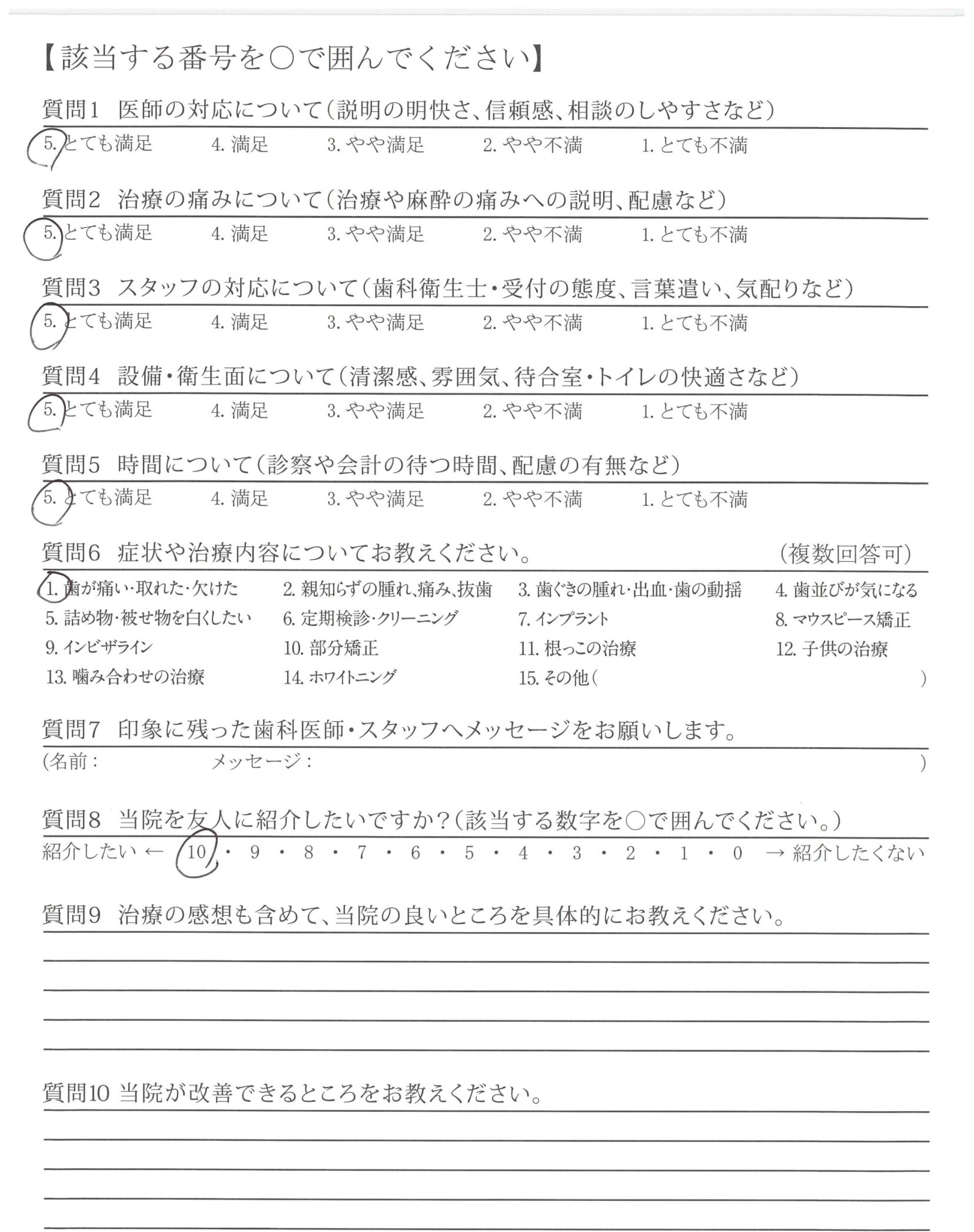 ・治療が終った後、他に気になる事がないか聞いてほしい。(私は歯並びが気になっているが急がしそうにしており、その話がなかなかできない)