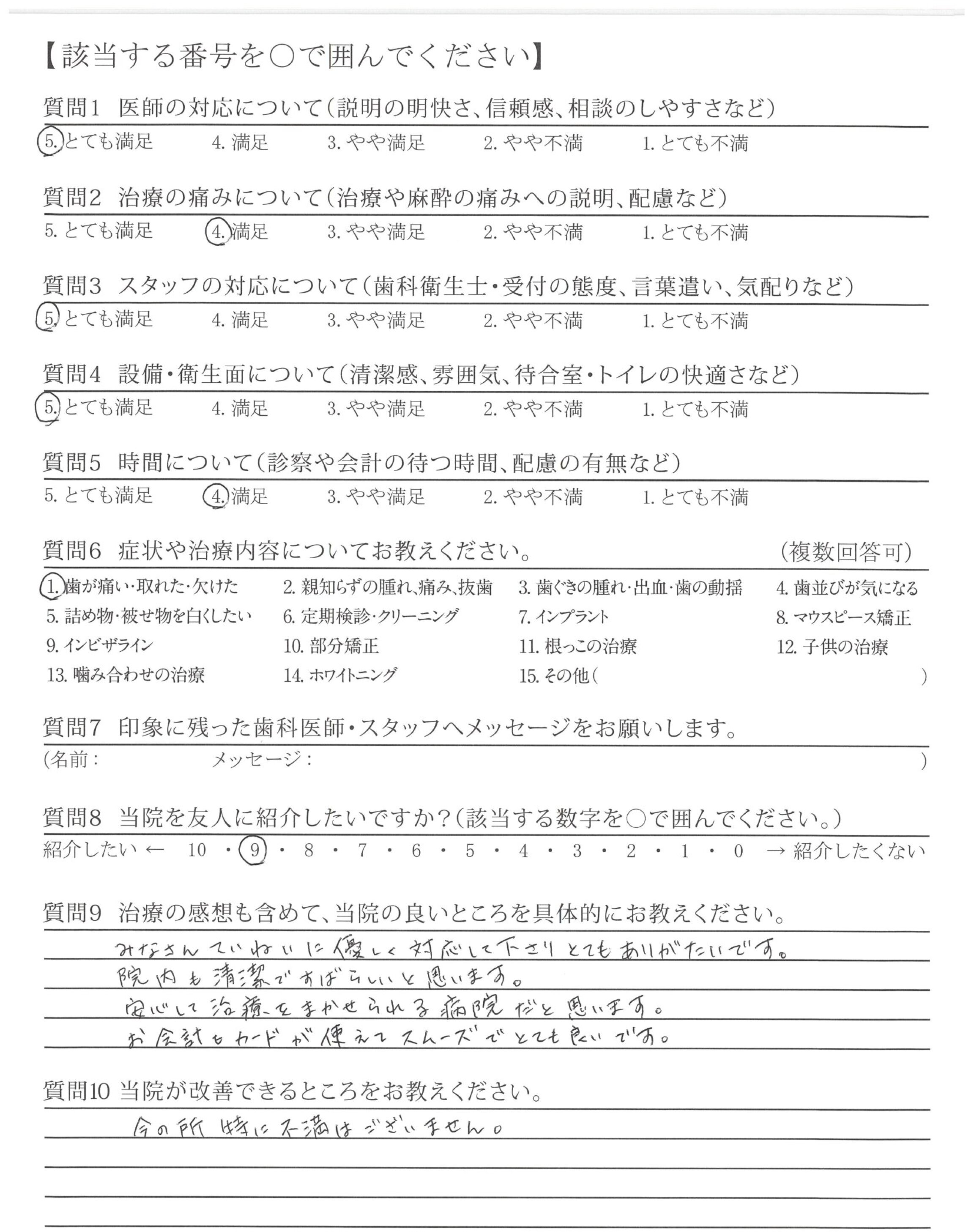 親知らずの抜歯をしてもらいましたが、麻酔を適且足してくれ少ない痛みで処置していただきました。ご対応ありがとうございました。