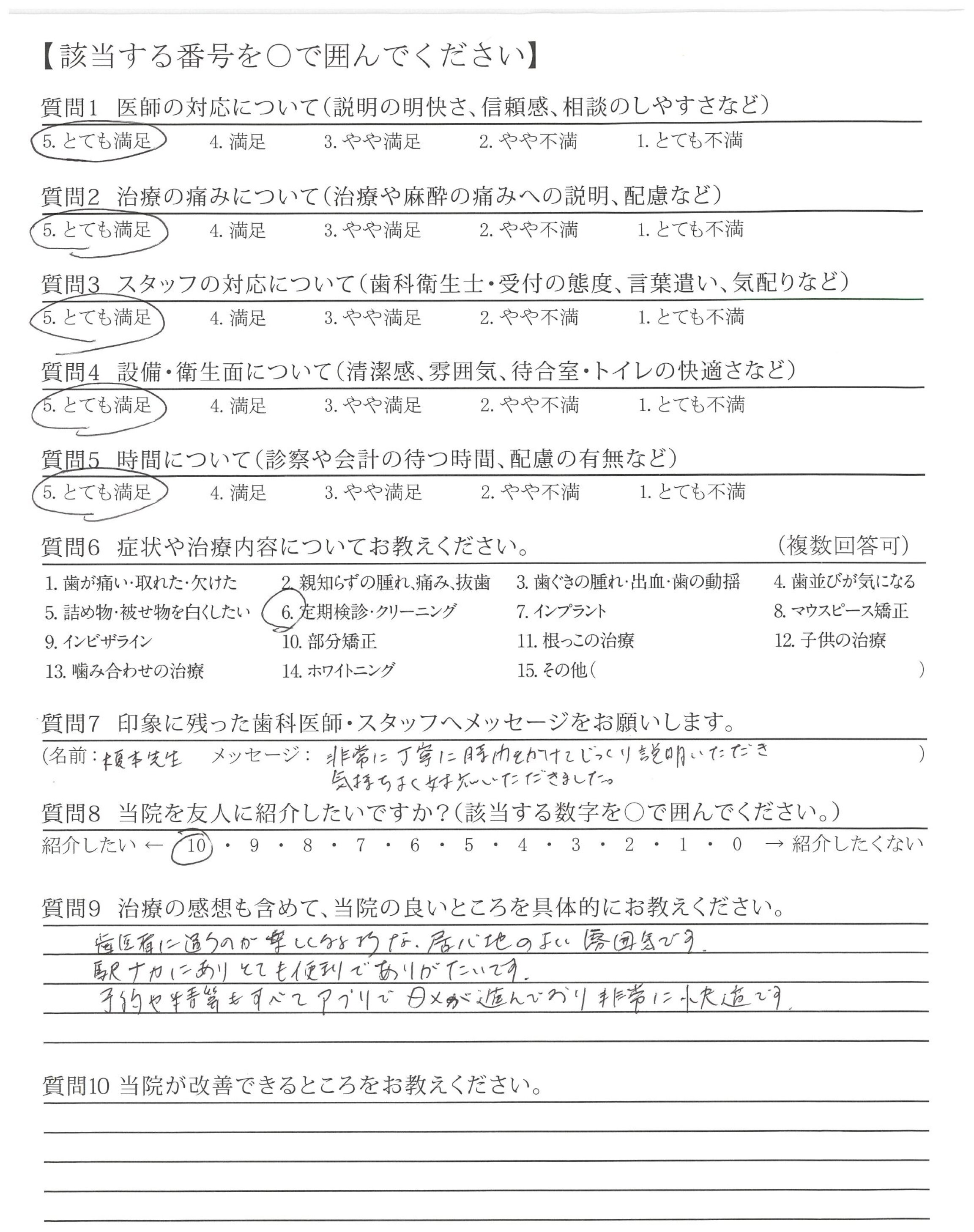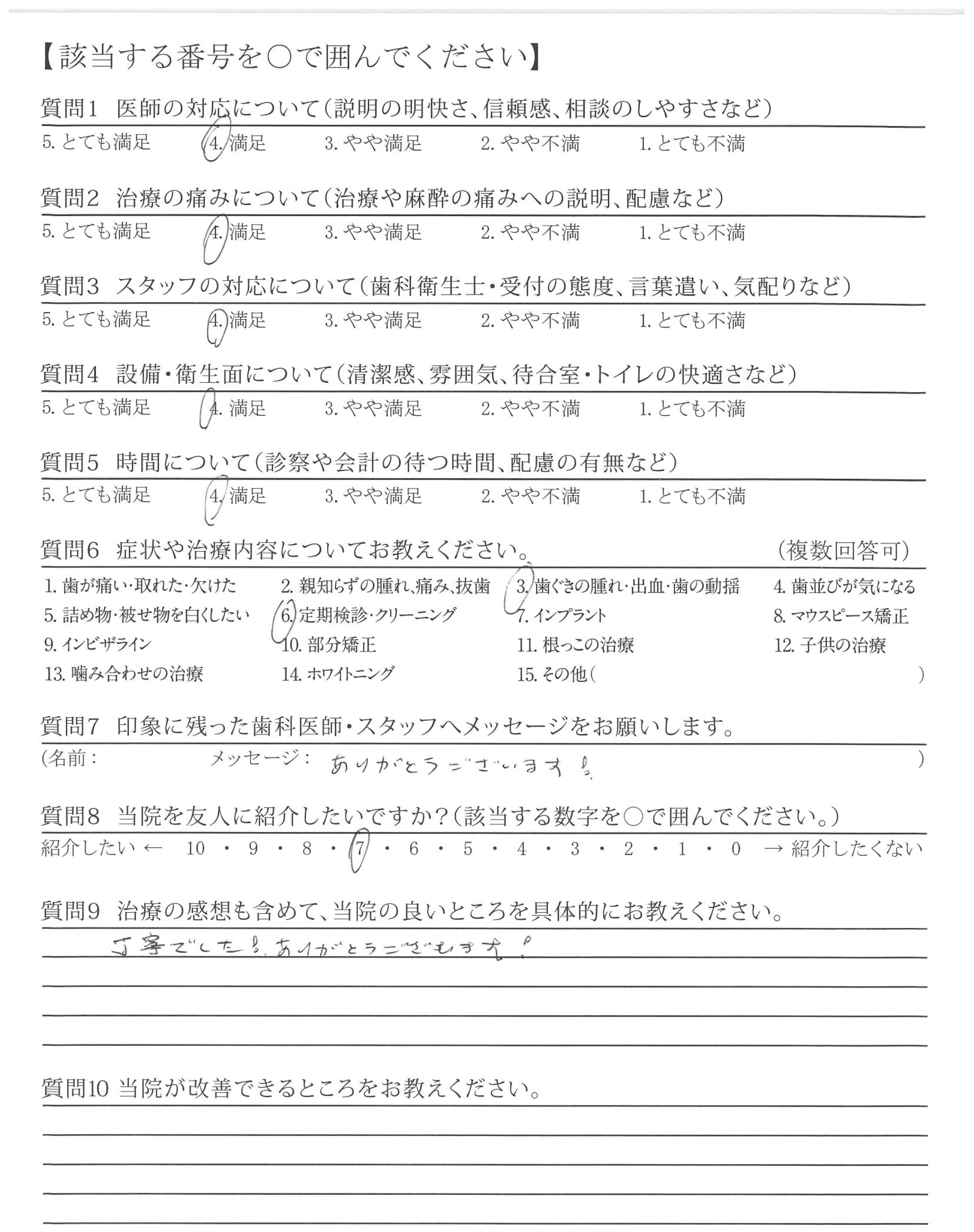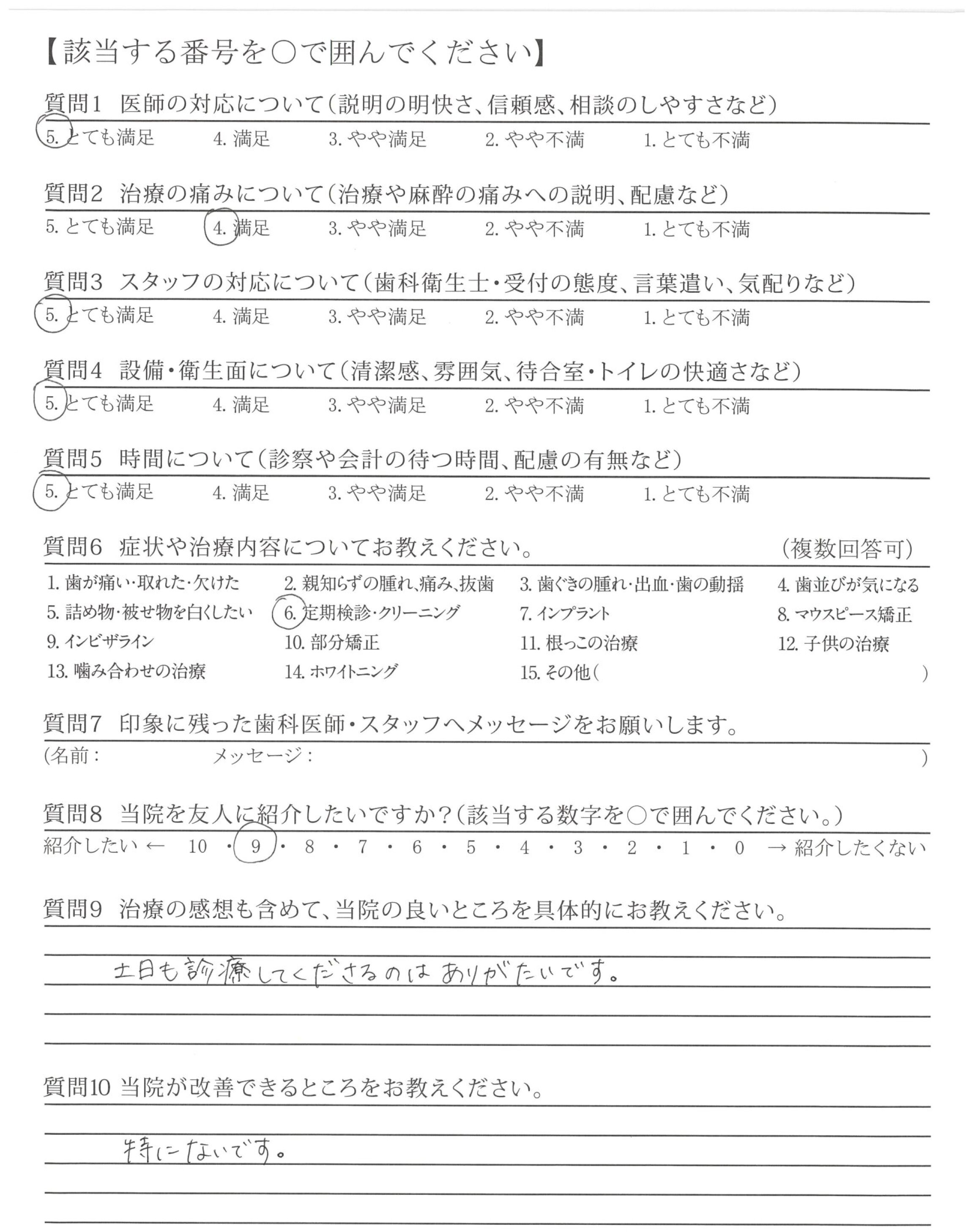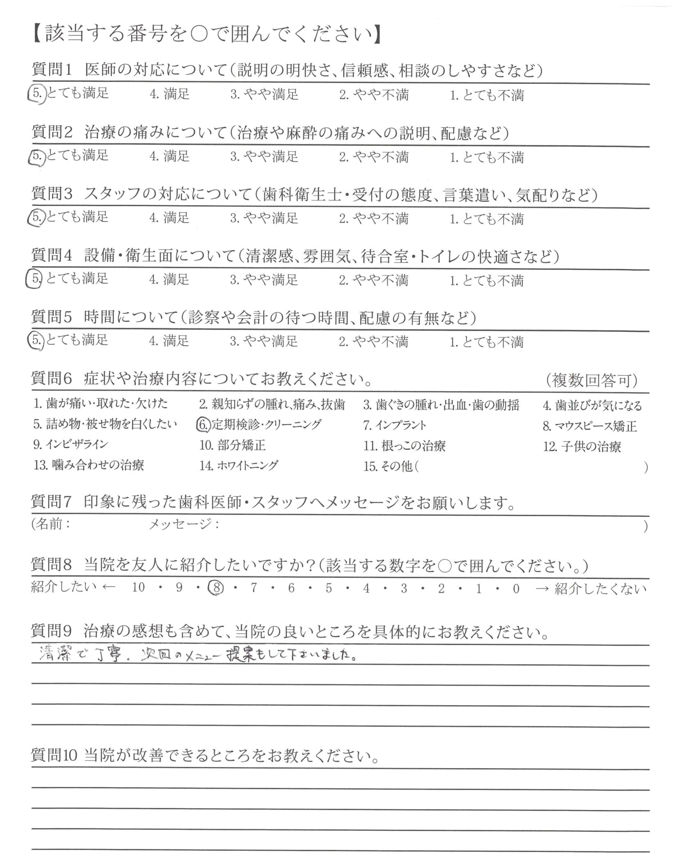 治療及びクリーニングの手際が大変よく、いい歯医者さんにめぐりあえて良かったです。