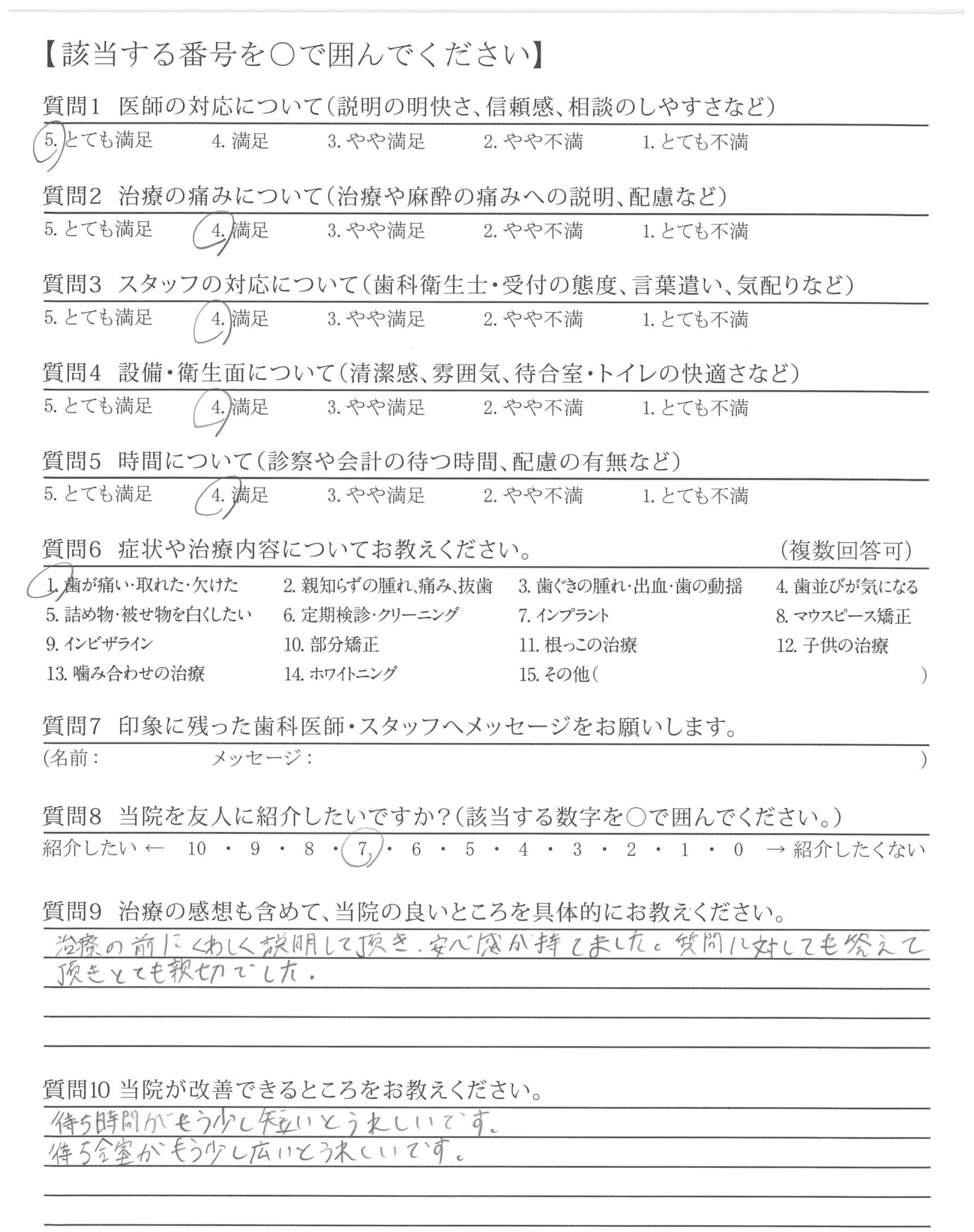 治療の前にくわしく説明して頂き、安心感が持てました。質問に対しても答えて頂きとても親切でした。