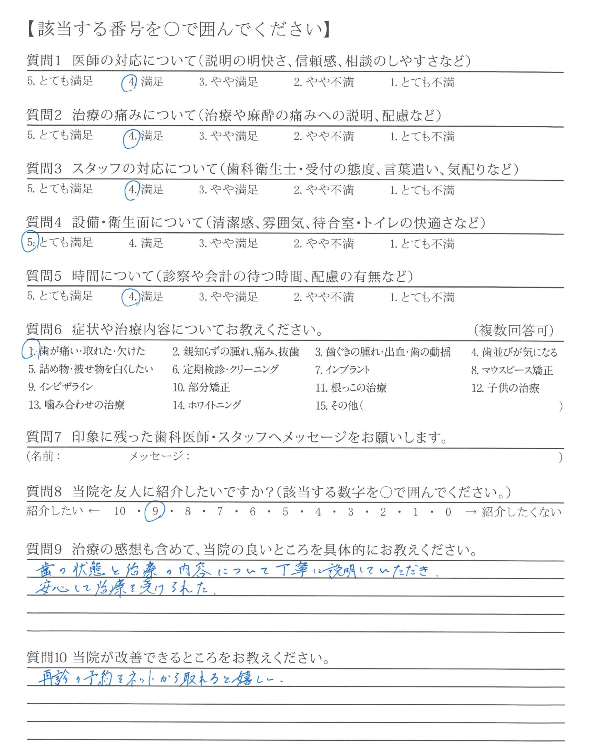 歯の状態と治療の内容について丁寧に説明していただき、安心して治療を受けられた。