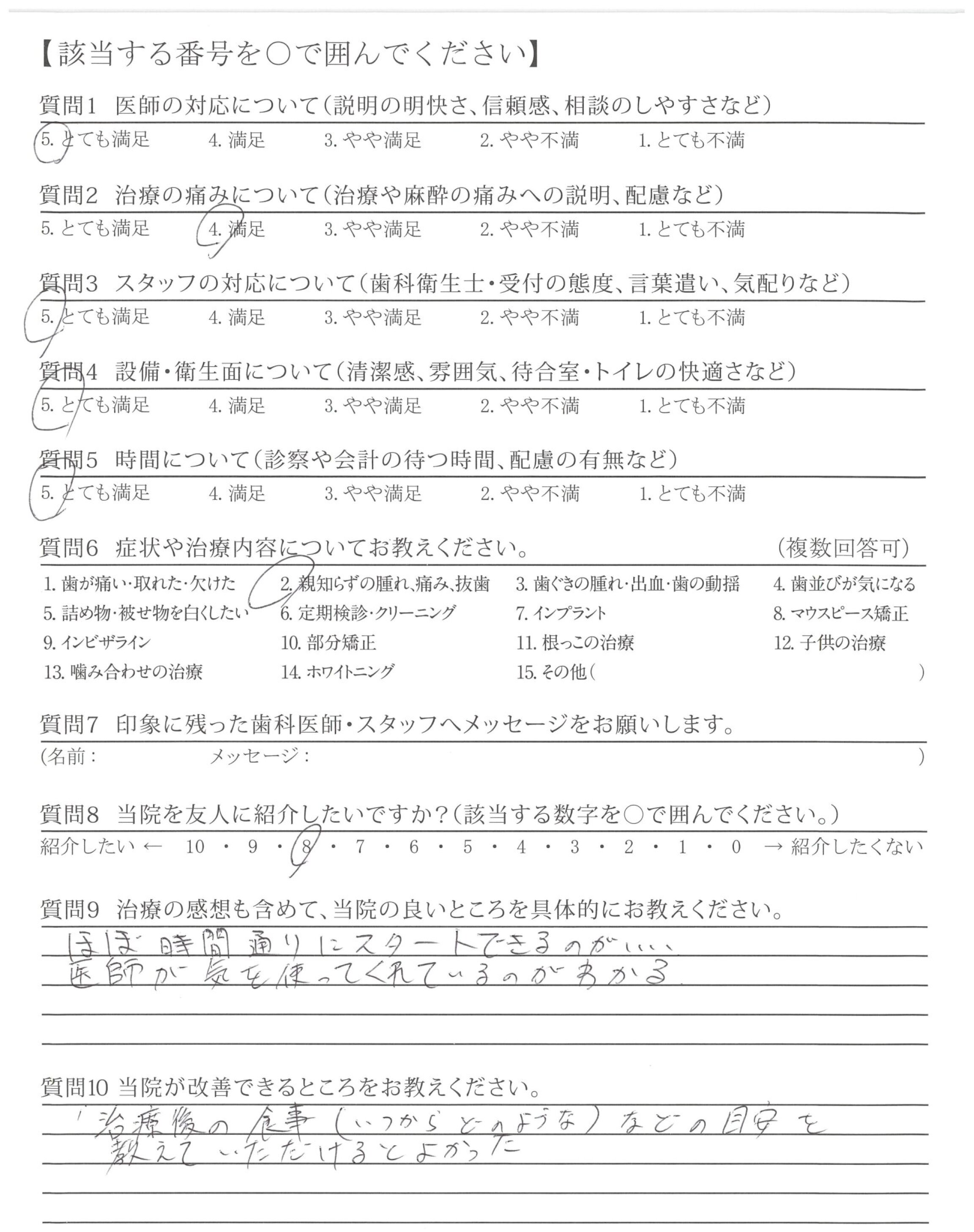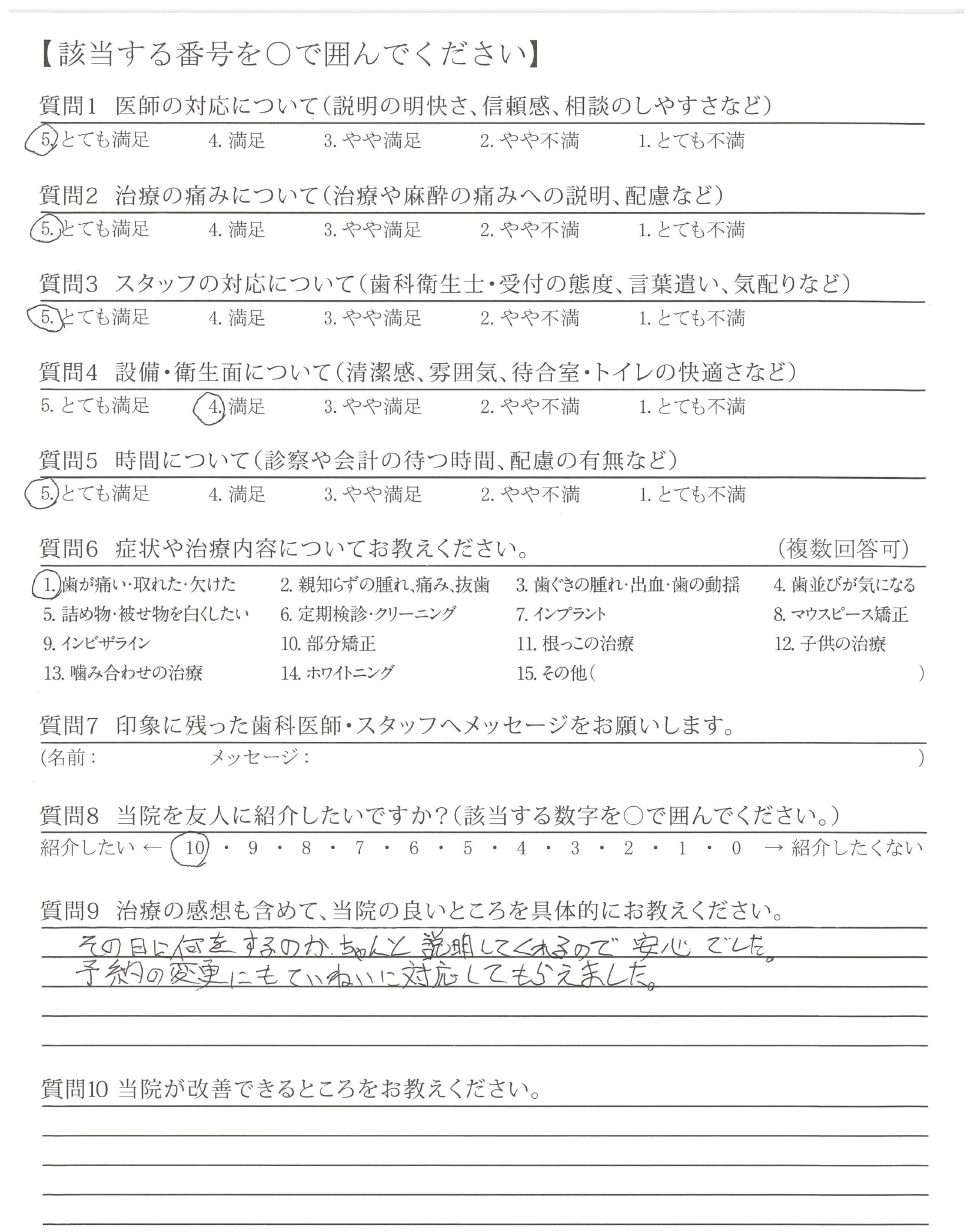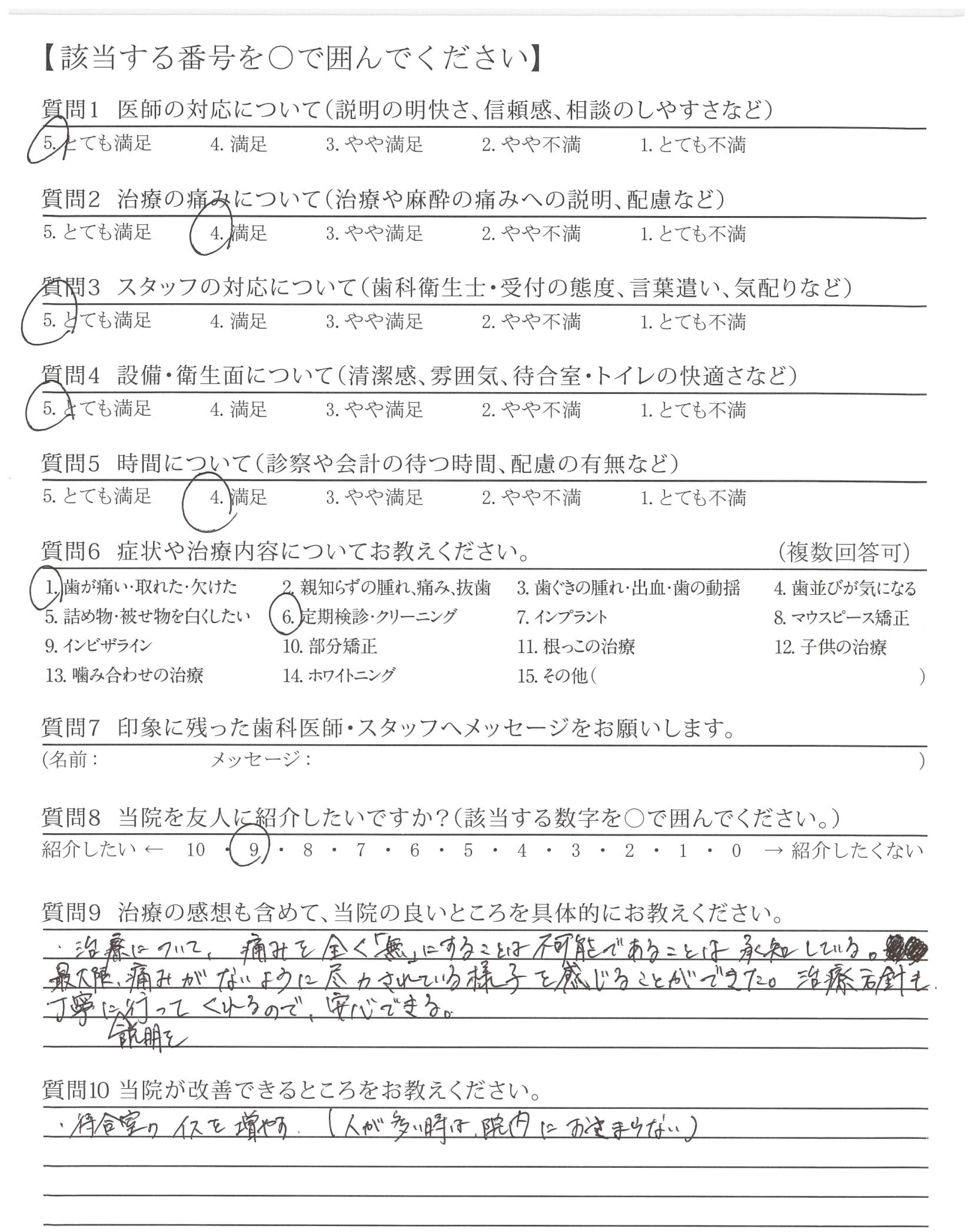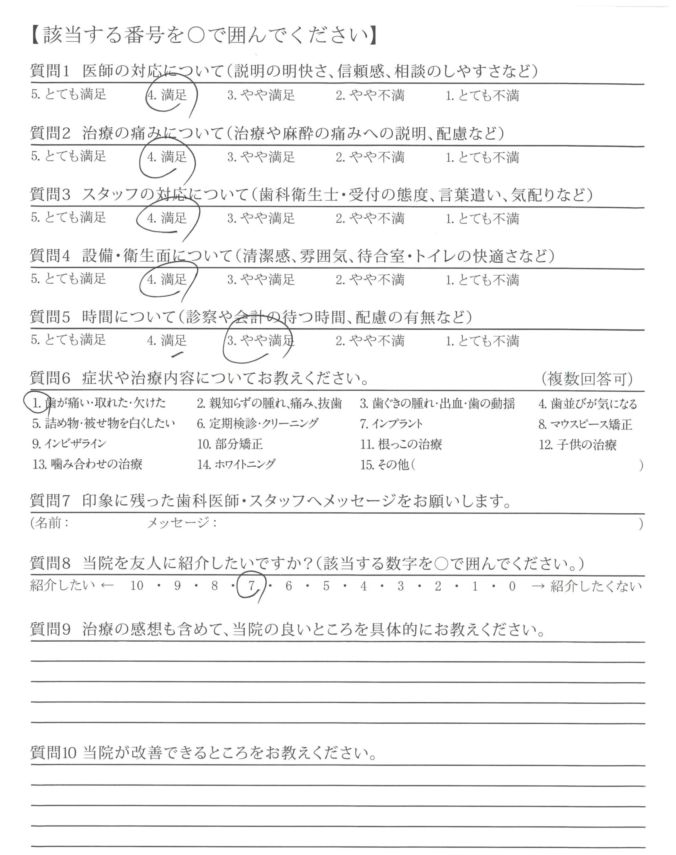 ・治療について、痛みを全く「無」にすることは不可能であることは承知している。最大限、痛みがないように尽力されている様子を感じることができた。治療方針も丁寧に説明を行ってくれるので、安心できる。