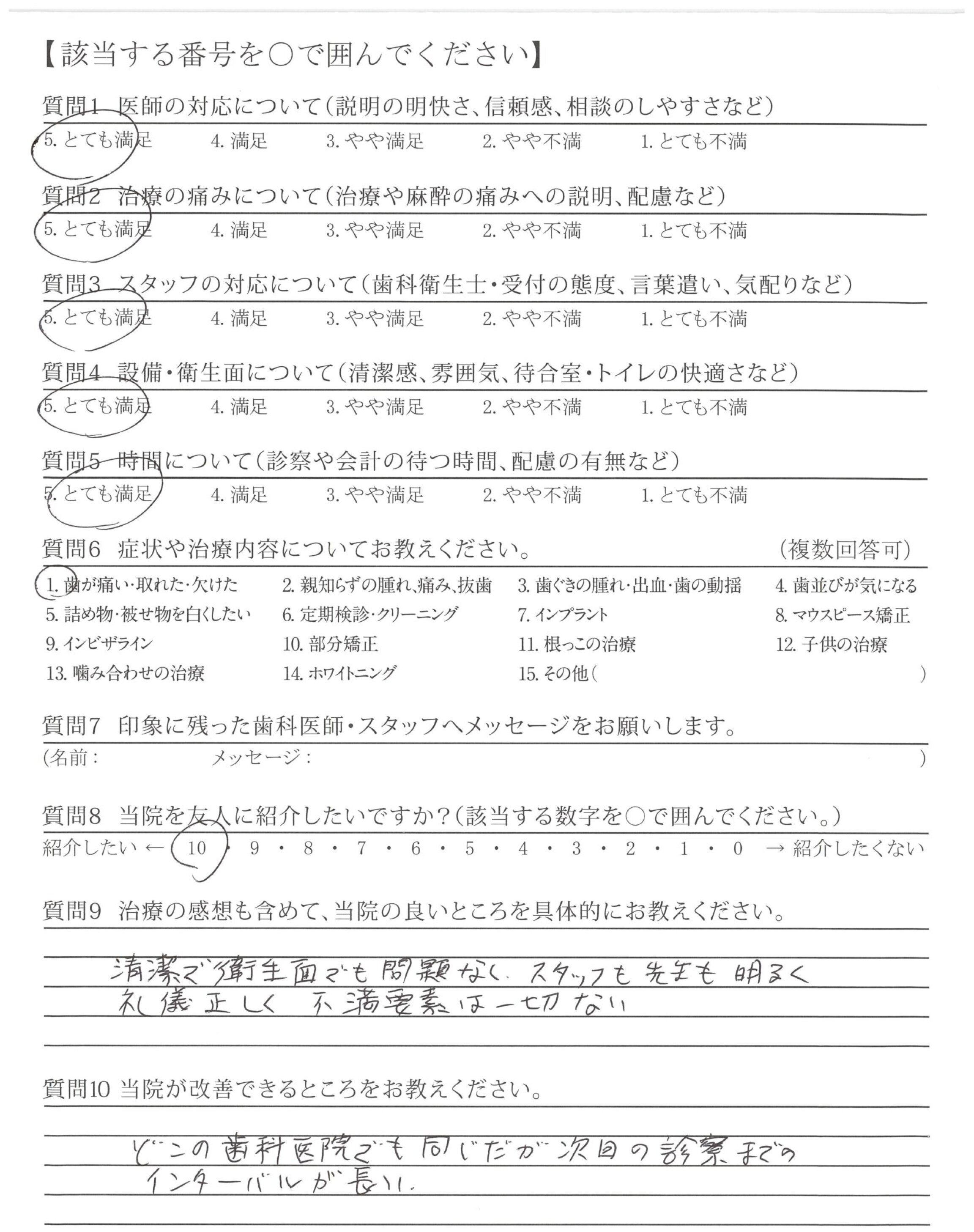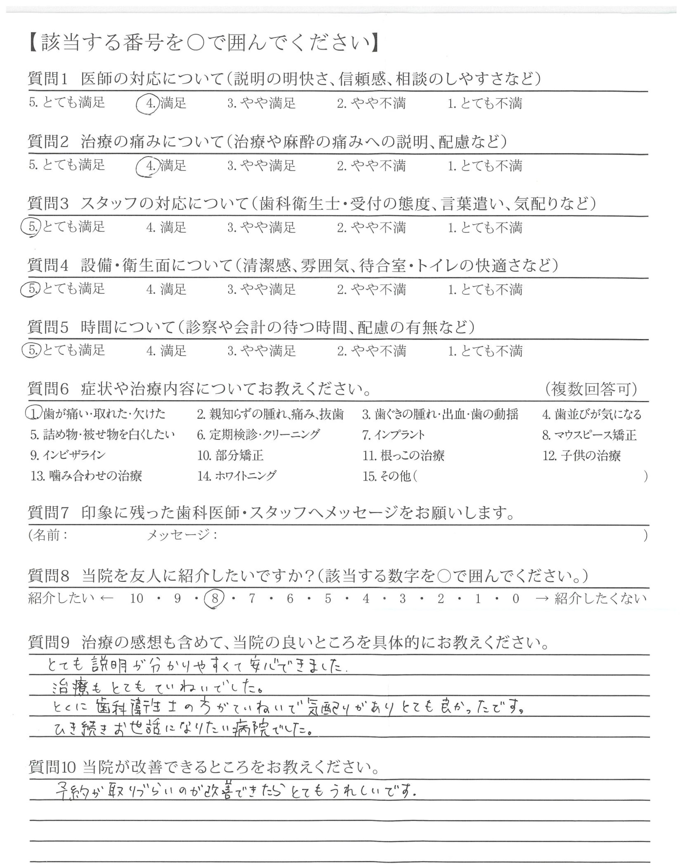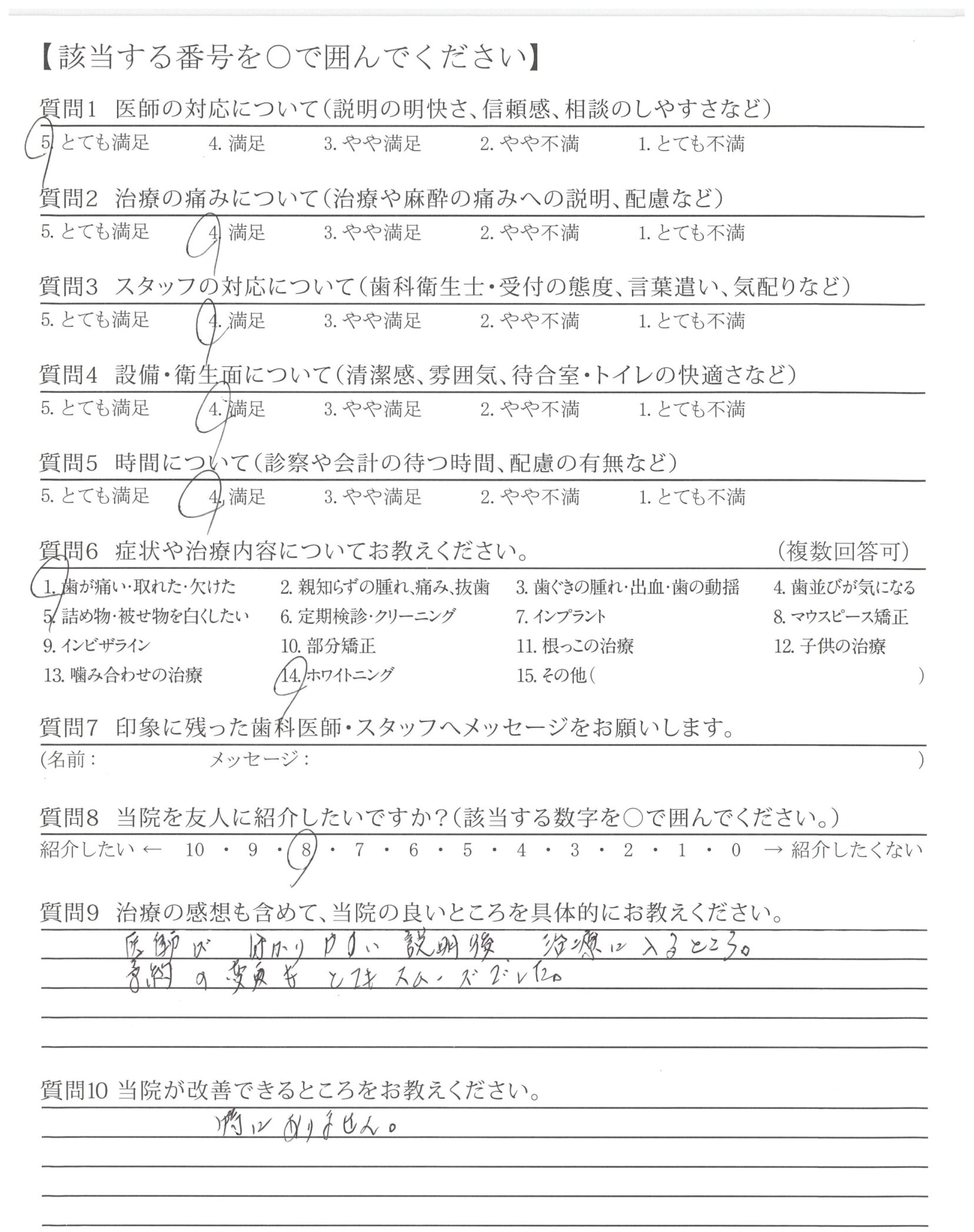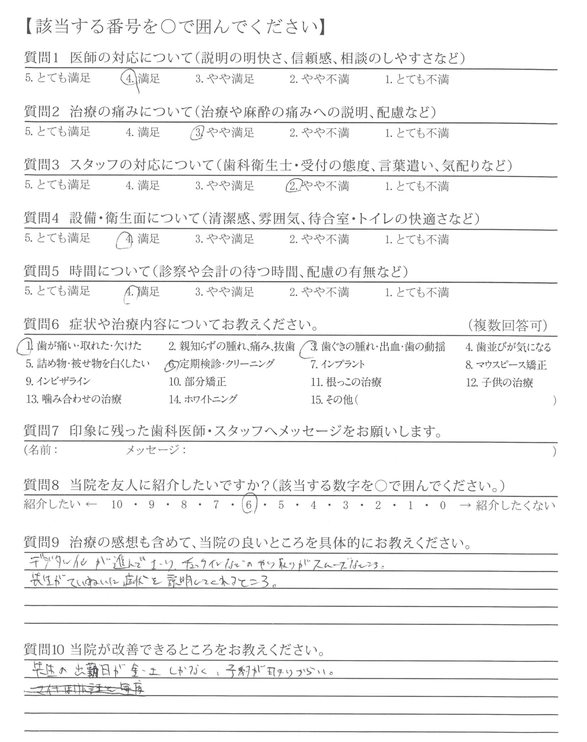 ・治療について、痛みを全く「無」にすることは不可能であることは承知している。最大限、痛みがないように尽力されている様子を感じることができた。治療方針も丁寧に説明を行ってくれるので、安心できる。