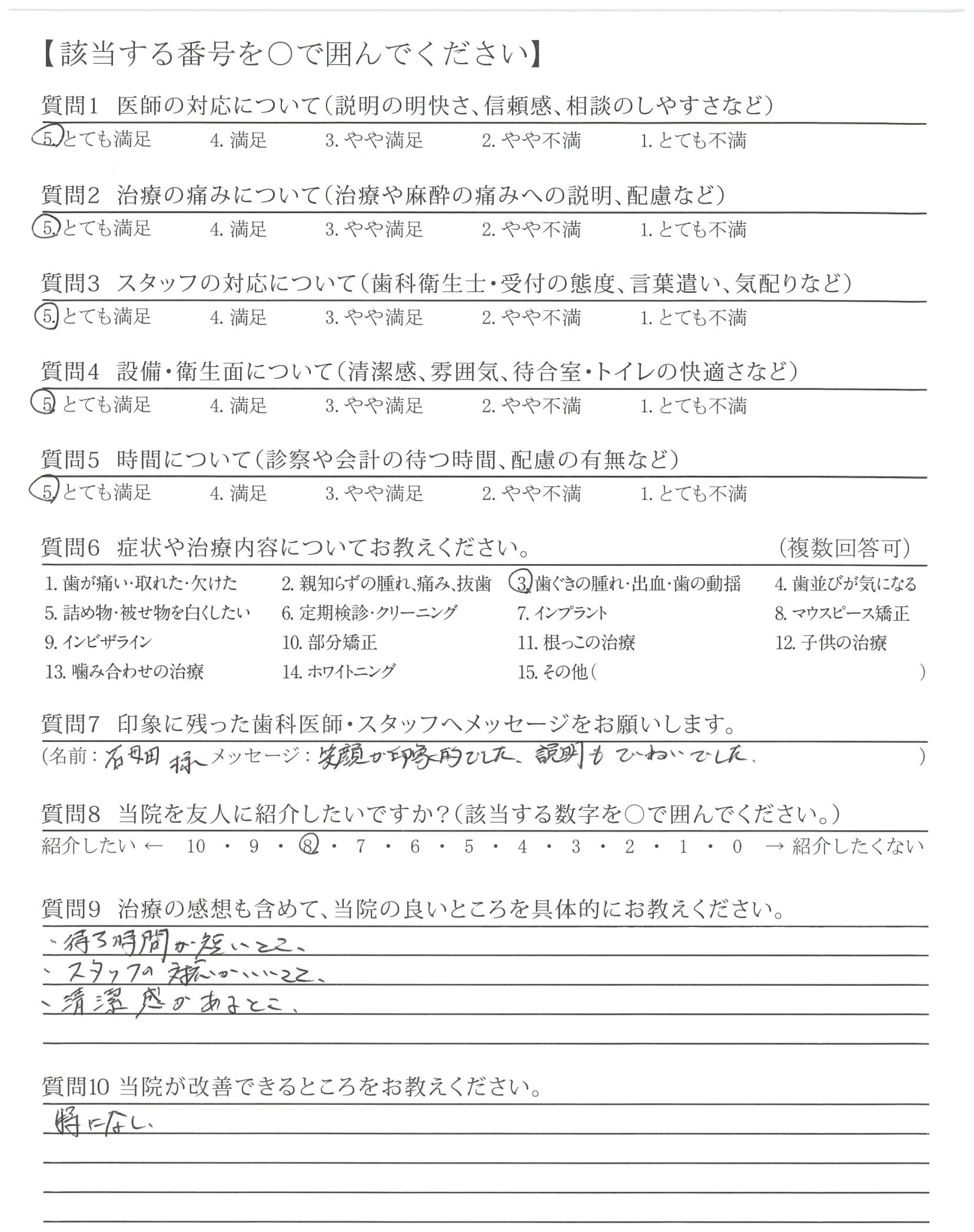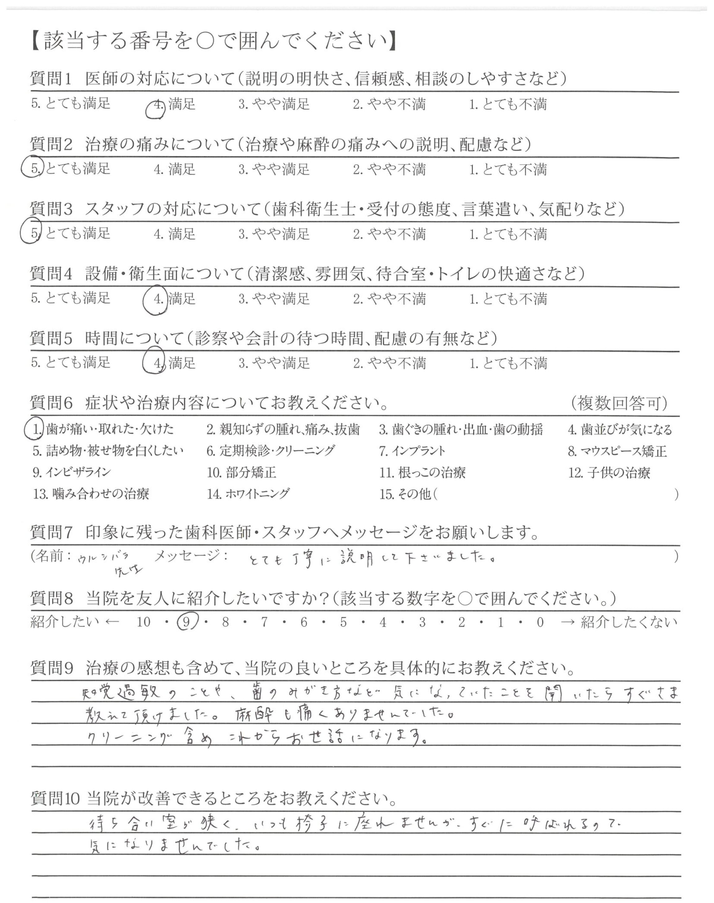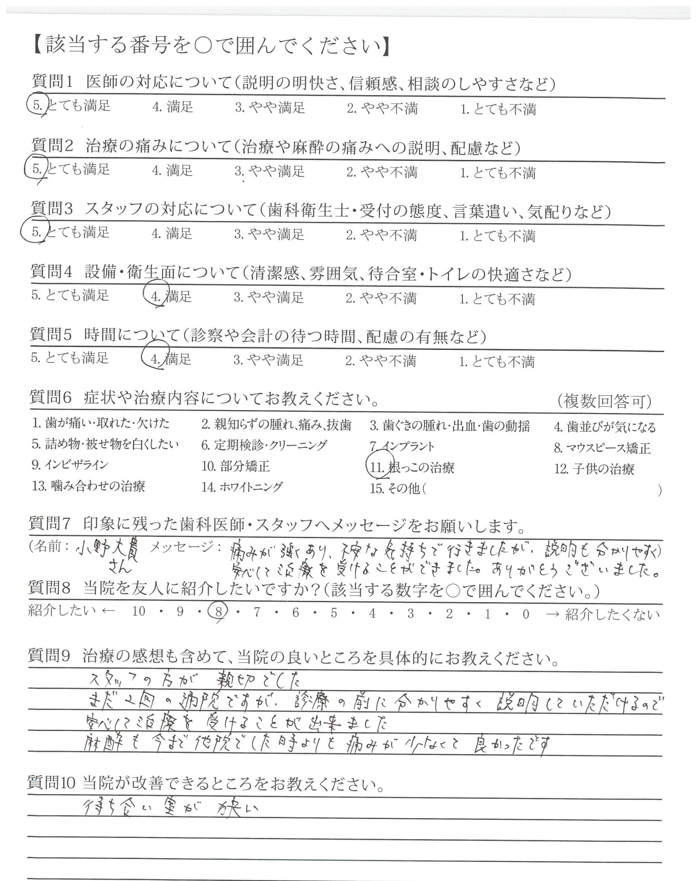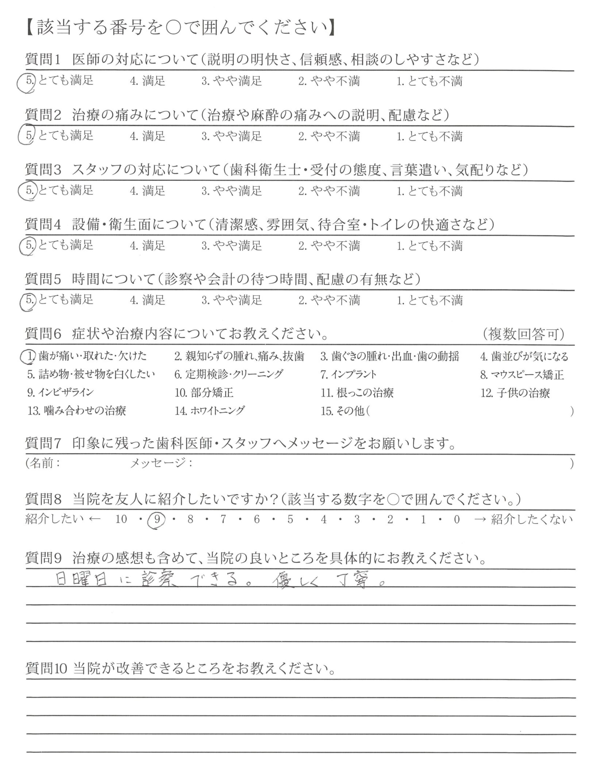 ・治療について、痛みを全く「無」にすることは不可能であることは承知している。最大限、痛みがないように尽力されている様子を感じることができた。治療方針も丁寧に説明を行ってくれるので、安心できる。