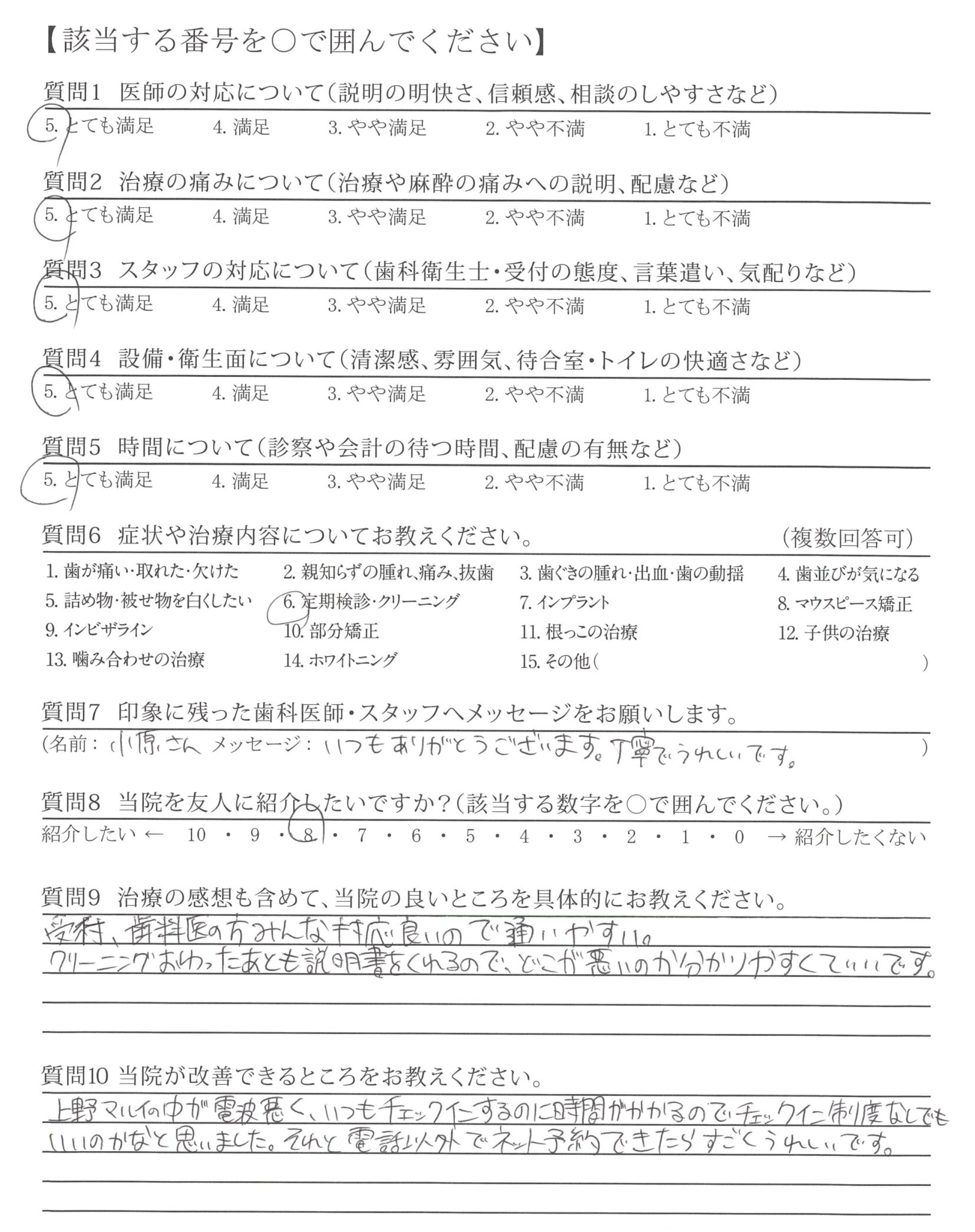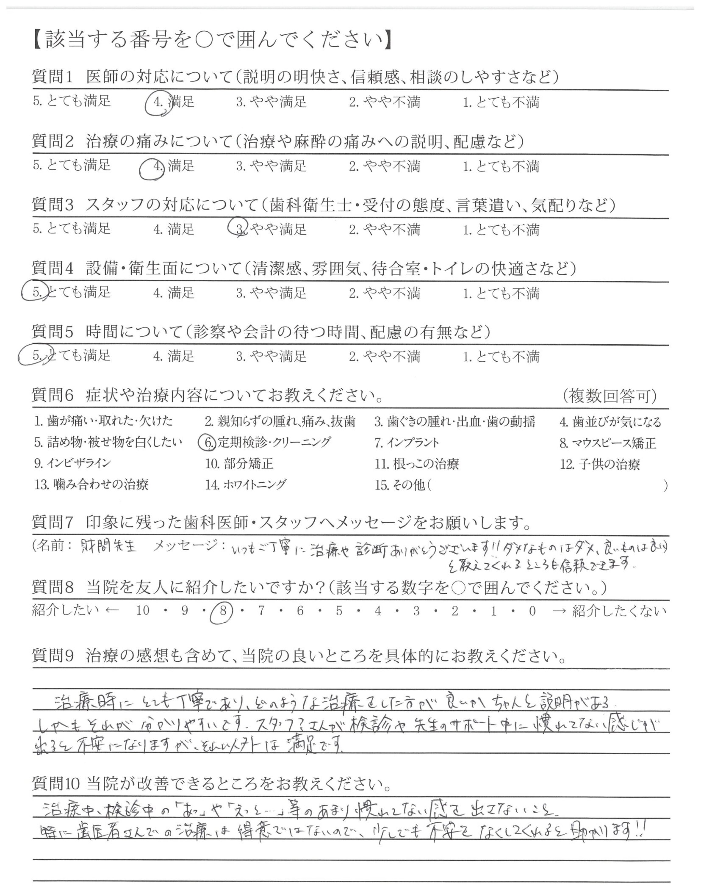 治療中、検診中の「あっ」や「えっと・・・」等のあまり慣れてない感じを出さないこと。特に歯医者さんでの治療は得意ではないので、少しでも不安をなくしてくれると助かります!!
