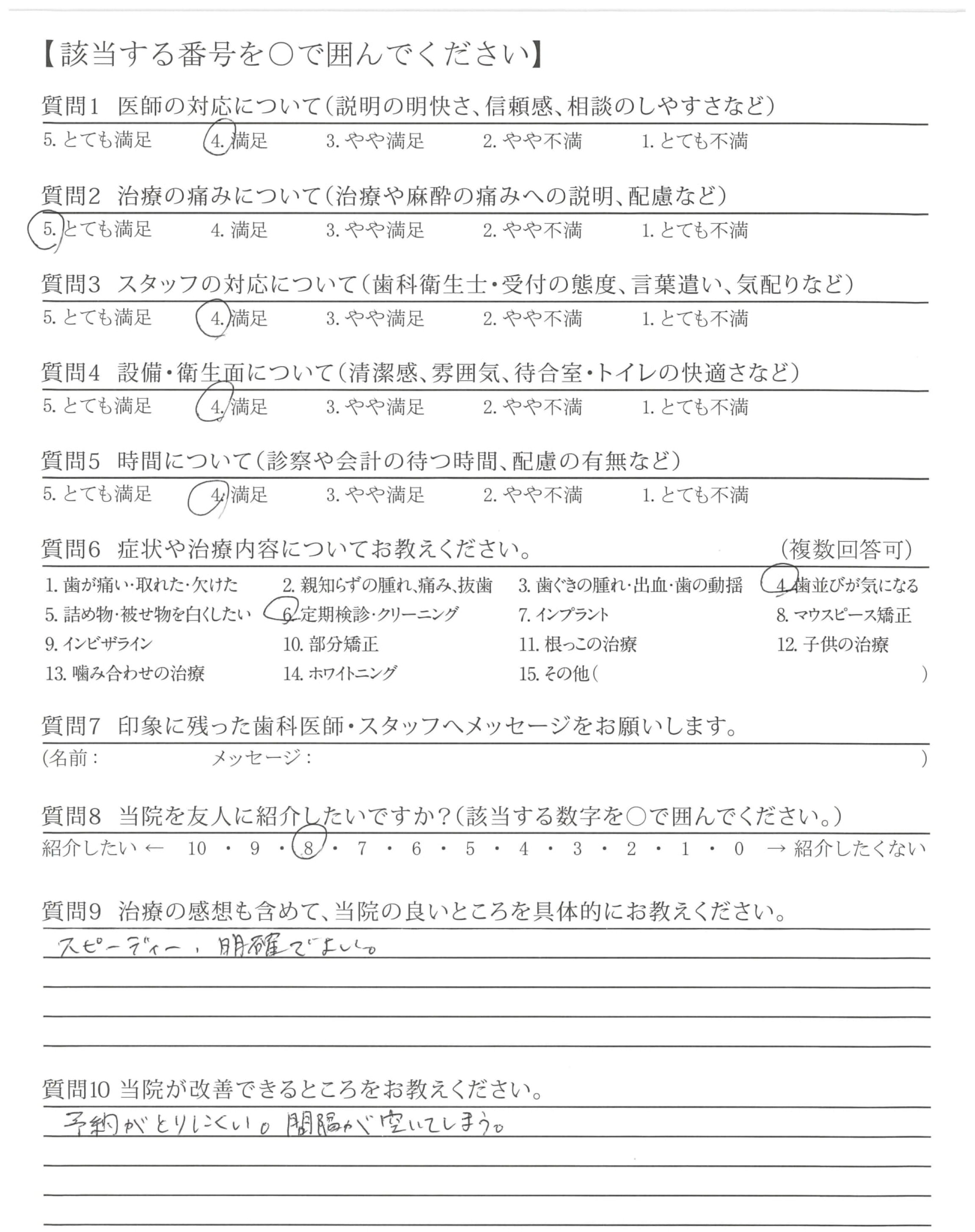 マウスピースを無してしまうことが多かったので、予約のとりずらさが、改善できたらもっとスムーズに治療できたと思いました。