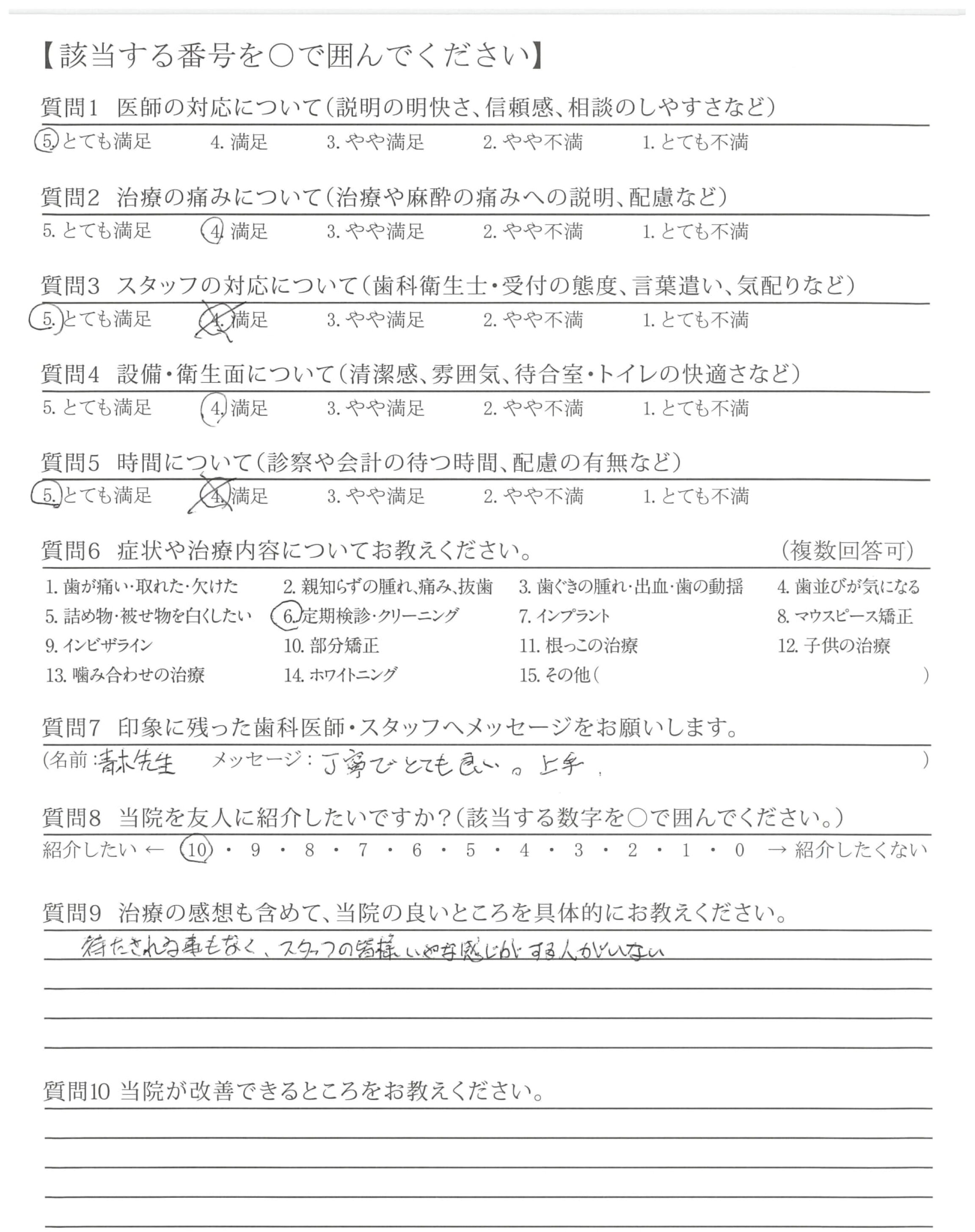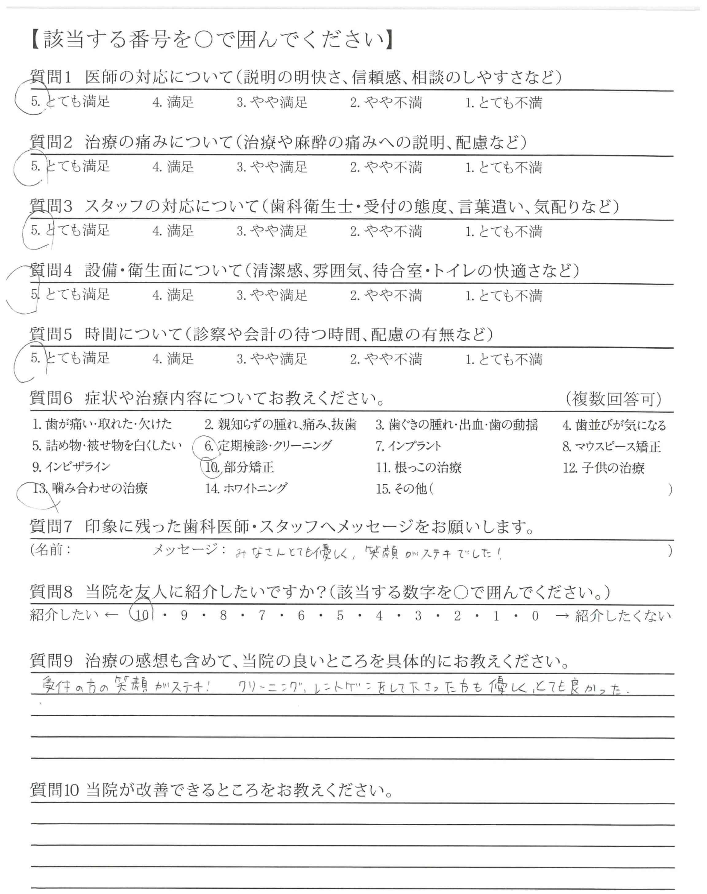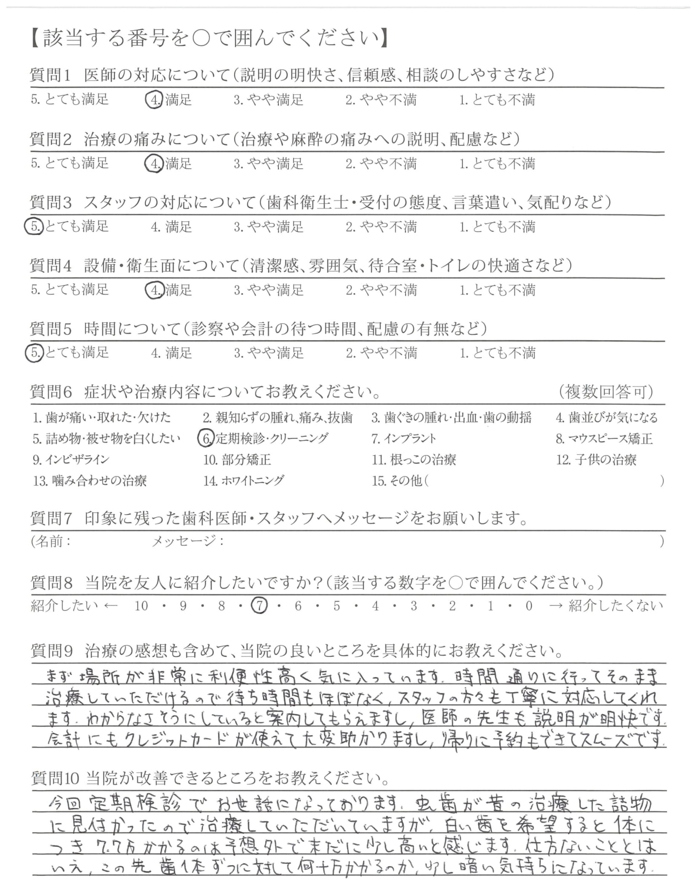 医師には満足していますが、忙しい雰囲気です。もう少し余裕が感じれるとさらに良いです。