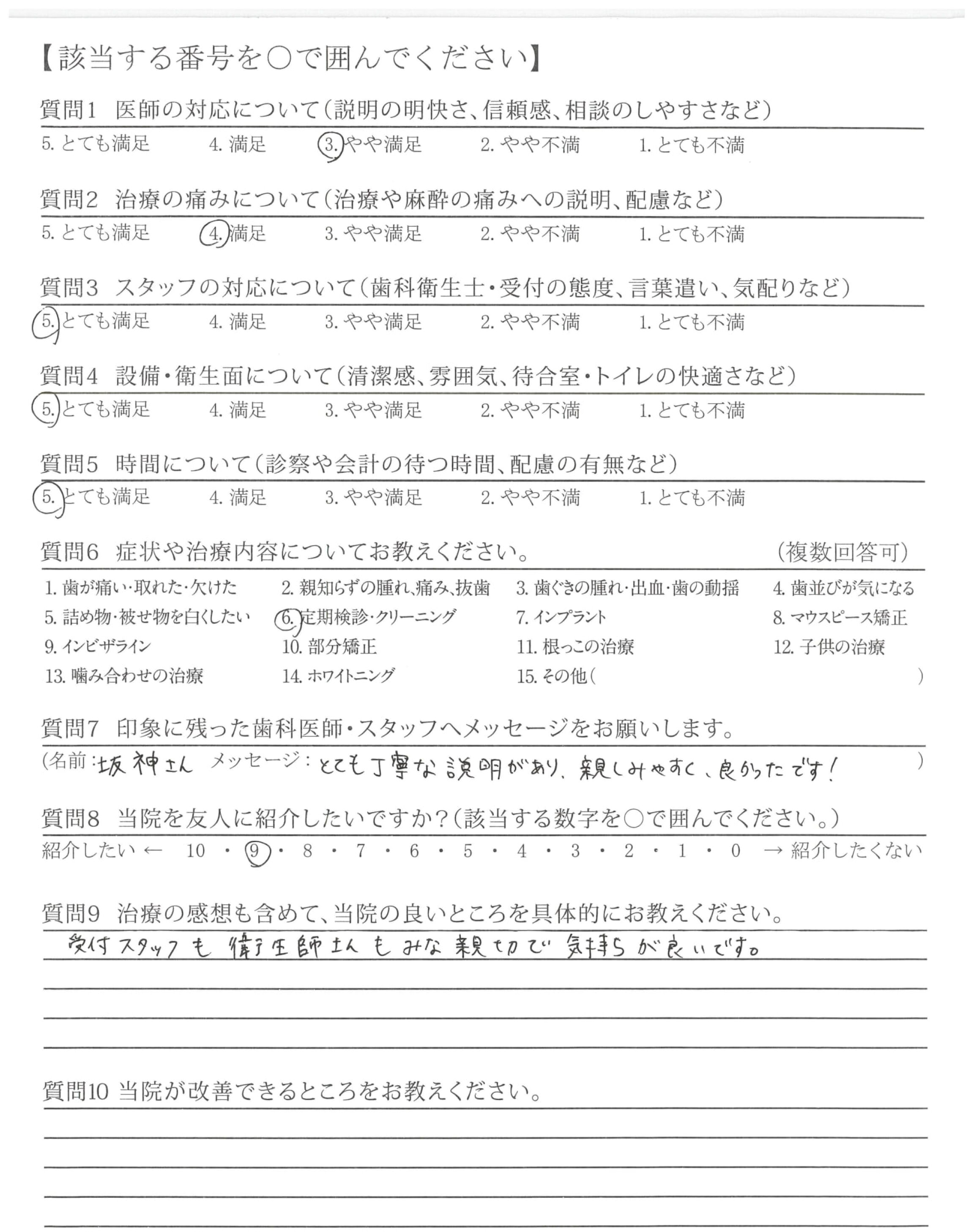 受付の方、衛生士さん、先生も感じが良く、こちらのささいな質問にもしっかり答えていただいたり安心感がありました。今後も通いたいと思います。