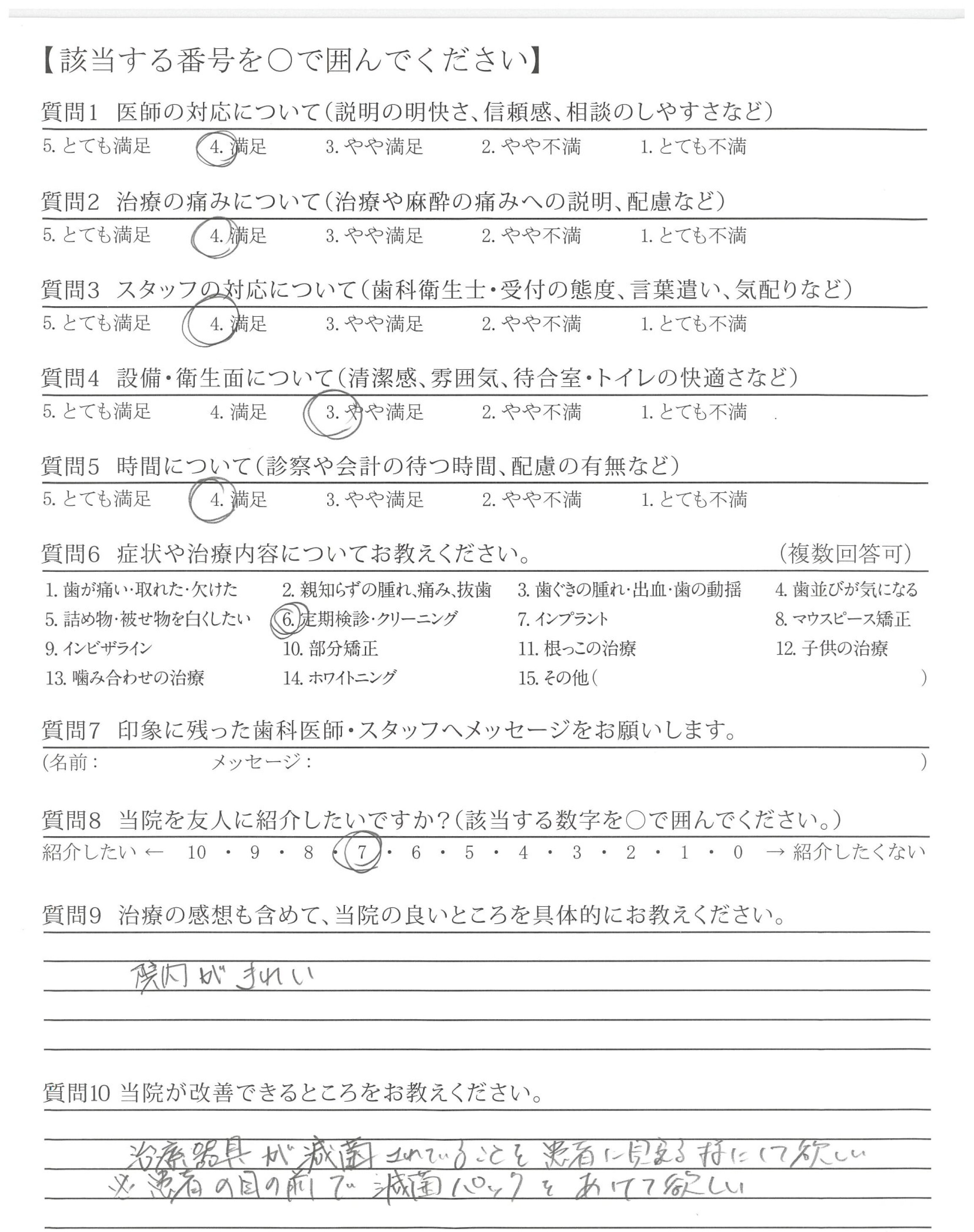 治療の前にカウンセリングがあるため、不安な点や気になっている箇所について相談をすることができる点が良い。手術をする際にタオルを顔にかけてくれるため、安心感があり、痛い時は施術を一時中断してくれる点が患者に配慮していて良いと感じた。