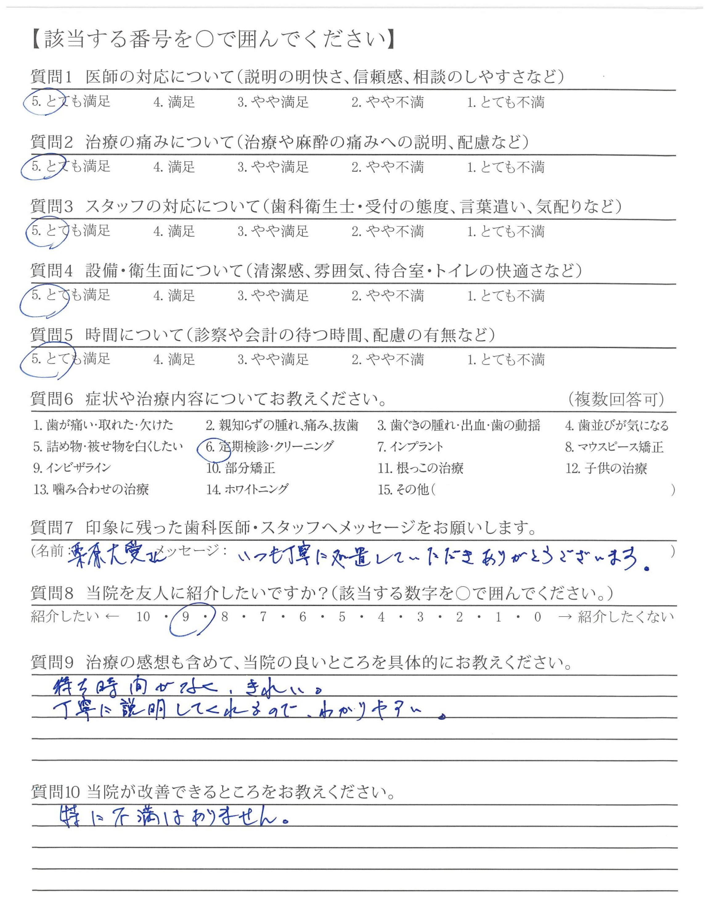 治療の前にカウンセリングがあり、説明もわかりやすい。治療についても、不安は感じず、作った入れ歯は毎回適切になるまで修正してくれて本当にありがたいです。