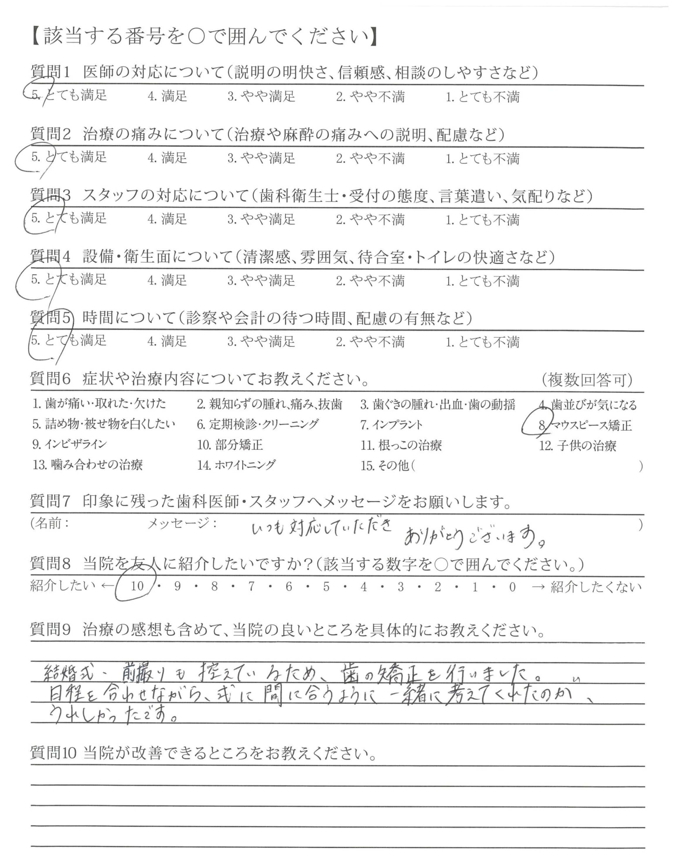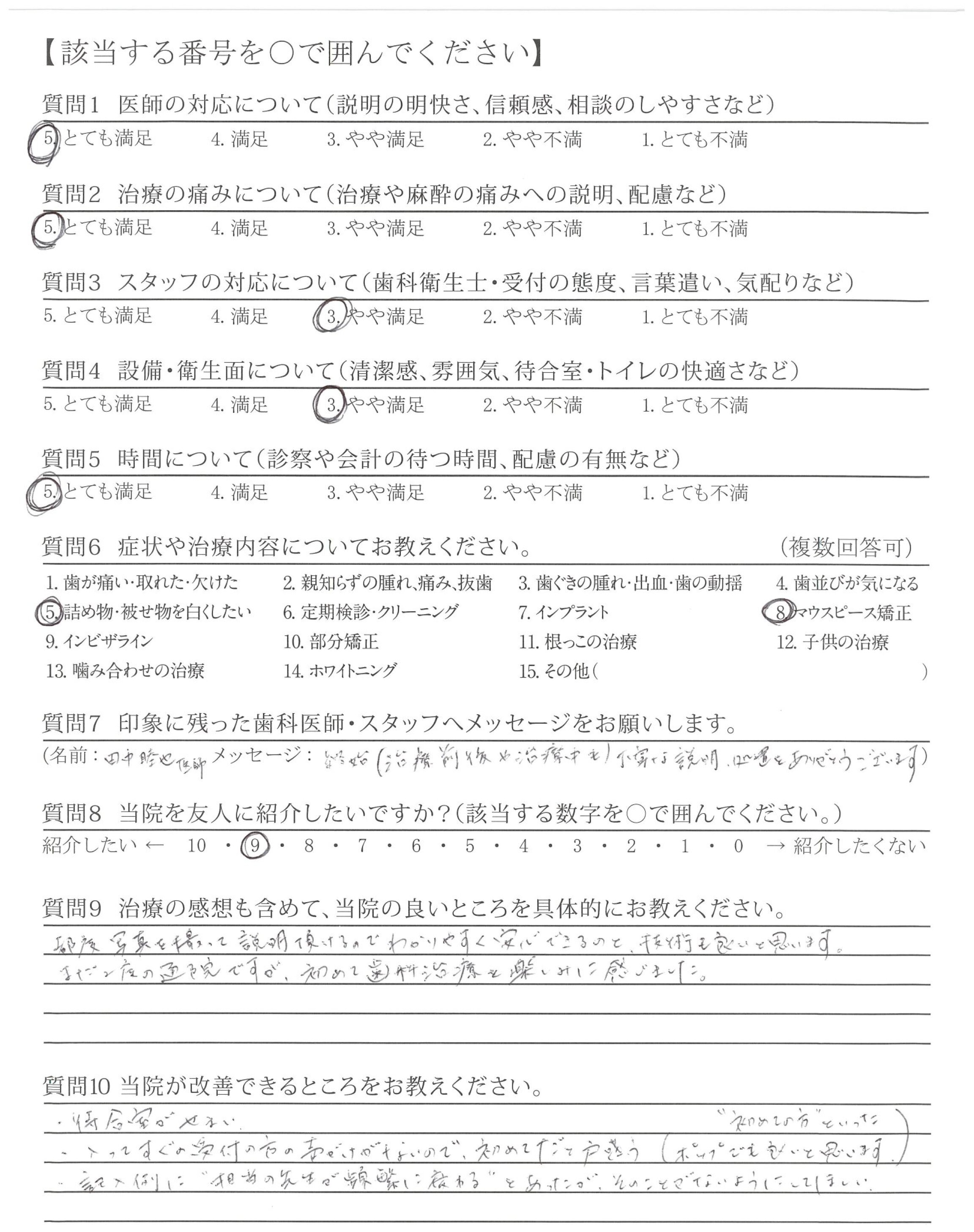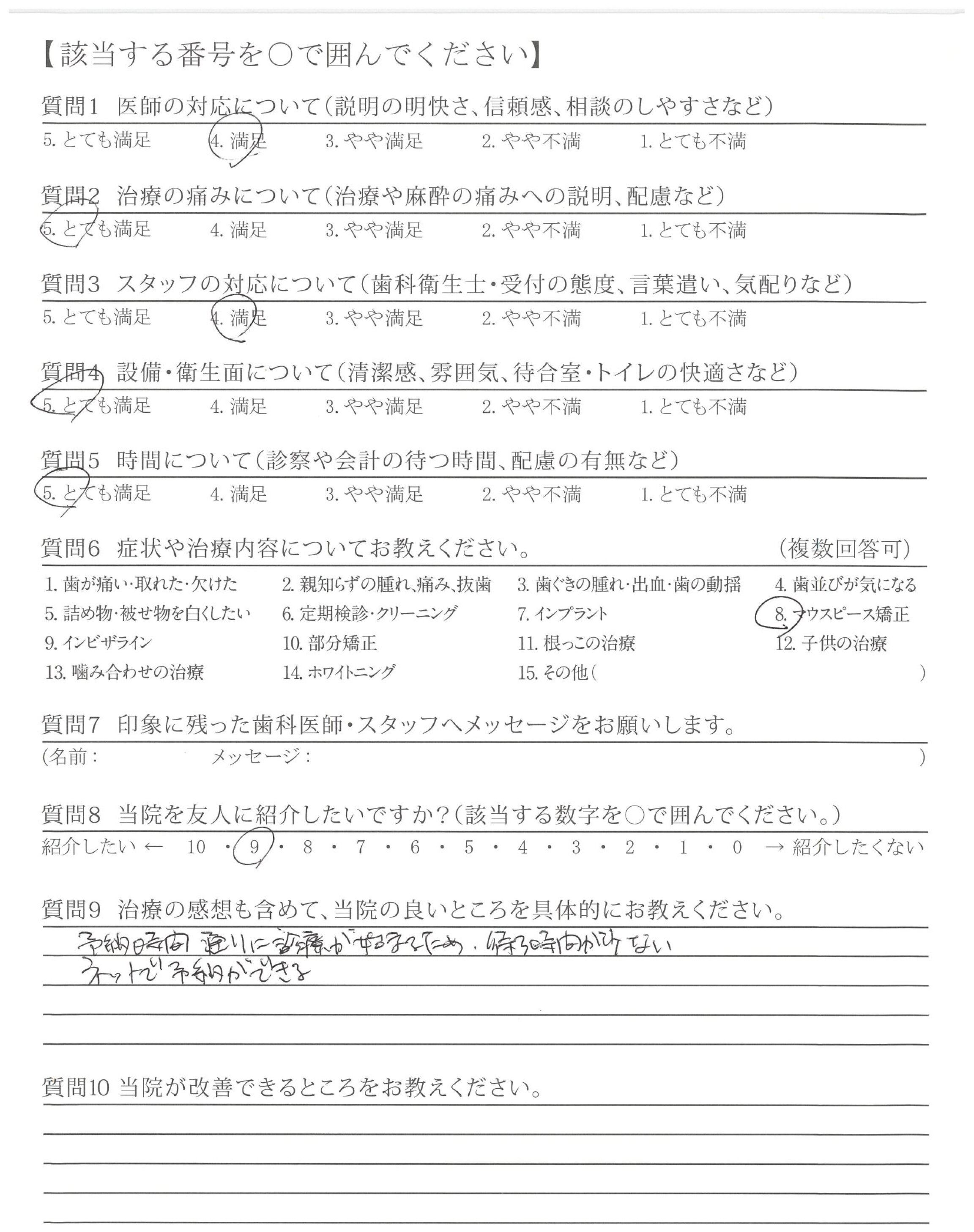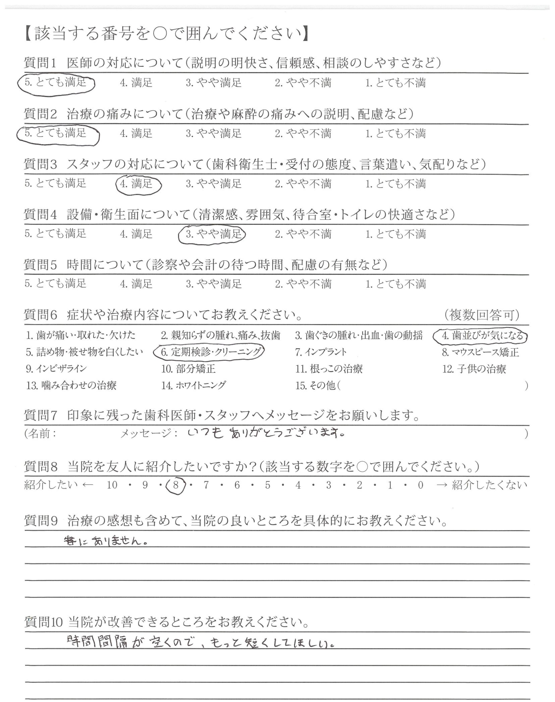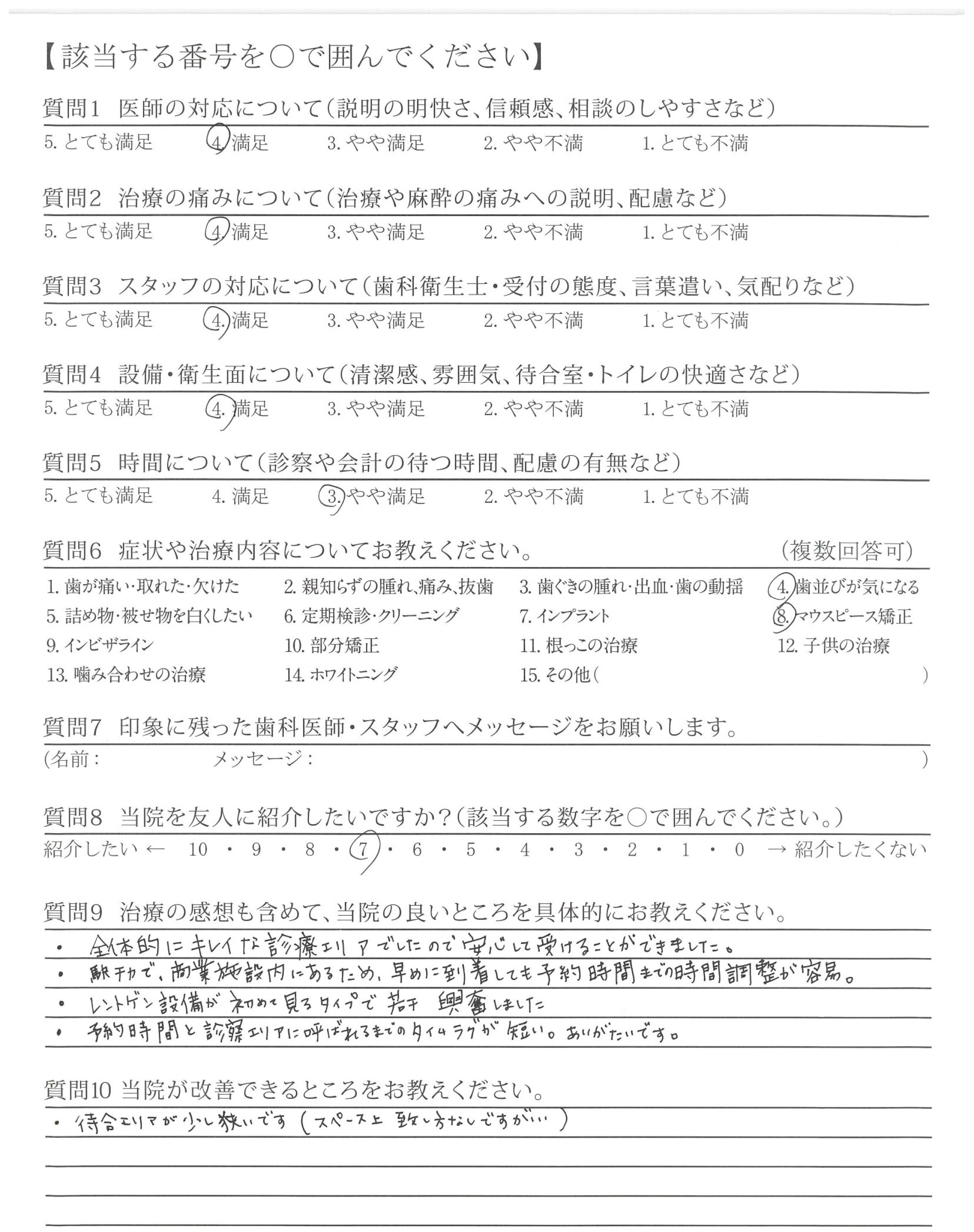 今のところ改善して欲しいところはないが、しいて上げるなら矯正だけかもしれないが次の予約を取ろうとする時、だいぶ先まで空がないこと。